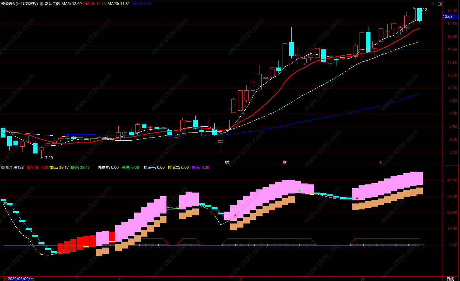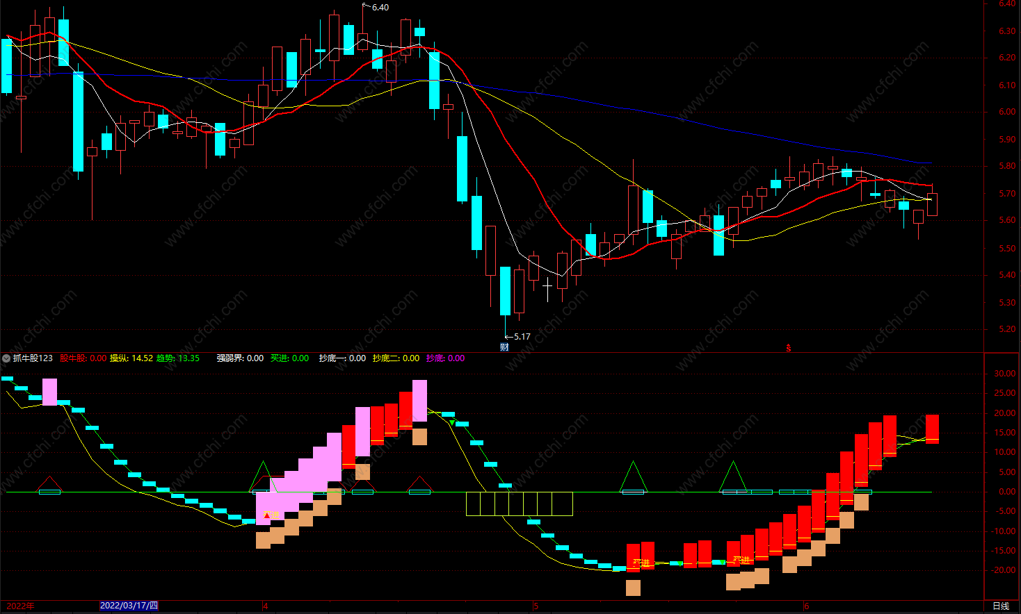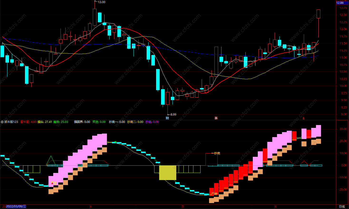 比MACD超前1-2天,中线下方呈现黄色小方块时重仓出击,1-3天内根基有收获,同时呈现赤色箭头,那就砸锅卖铁吧,中线上方的3种颜色小短柱代表顶部3种技能背离.抓强股