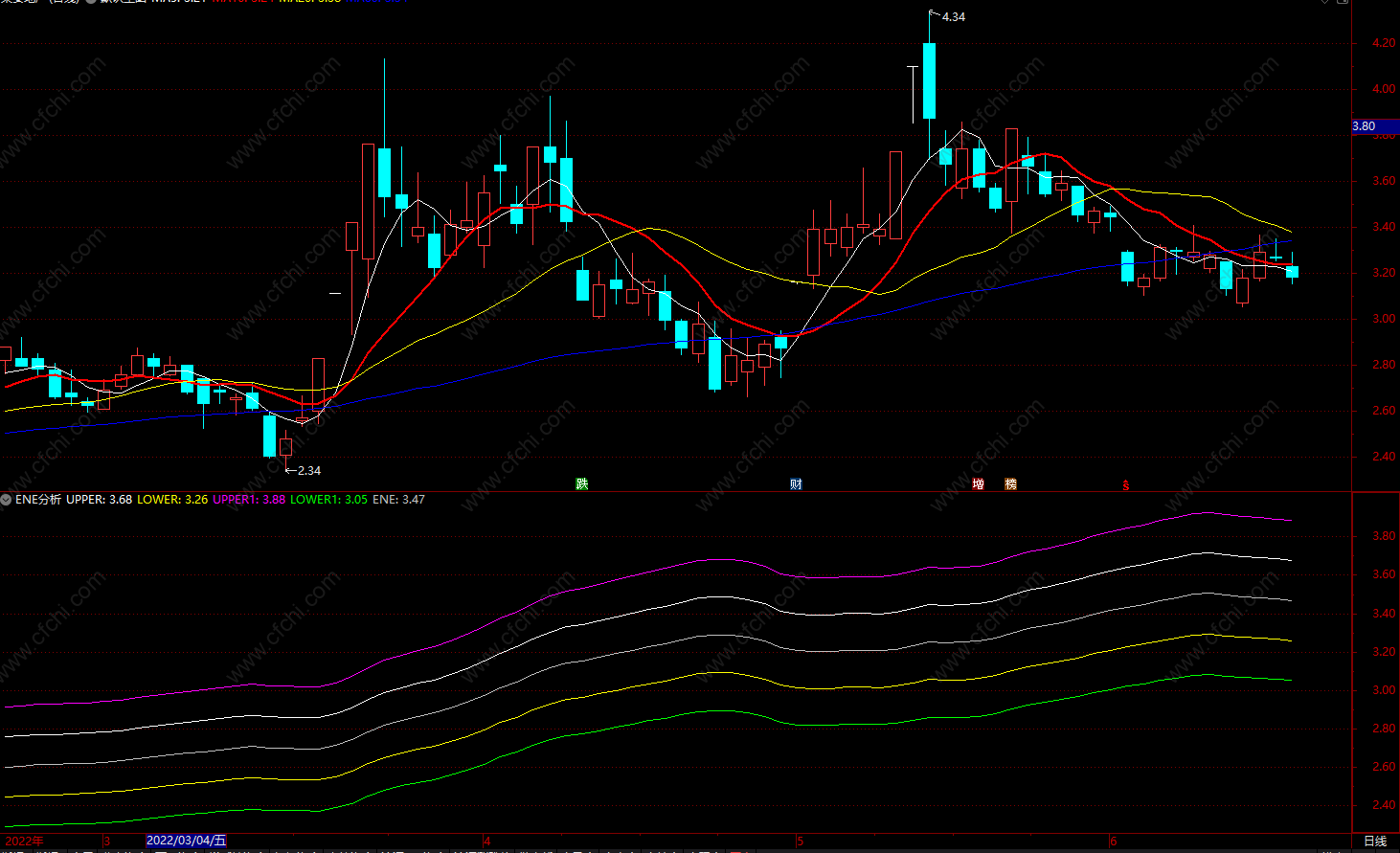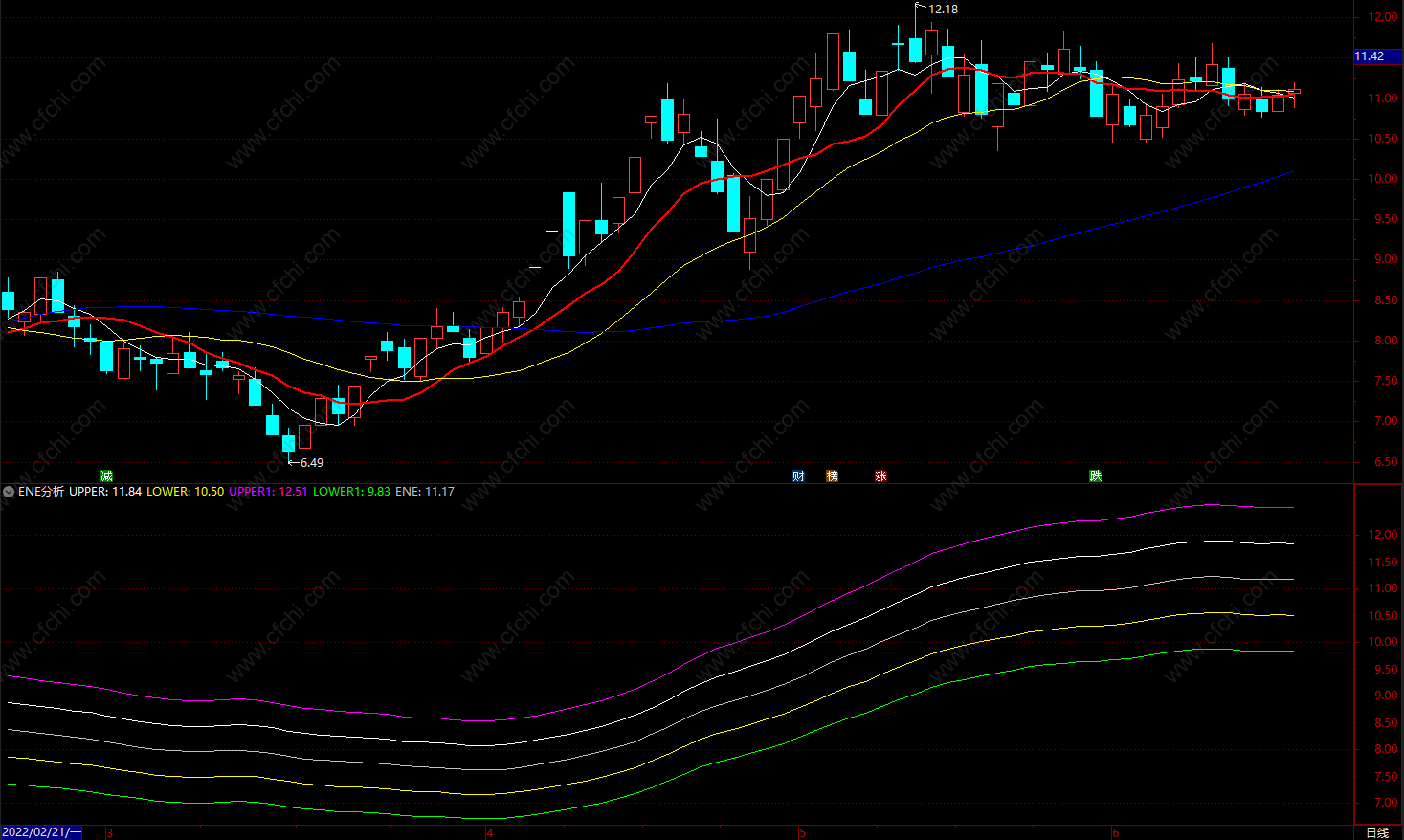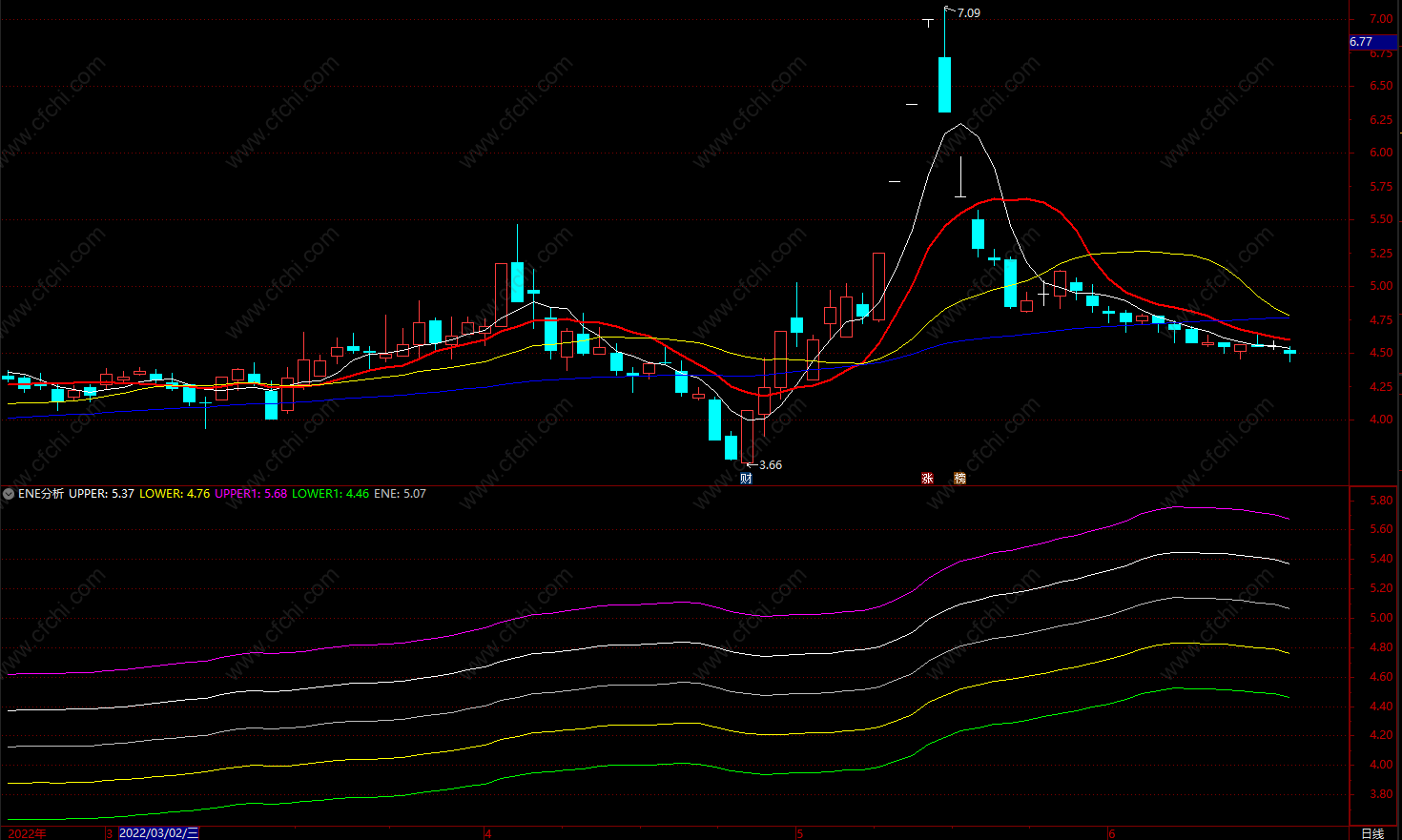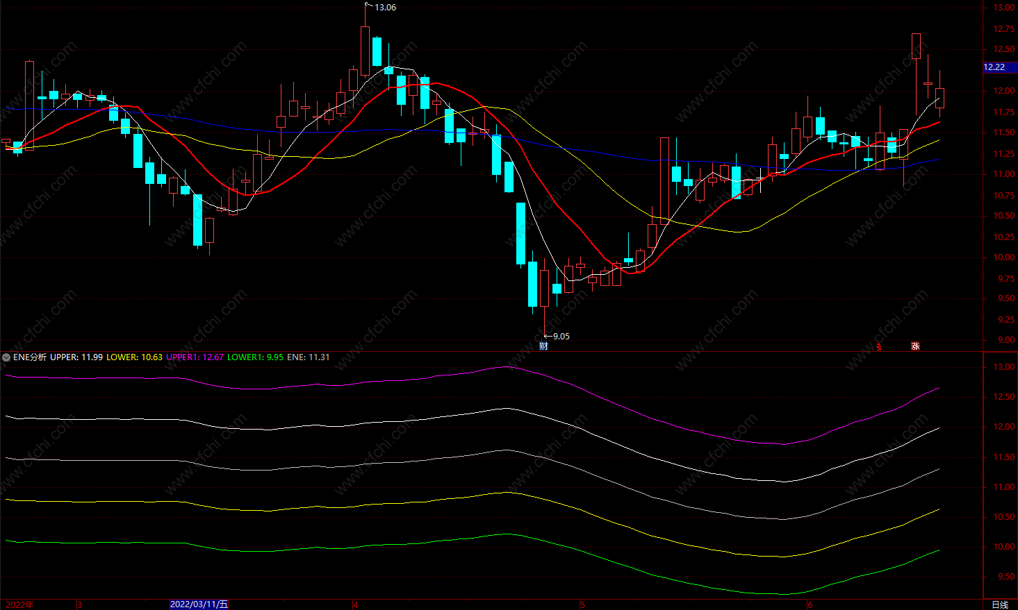 4、底部的上行ENE,如果股价上涨穿越上轨线后,很快掉头下跌并跌穿上轨线时可以卖出。