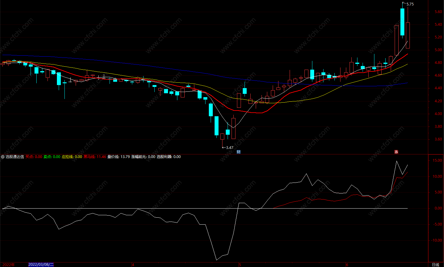 黑马线: IF( VAR28>0.1,VAR29,0)*5, colorred;