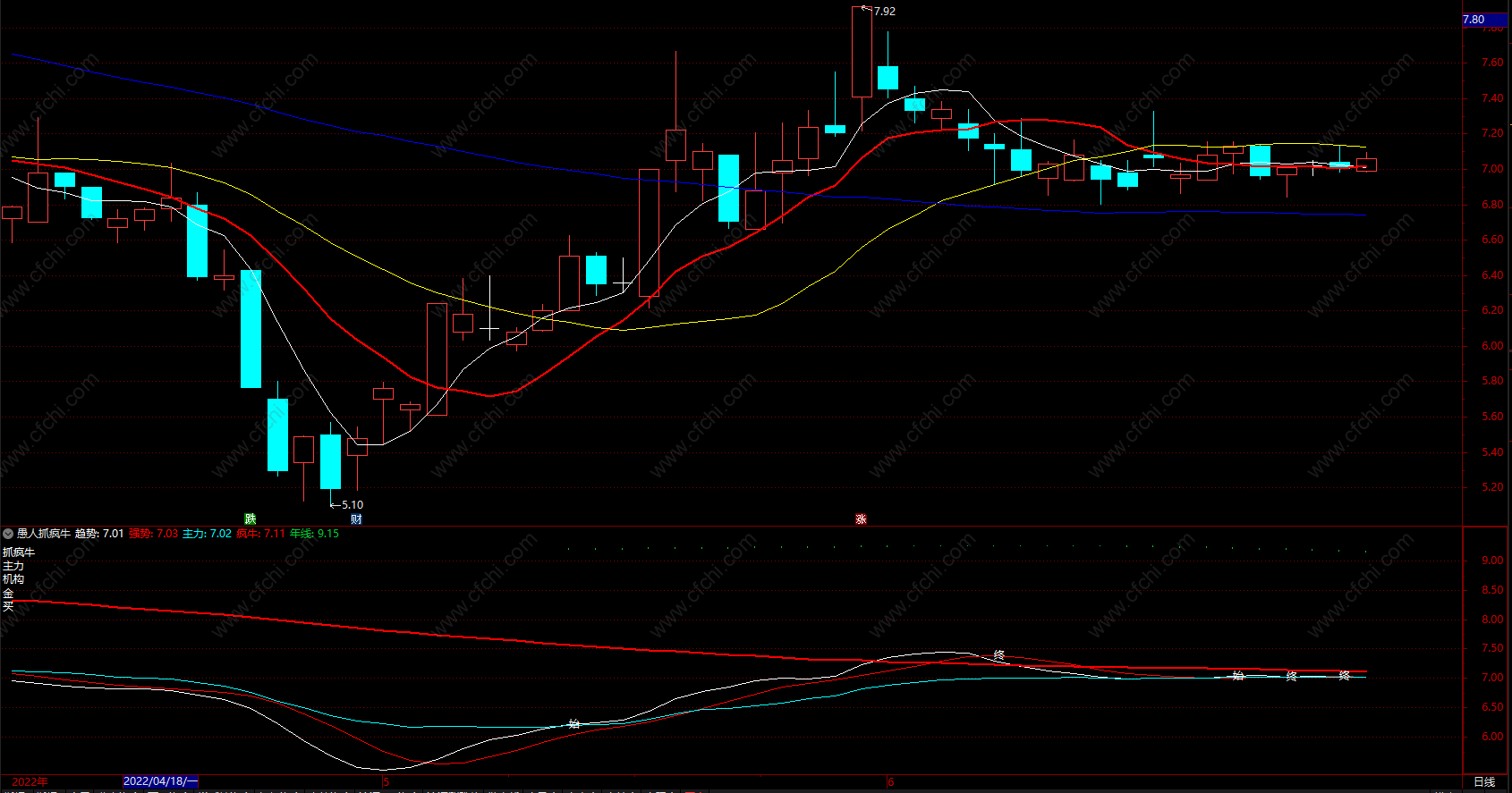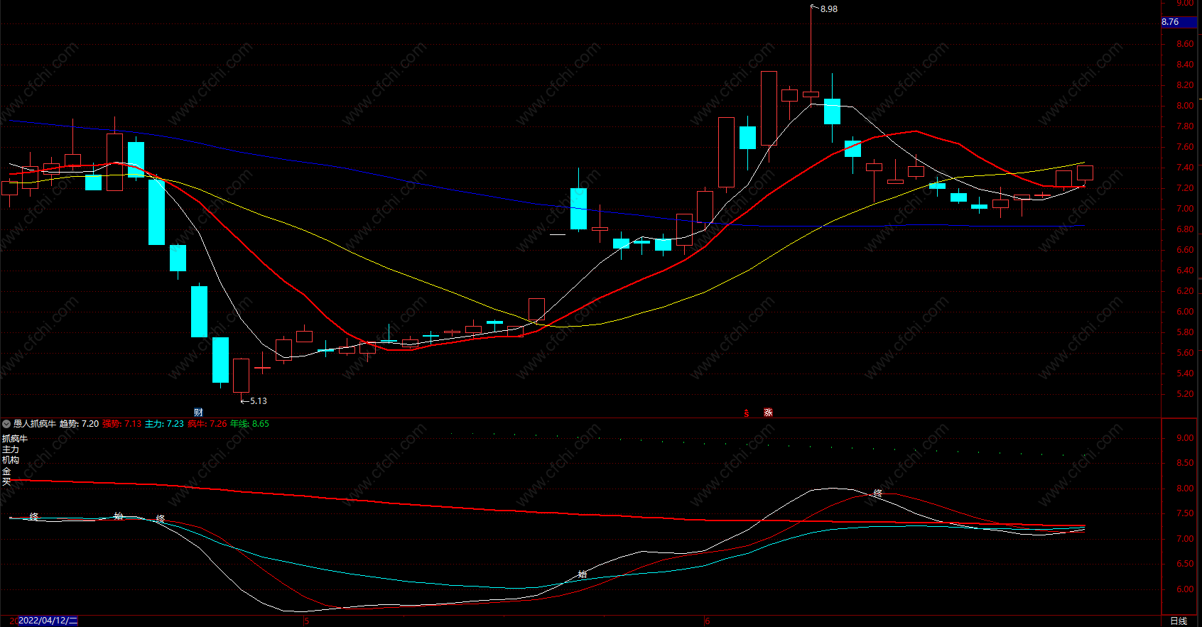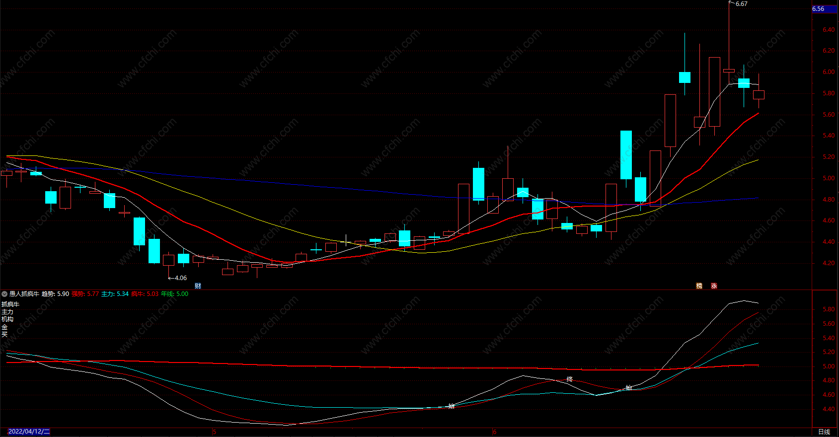 趋势黄线还没有站上疯牛线率先放量不是买入的好时机,很可能是空头陷阱,只有当趋势黄线站上疯牛线且同时温和放量才是真正意义的中级行情的开始,中间回试或洗盘调整以趋势黄线金叉强势线或强势线金叉主力线为再次介入的时间节点,技术好的可以使用小级别周期操作,比如60F或者120F。