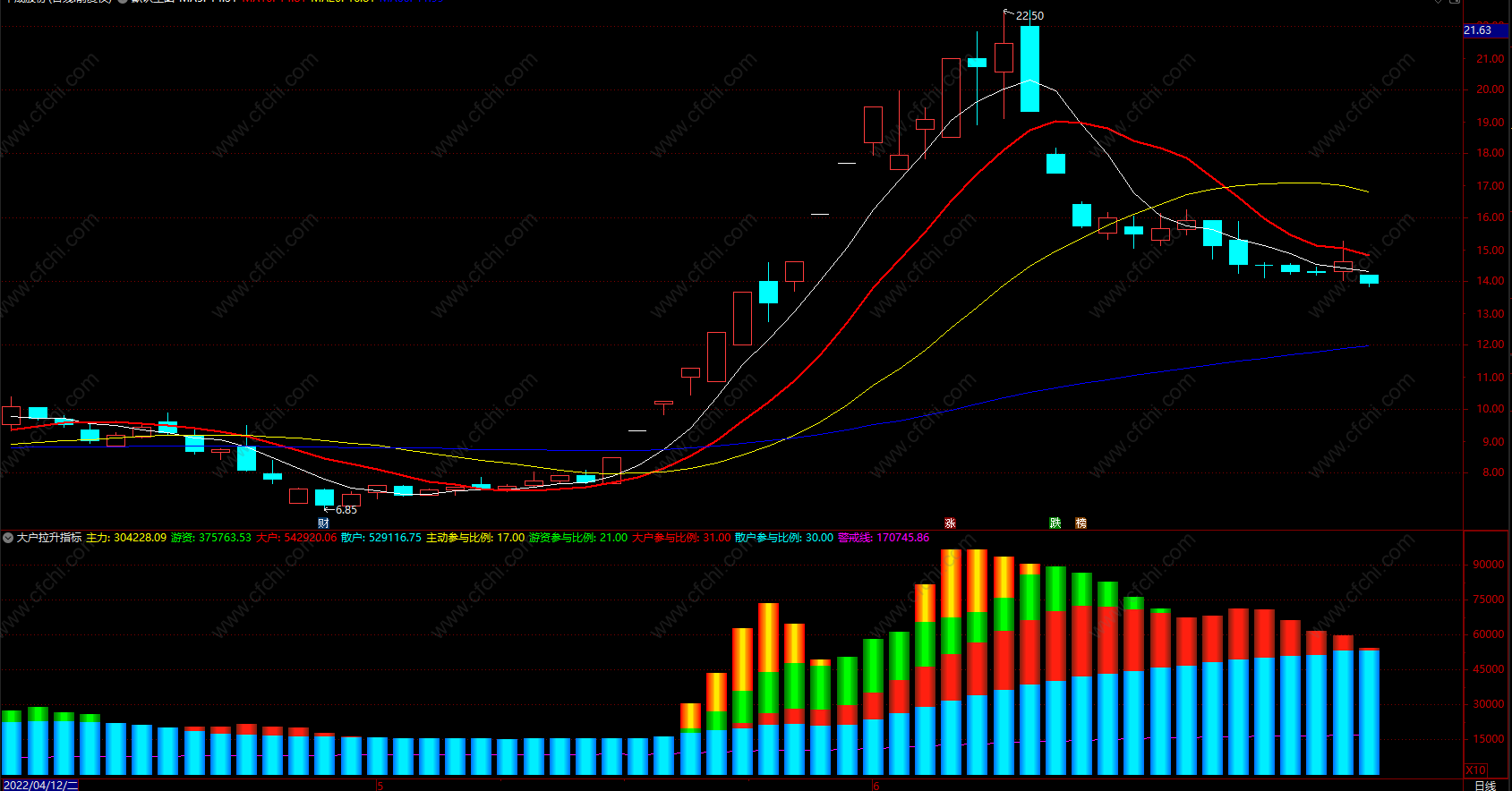 散户参与比例:ROUND(((散户 / (((主力 + 游资) + 大户) + 散户)) * 100)),NODRAW,COLORFFFF00;