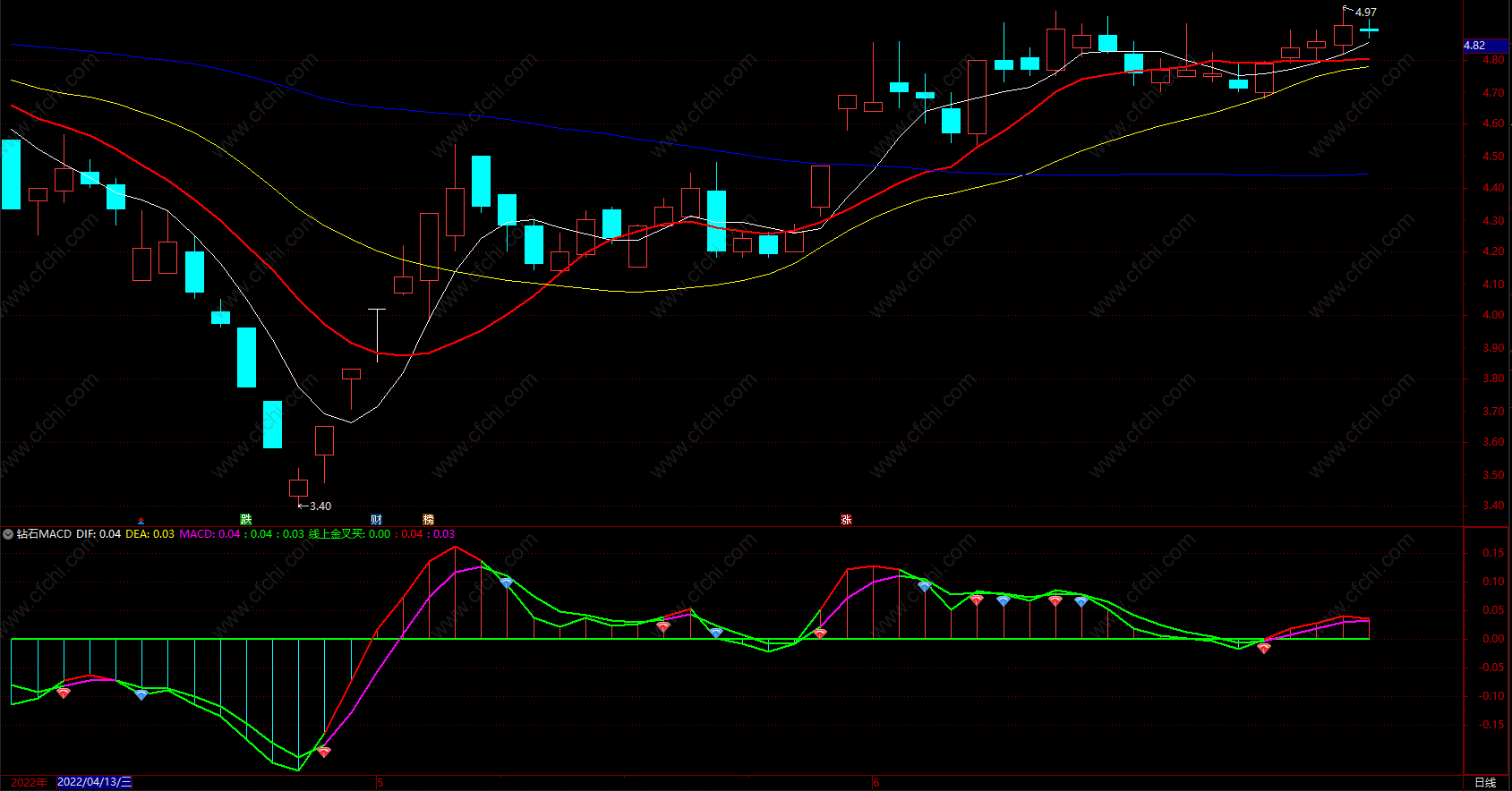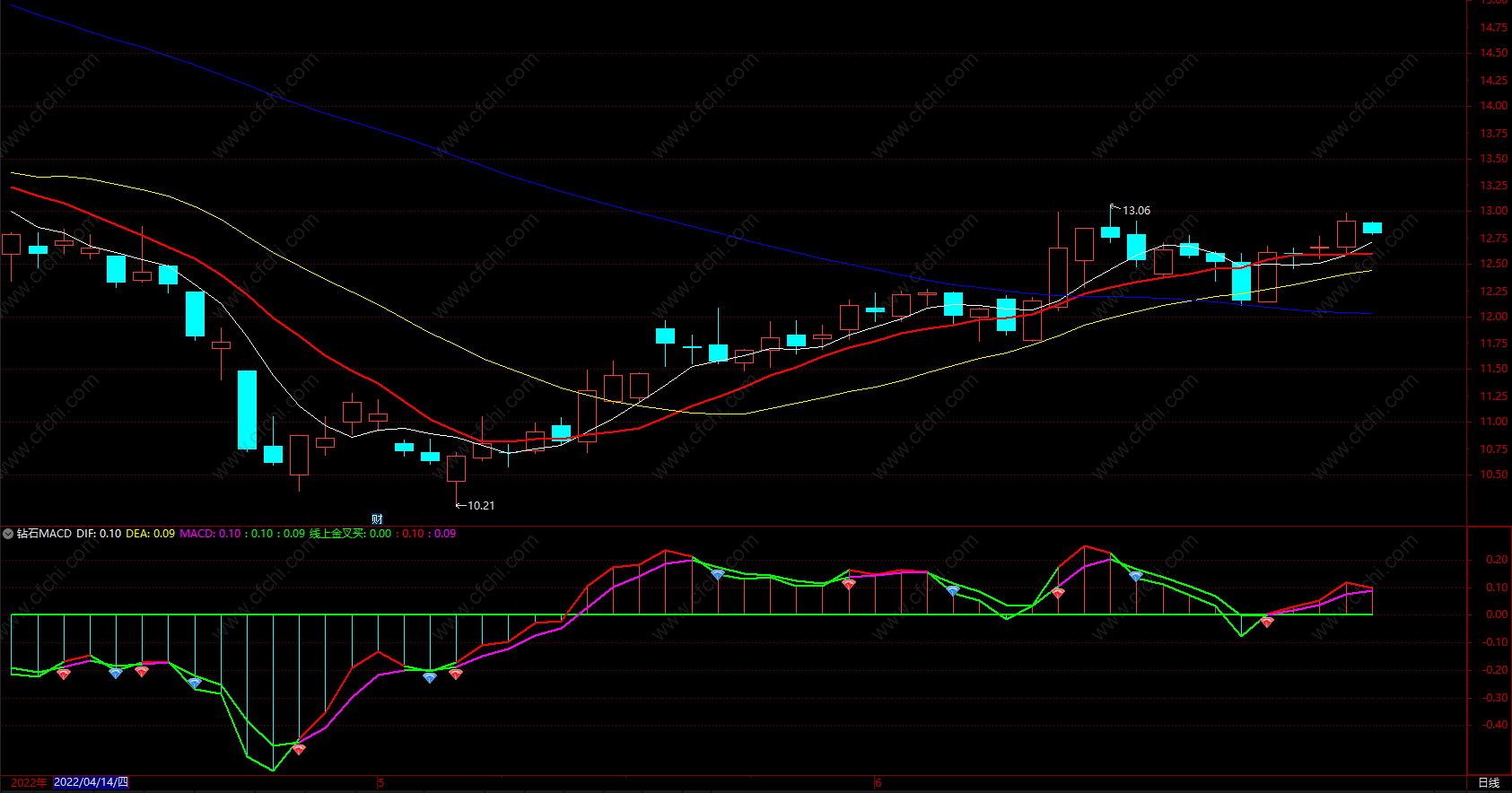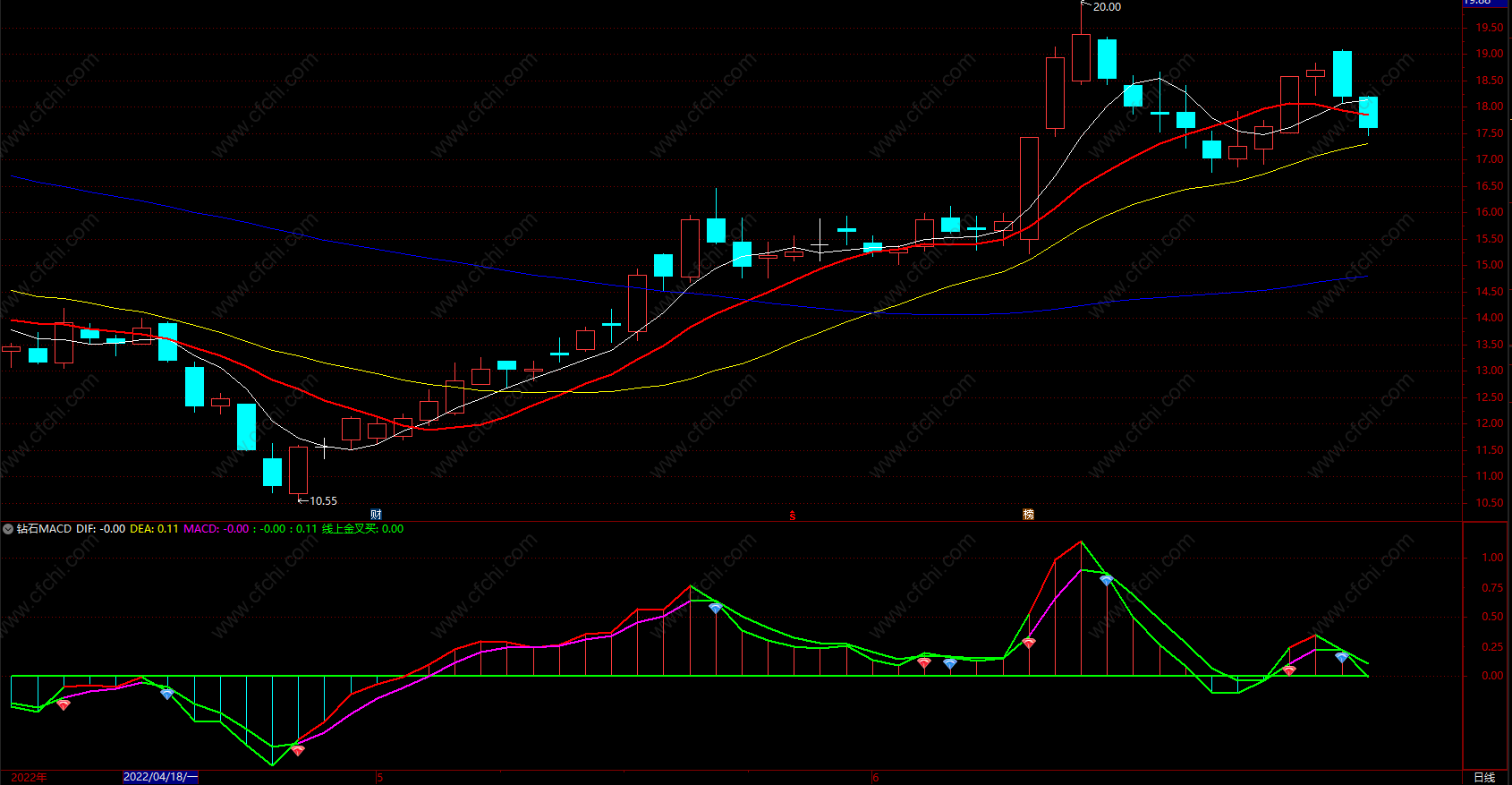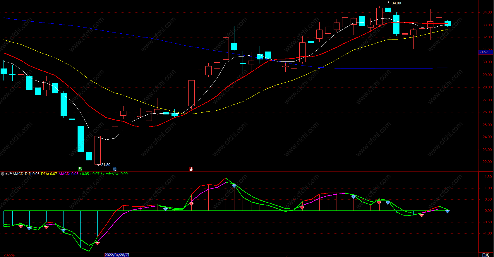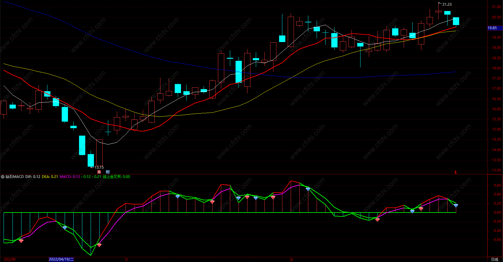 两线在0轴上方是强势市场,0轴下方属于弱势市场,0轴上方红钻买入,两线颜色红色继续持有,出现蓝钻卖出,两线绿色空仓观望。