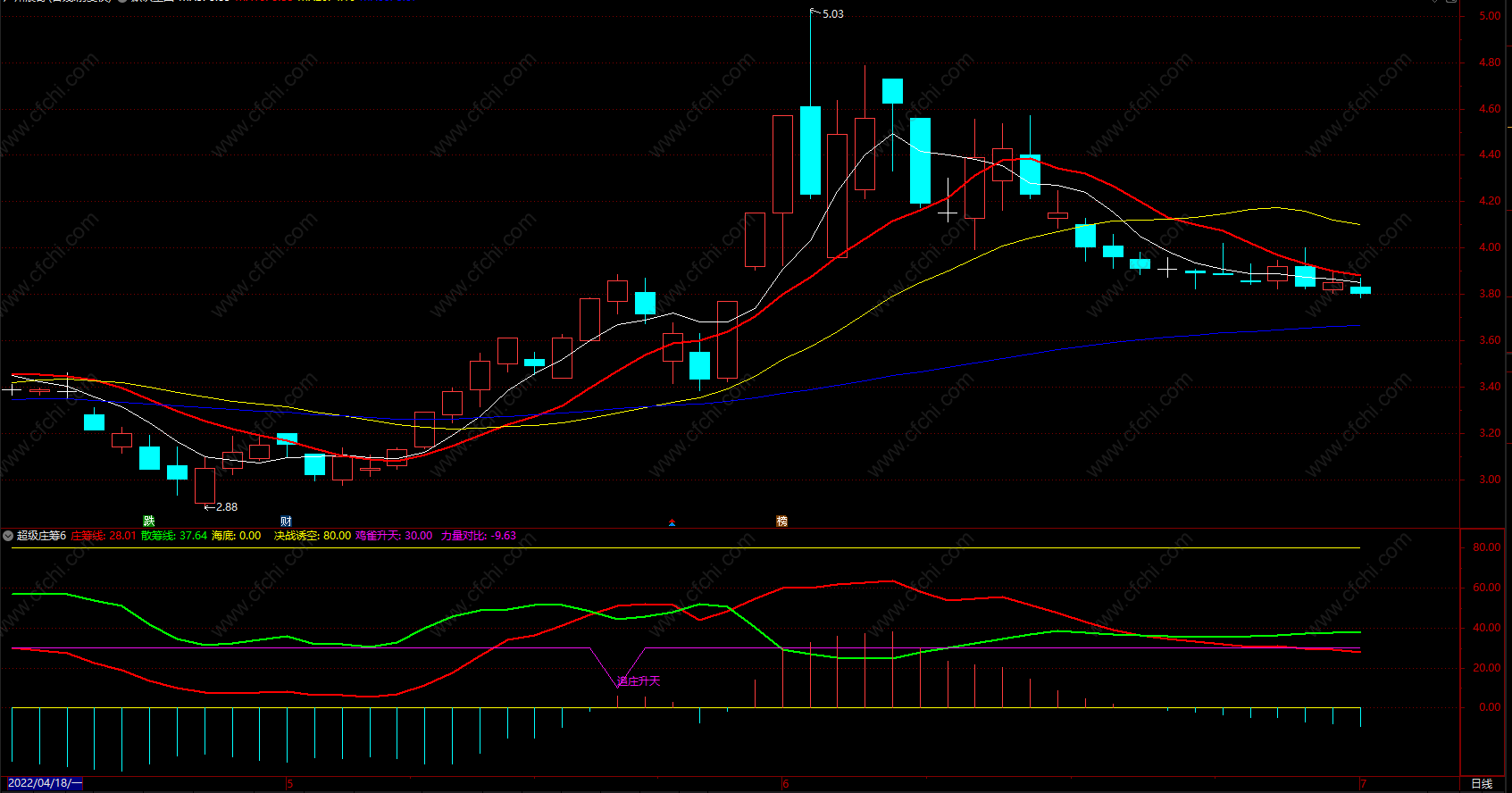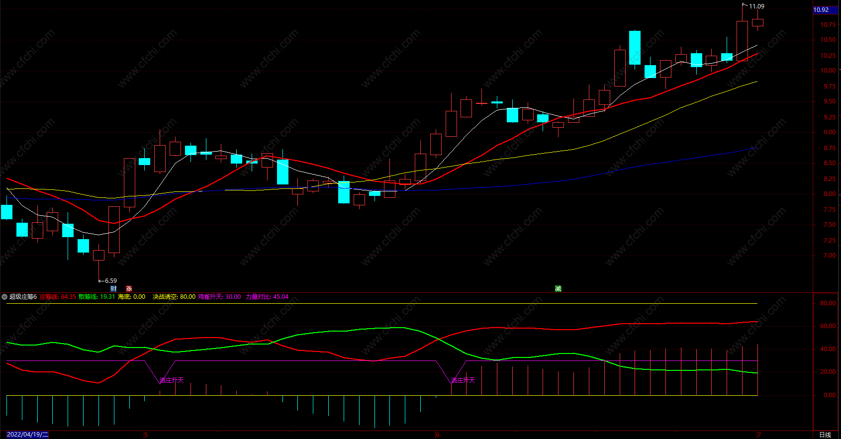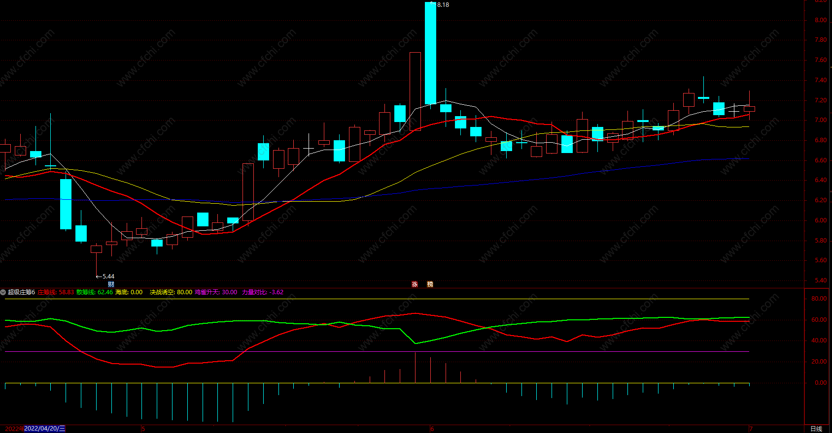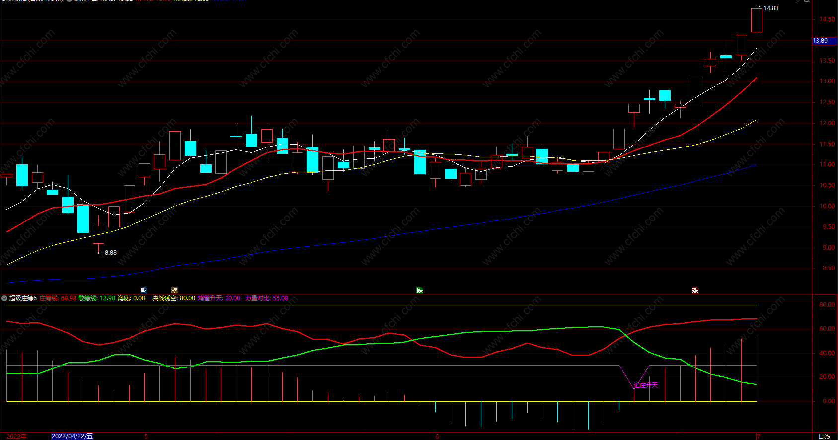 鸡雀升天:IF(CROSS(庄筹线,散筹线) AND CC=1 AND DD>=5 ,10,30),COLORF00FF0;