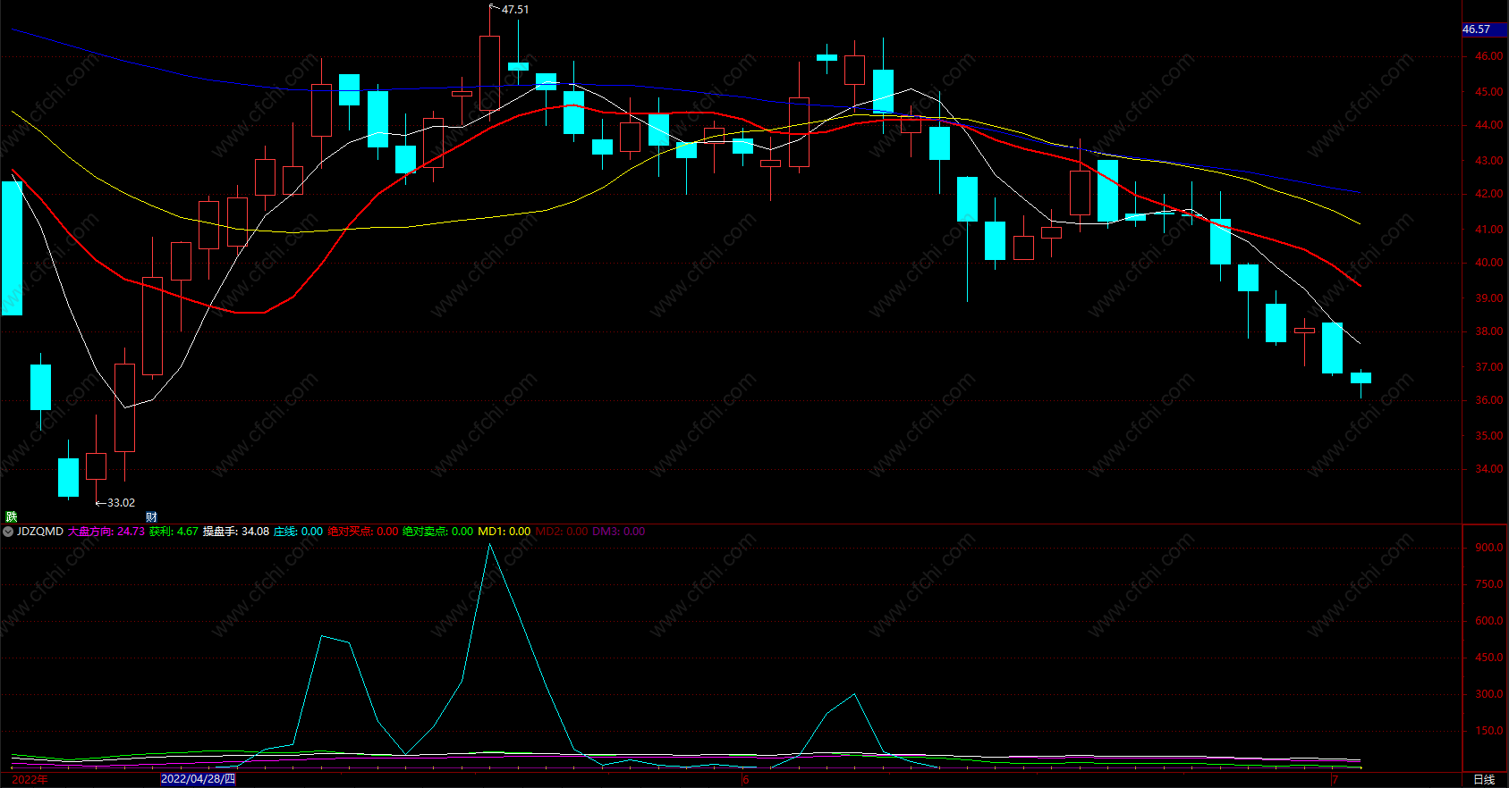 MD1:IF((FILTER((大盘方向<20) AND VAR2C AND (VAR29<60) AND (VAR2B<40),15)=1),80,0),STICK,Linethick3,CoLor00FFFF;