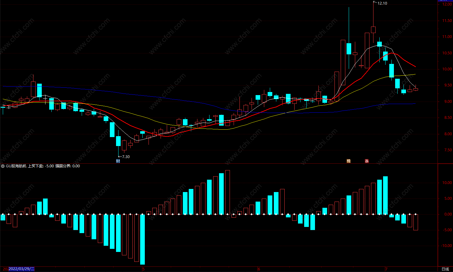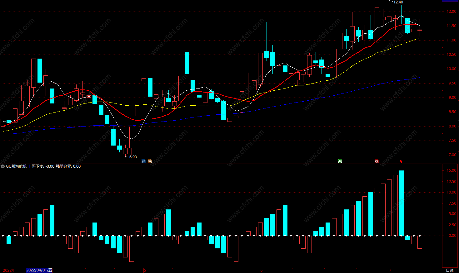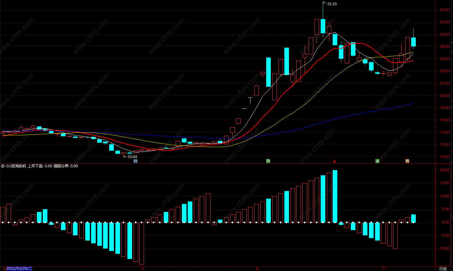 “股海航帆”指标由红、绿两色柱线和“强弱分界”线构成,形似风帆,股市是涨是跌,一目了然。本指标是判断股市涨跌趋势不可多得的有力工具。