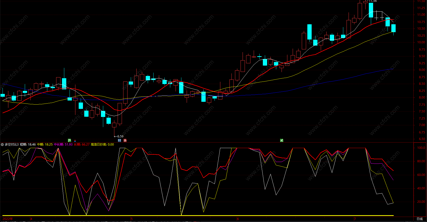 当白线(短期线)到100后股价下跌代表该只股票进入了弱势行情;当白线到达100不再下跌时,该股的行情就是到了翻转时机。