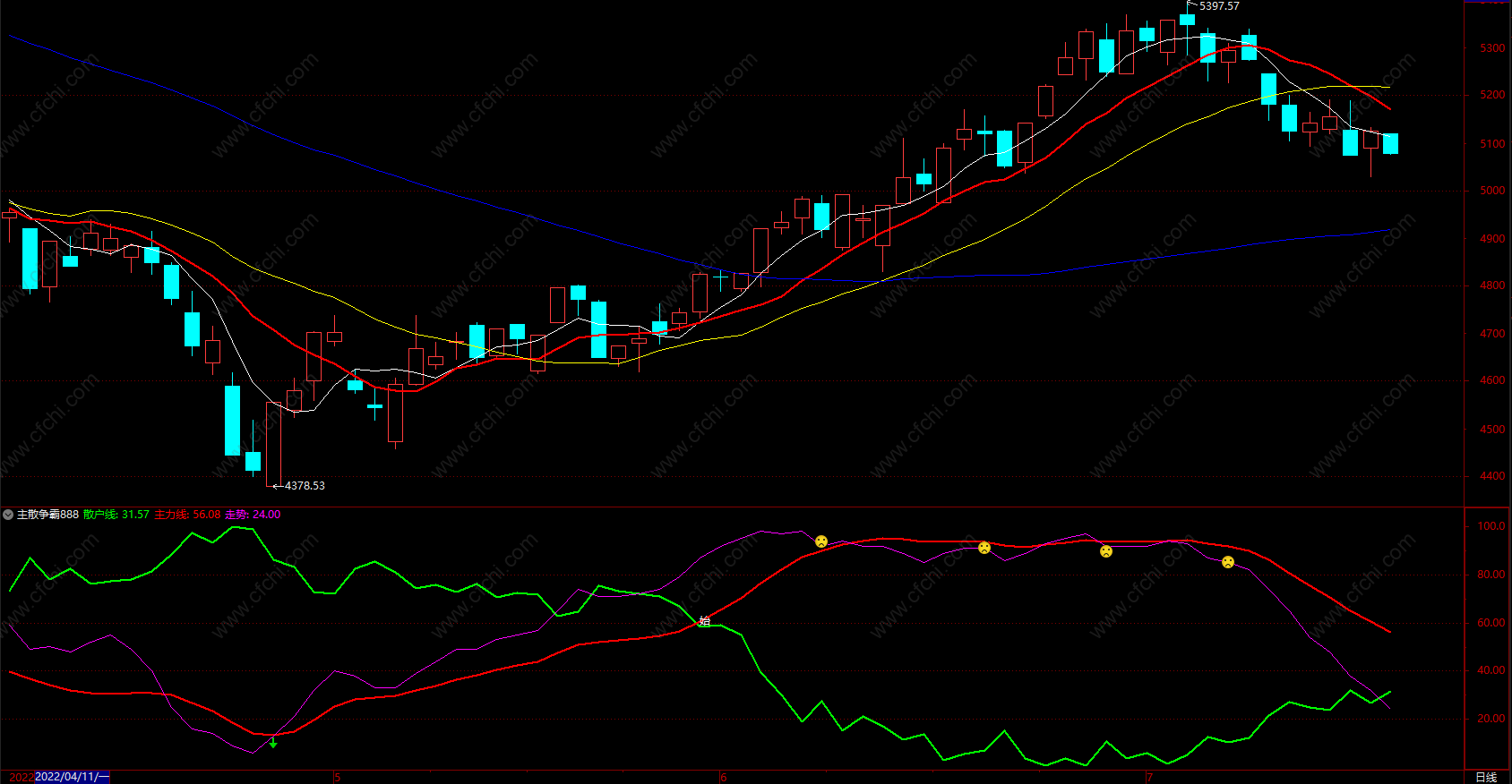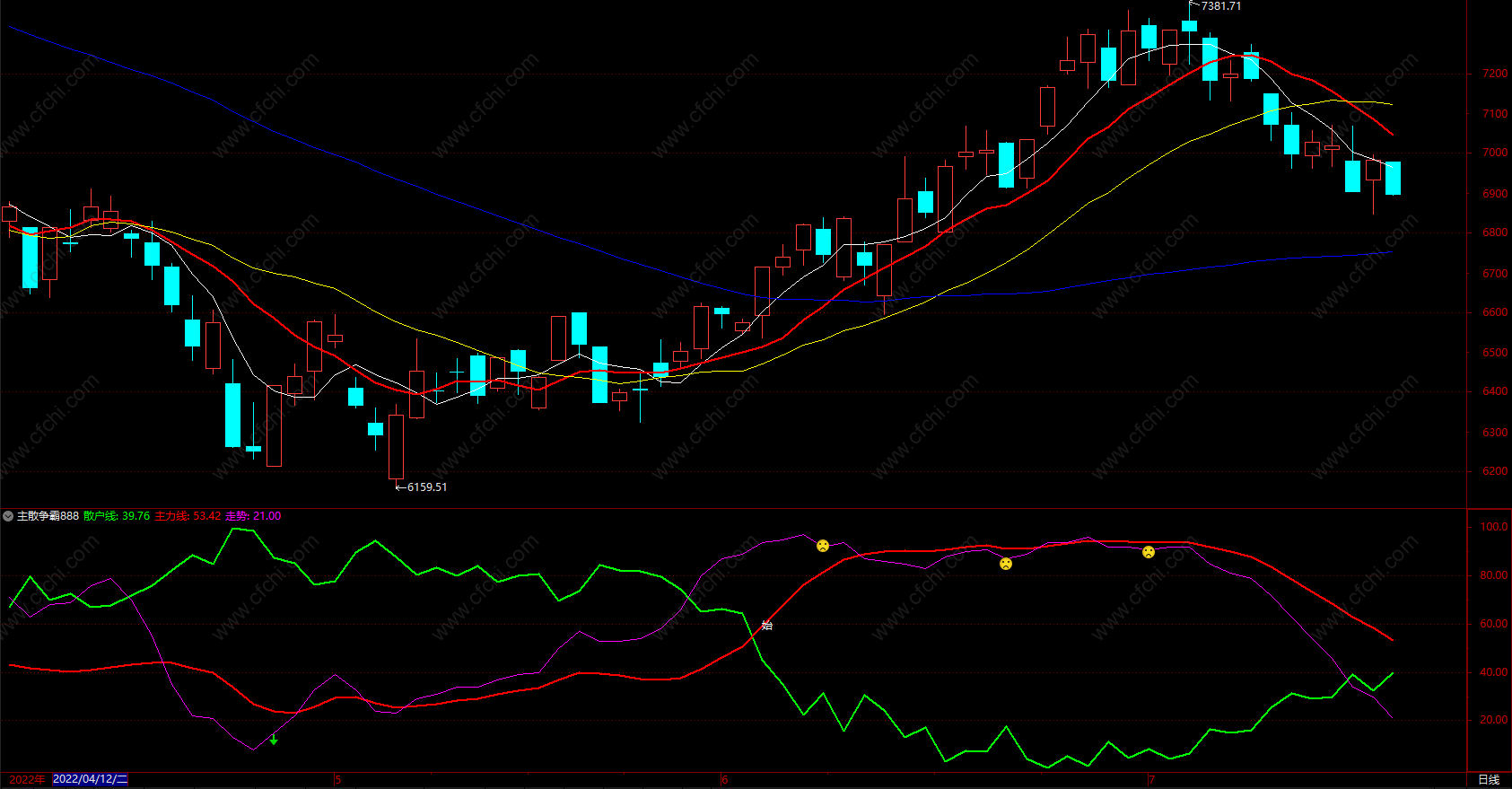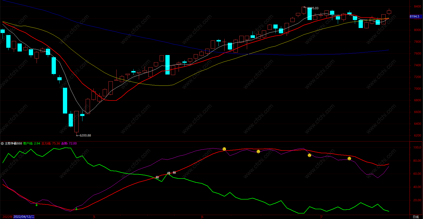 DRAWTEXT(CROSS(散户线,主力线),散户线,'终');