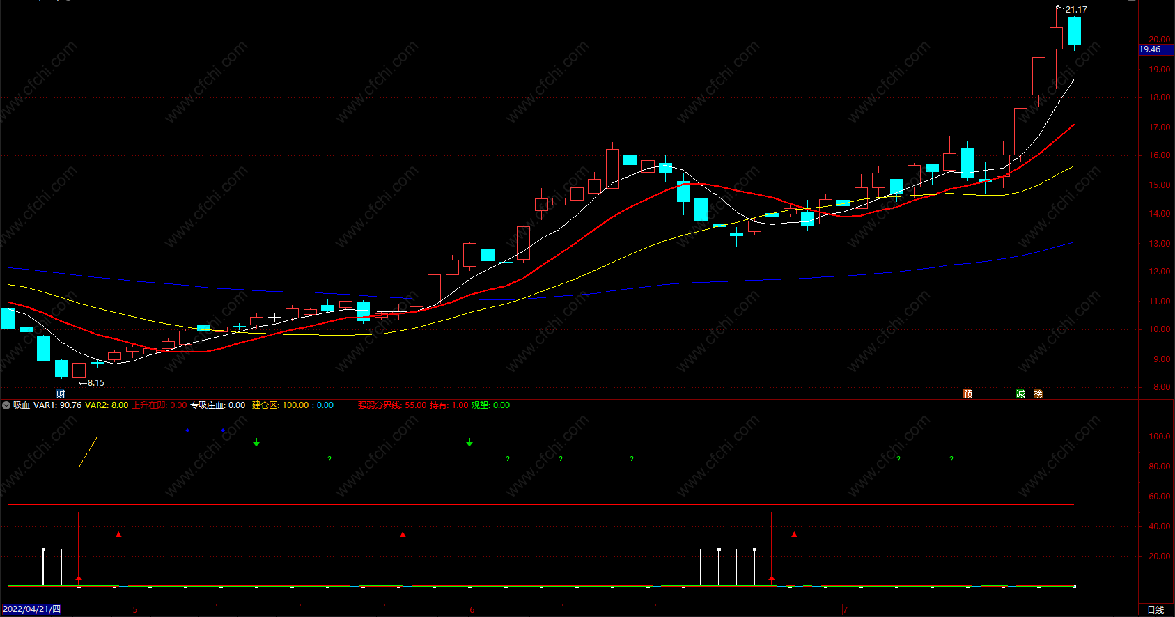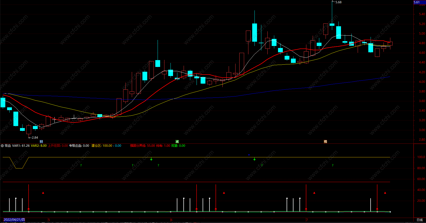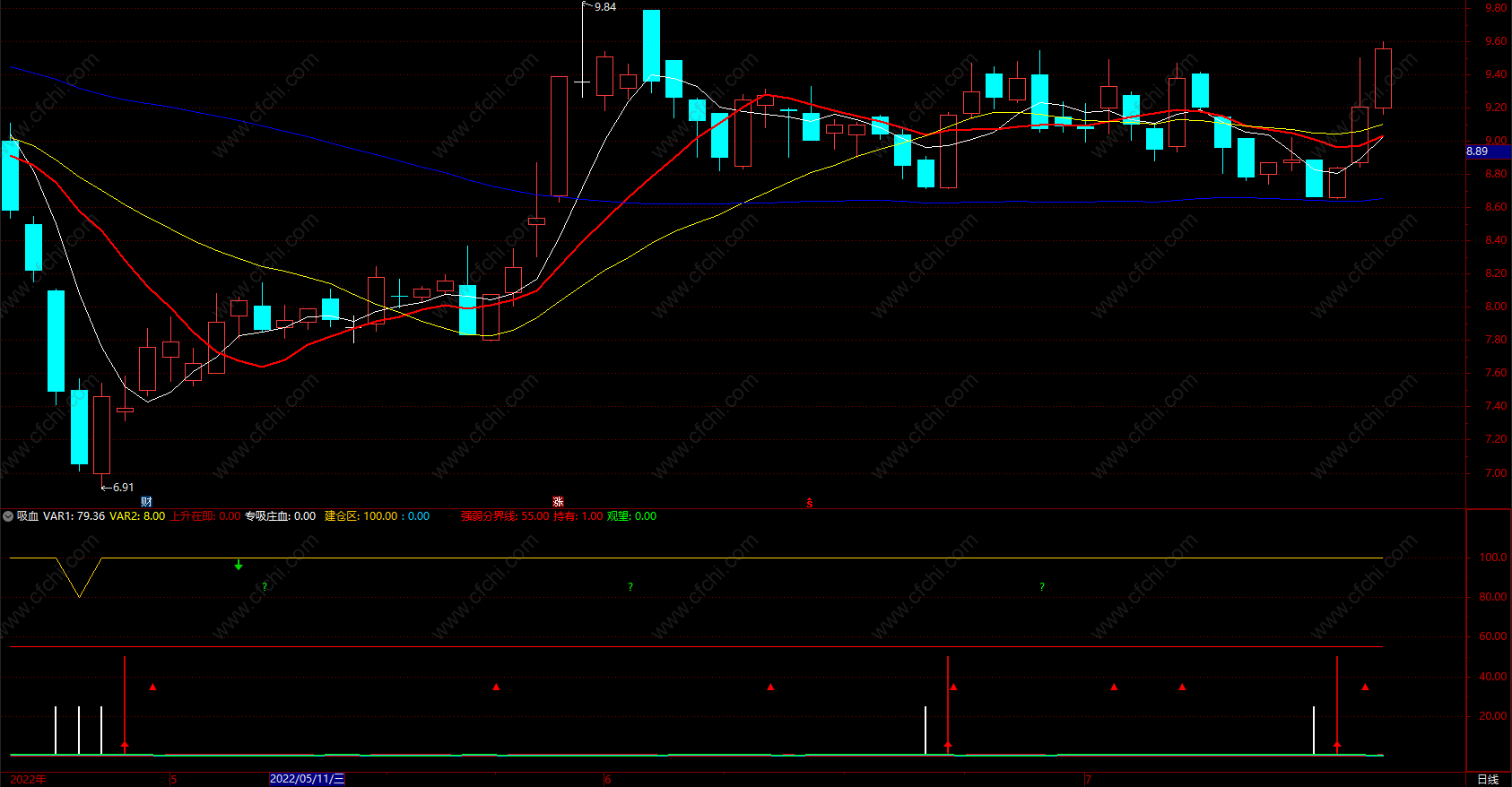 上升在即: IF(CROSS(var1,var2),50,0),STICK,COLOR0000cc,linethick2;