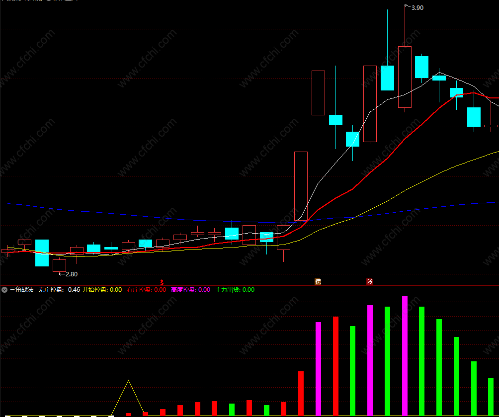 三角形内出现红柱表示有庄控盘且开始控盘;三角形内出现紫柱表示有庄控盘且高度控盘;白柱表示无庄