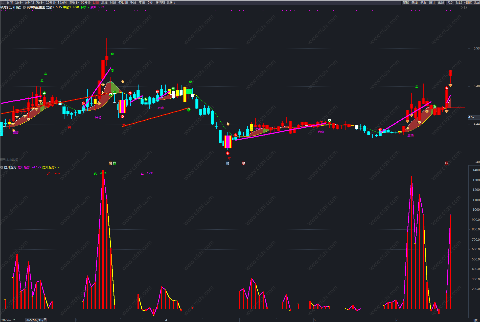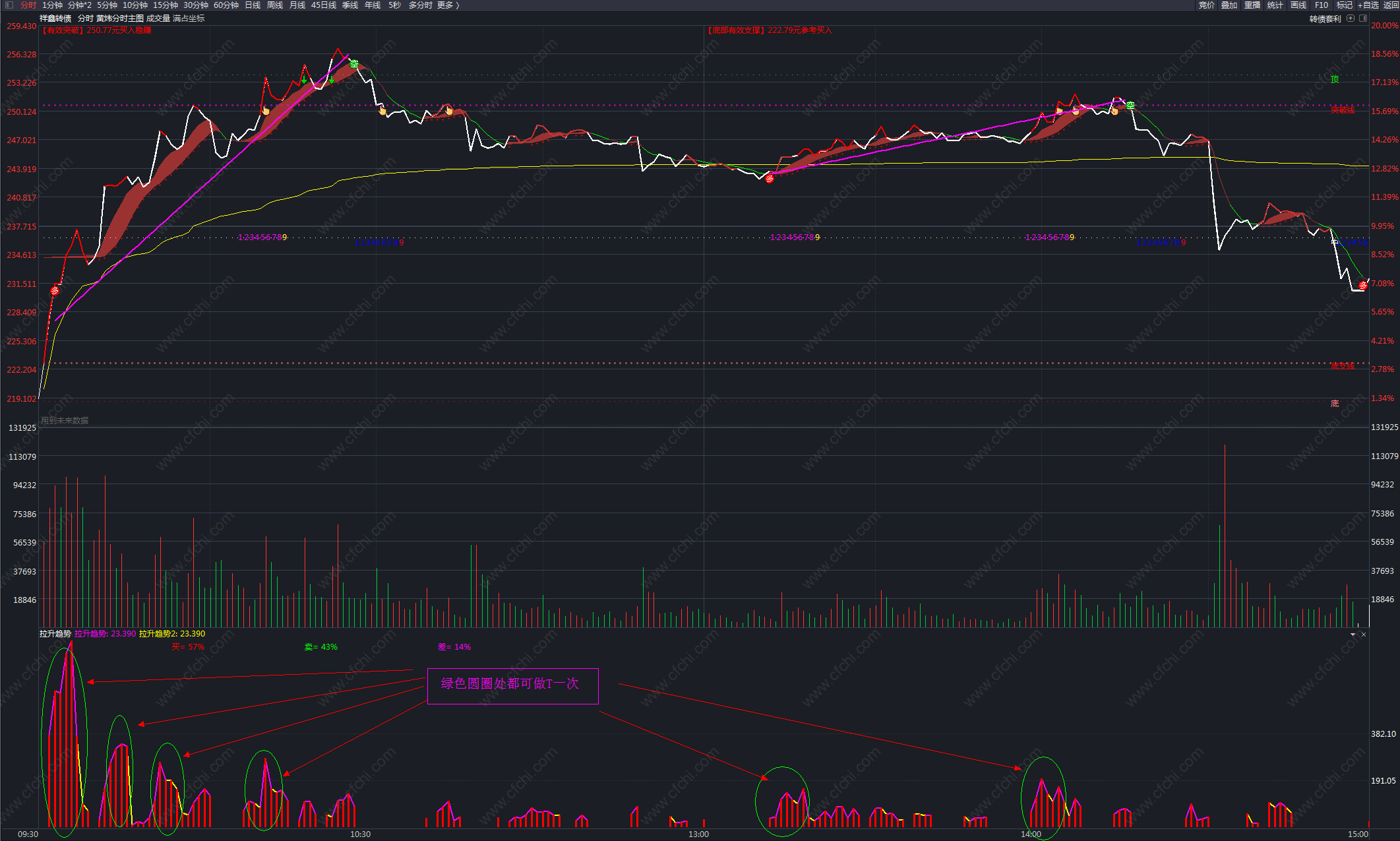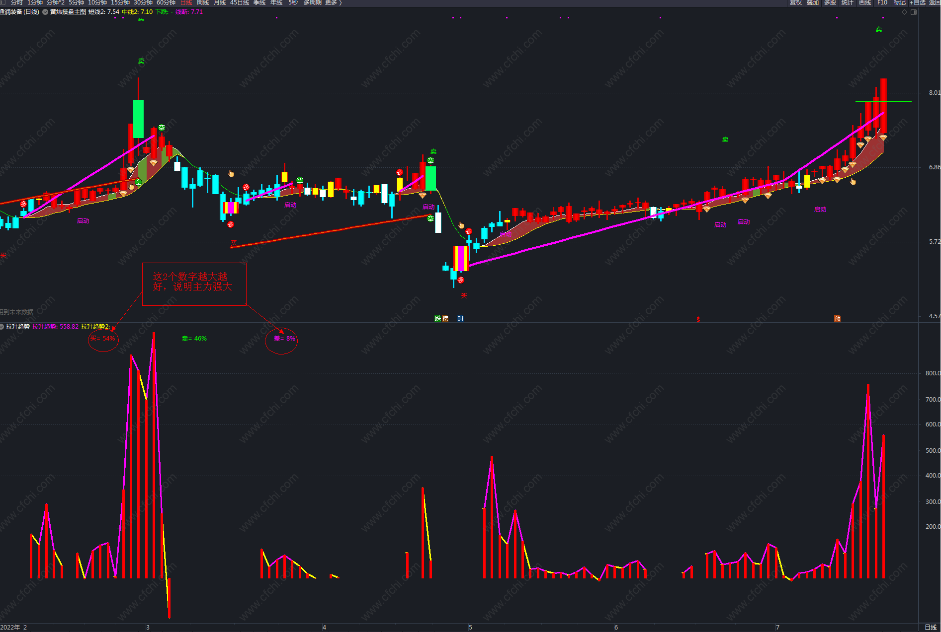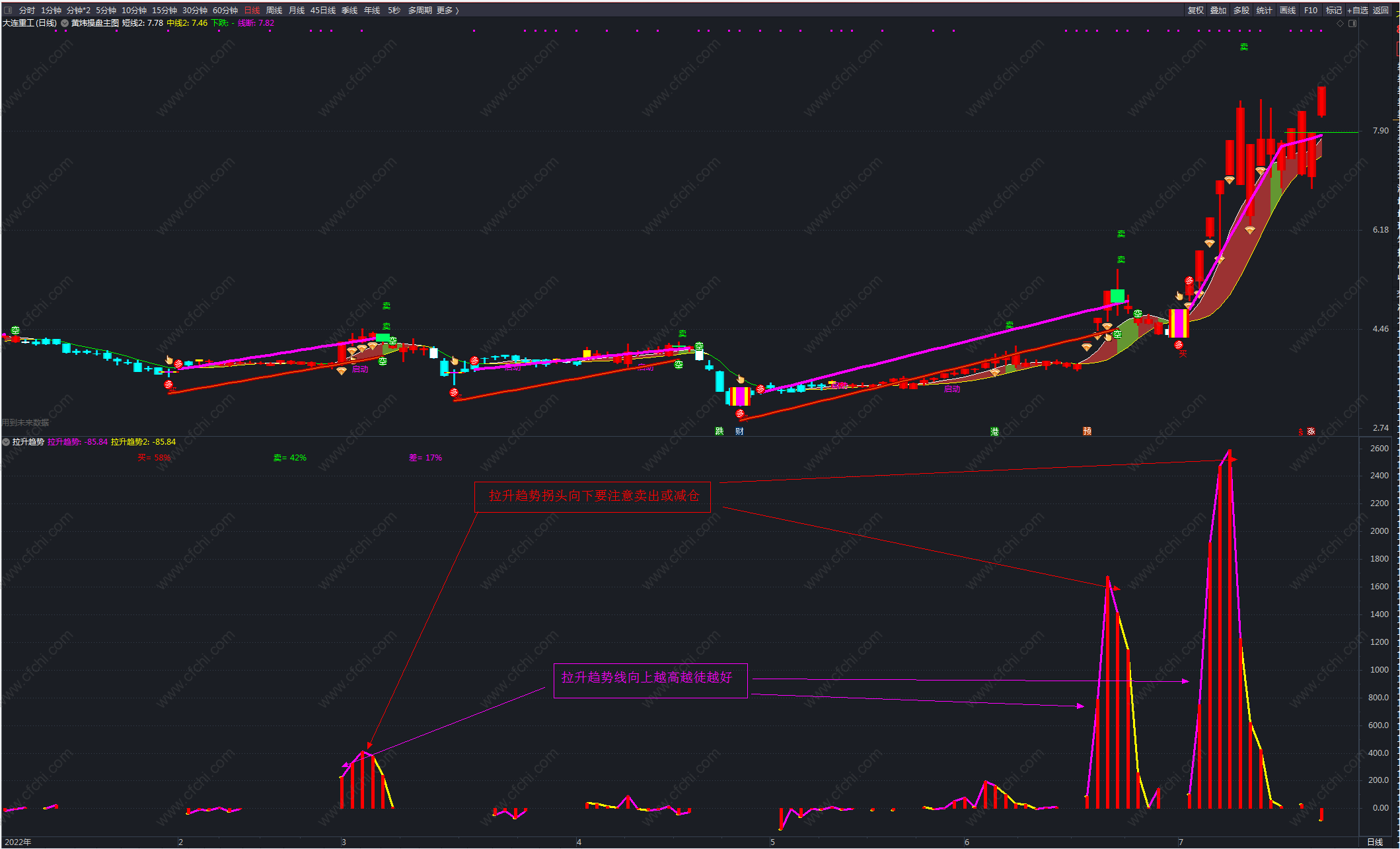 (拉升趋势副图,黄炜指标公式,可用于分时副图和日K线等副图,可用于股票,可转债,期货等做T+0.)