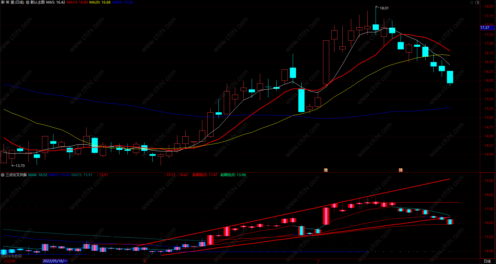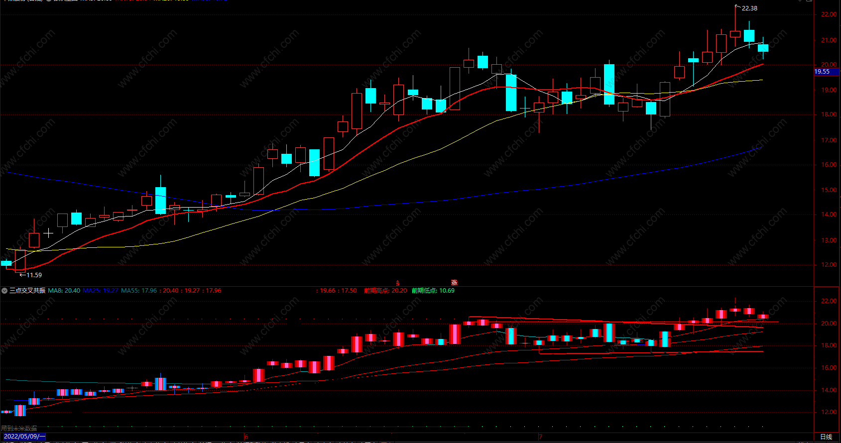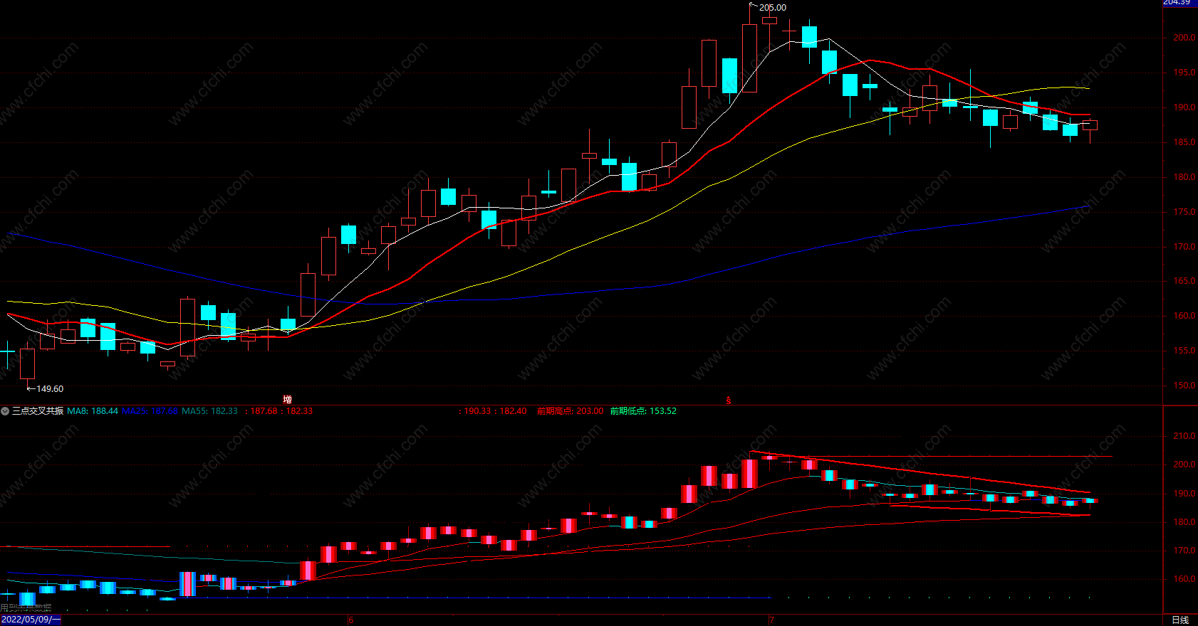 三点交叉共振指标,红色波段上涨趋势,蓝色波段下跌趋势!