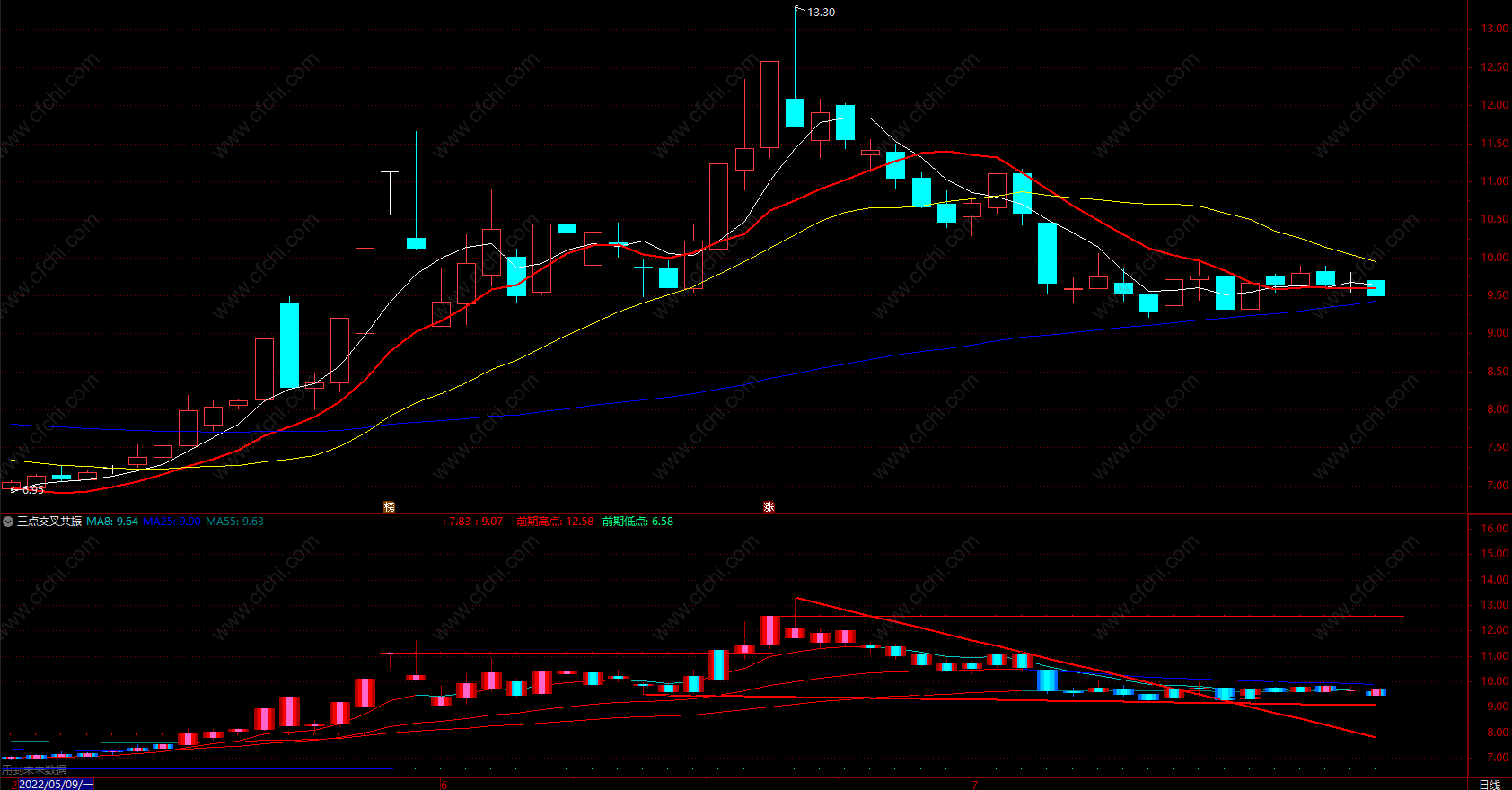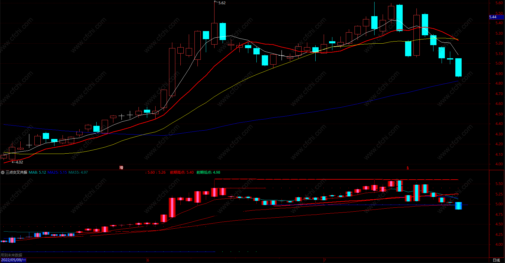 (三点交叉共振指标 通达信技术指标共振选股公式 副图 源码)