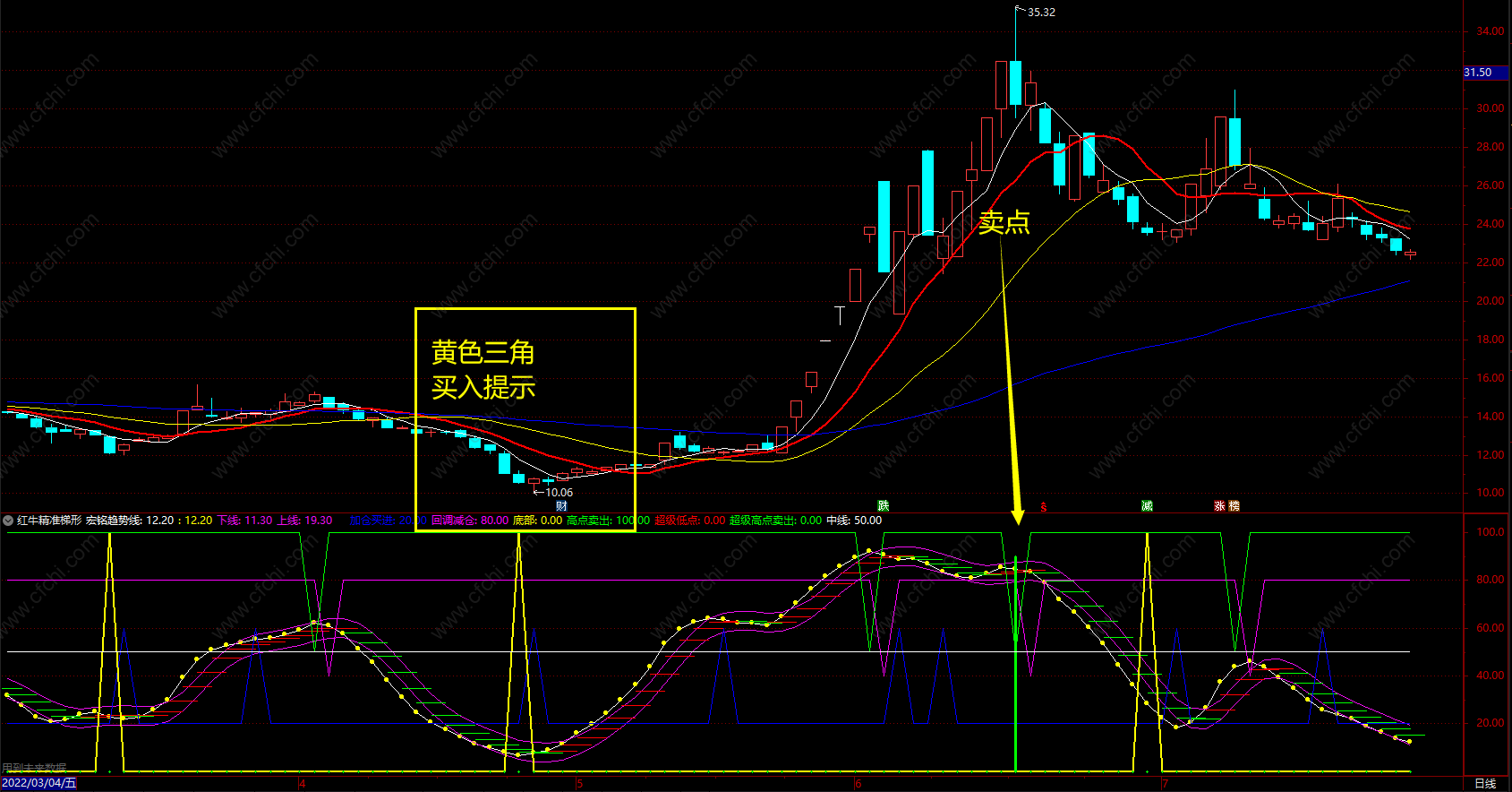 卖点:白色趋势线下穿紫色线,绿色三角形,卖出提示!