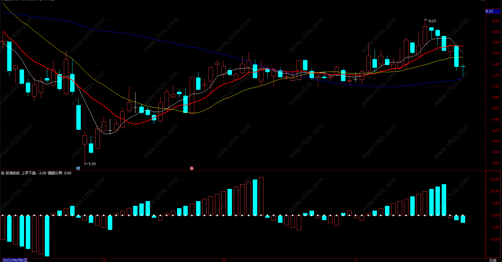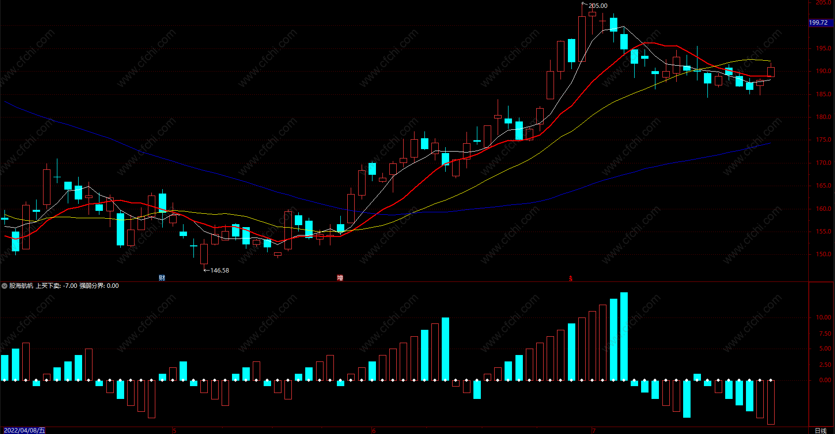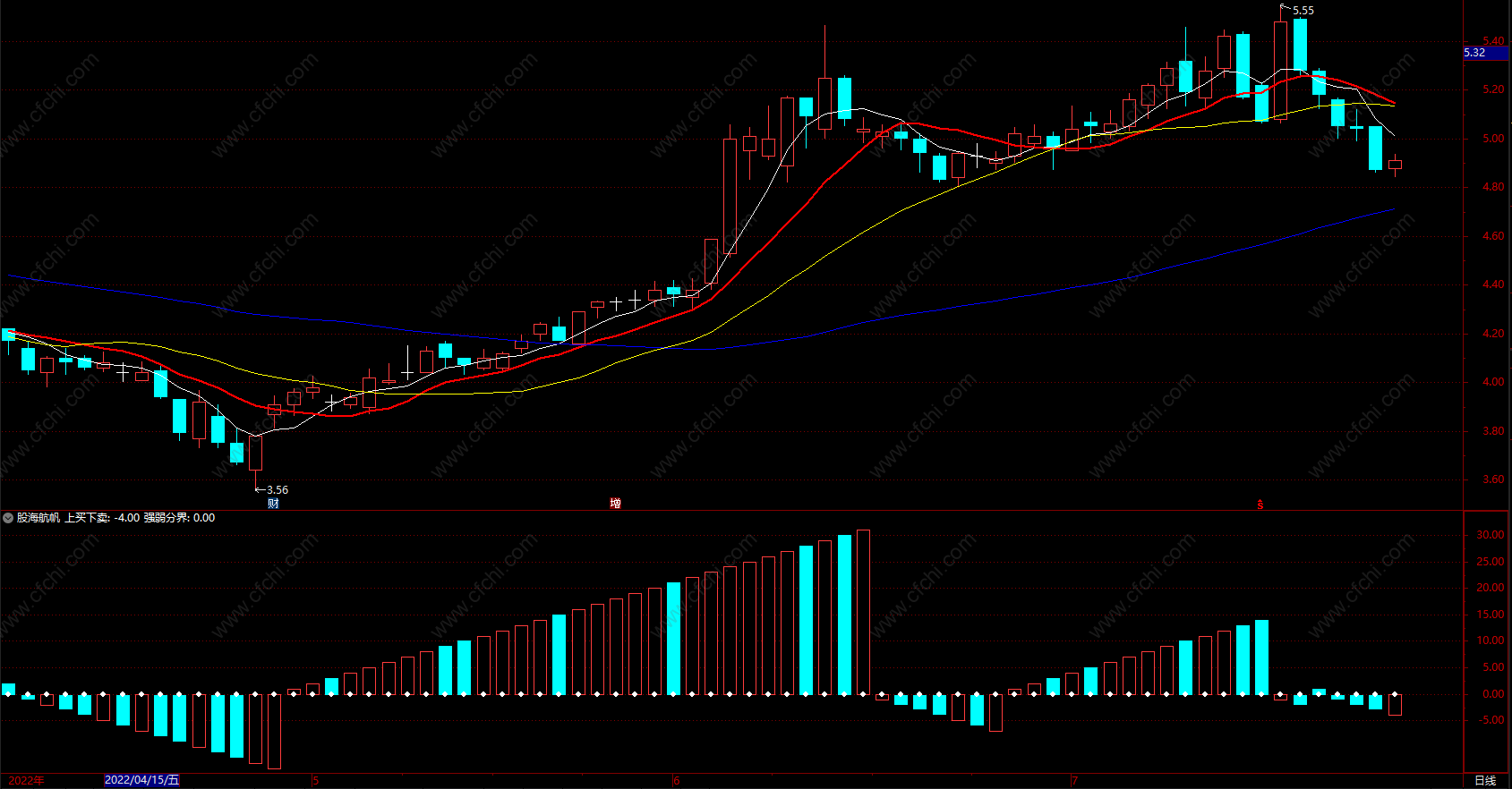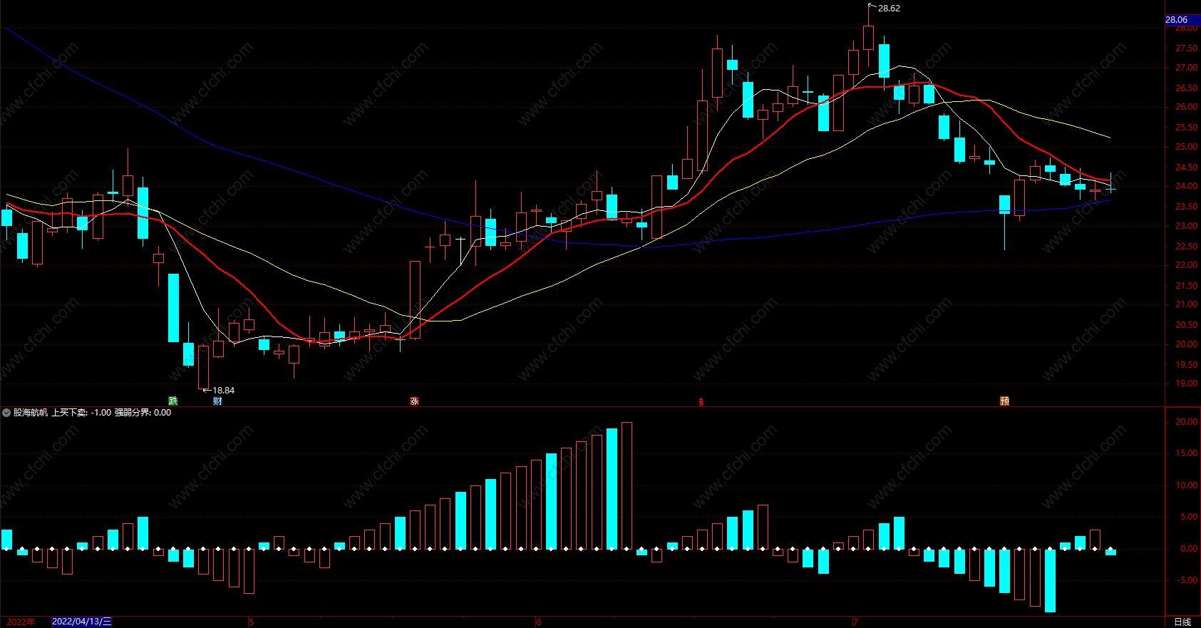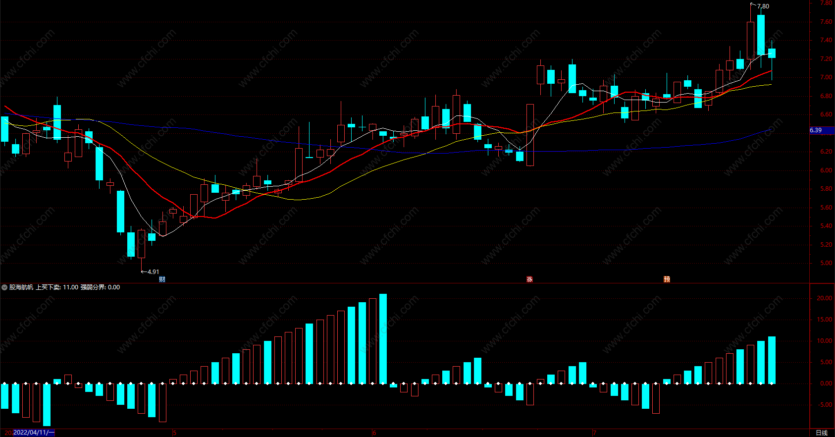 “股海航帆”指标由红、绿两色柱线和“强弱分界”线构成,形似风帆,股市是涨是跌,一目了然。本指标是判断股市涨跌趋势不可多得的有力工具。