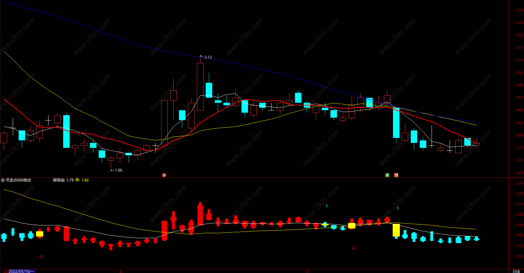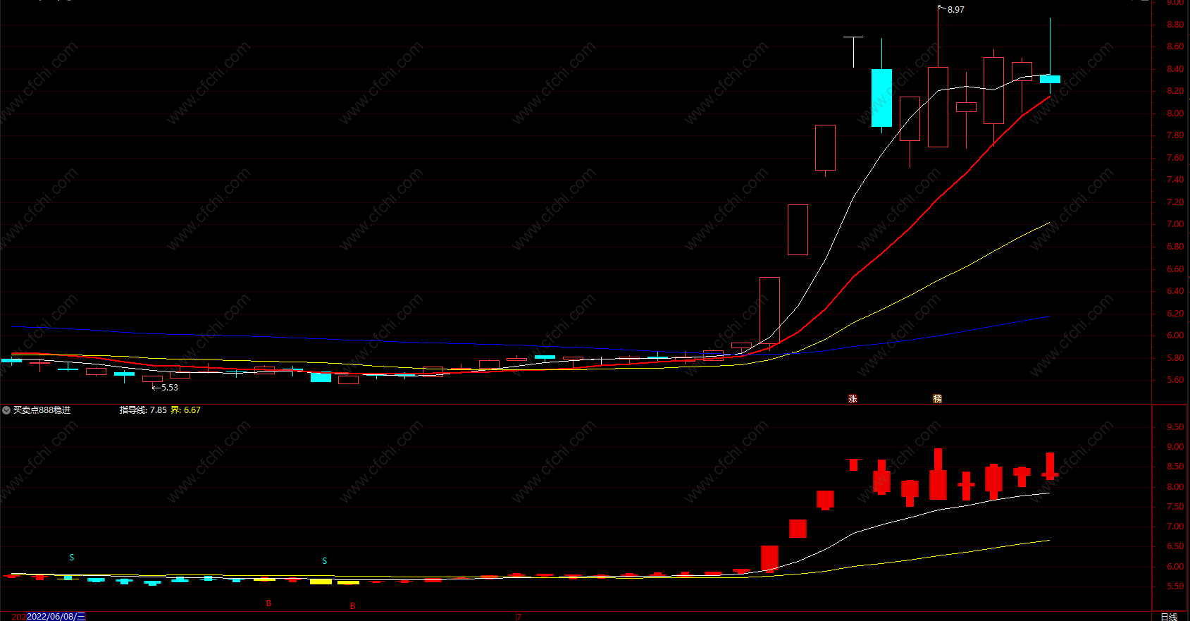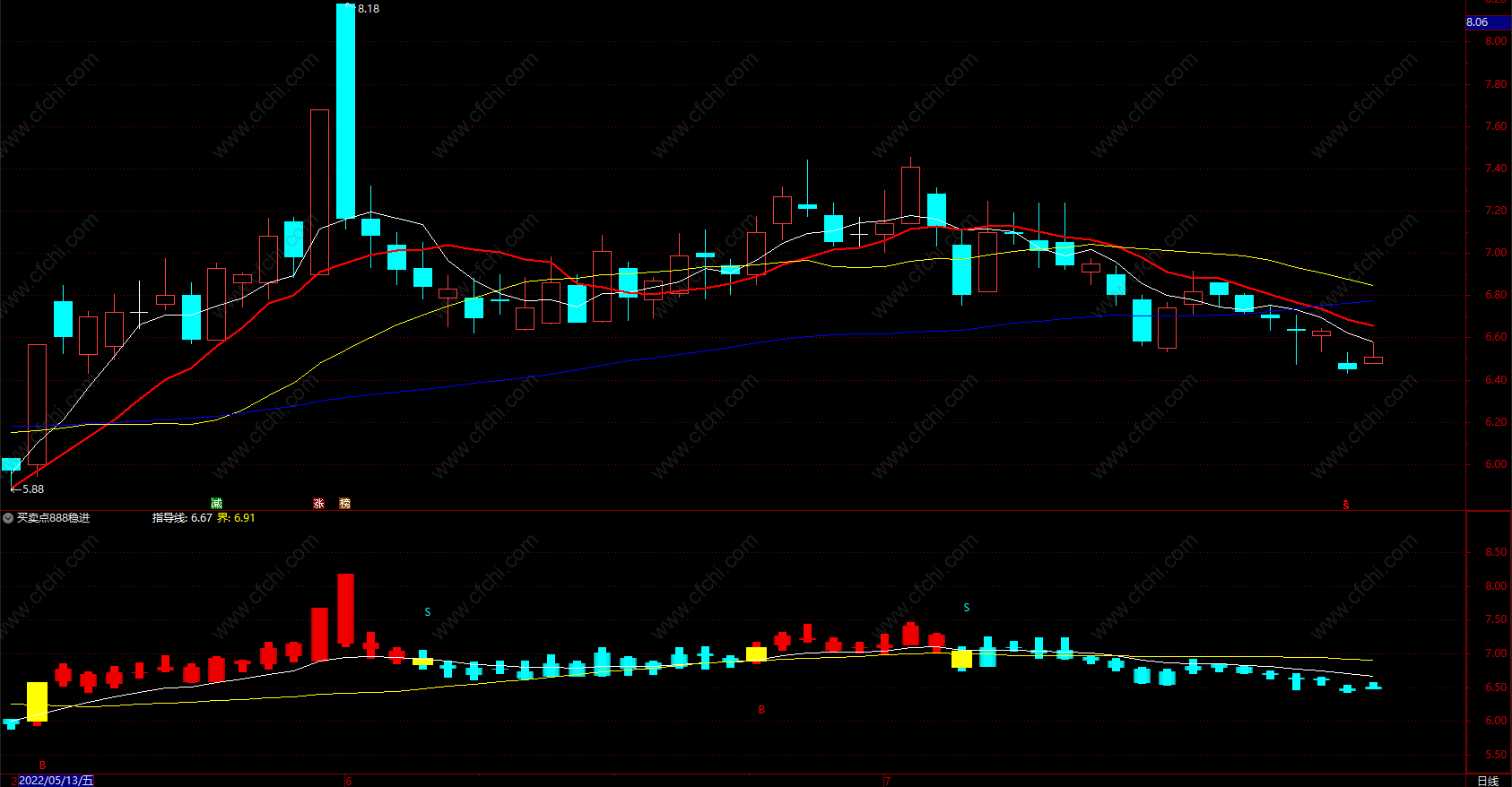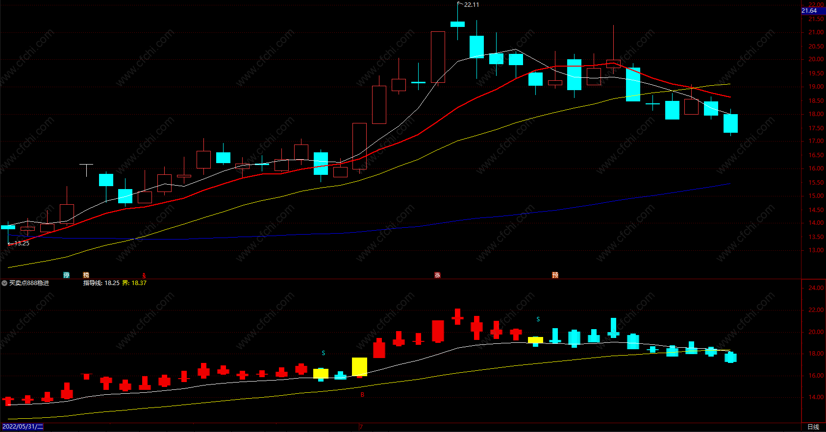 卖点:蓝柱叠加黄柱“S”波段下跌趋势!