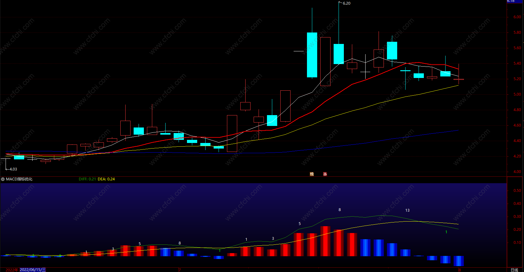 在多头市场中,当一波大行情来临时,有些股票的MACD指标零上金叉后,股价产生了一波不小的升段,因此,市场上有一种说法就是要等MACD零上金叉时再买入股票,很多上涨的图形确实显示MACD零上金叉后会有一段再上涨行情,往往还是主升浪。