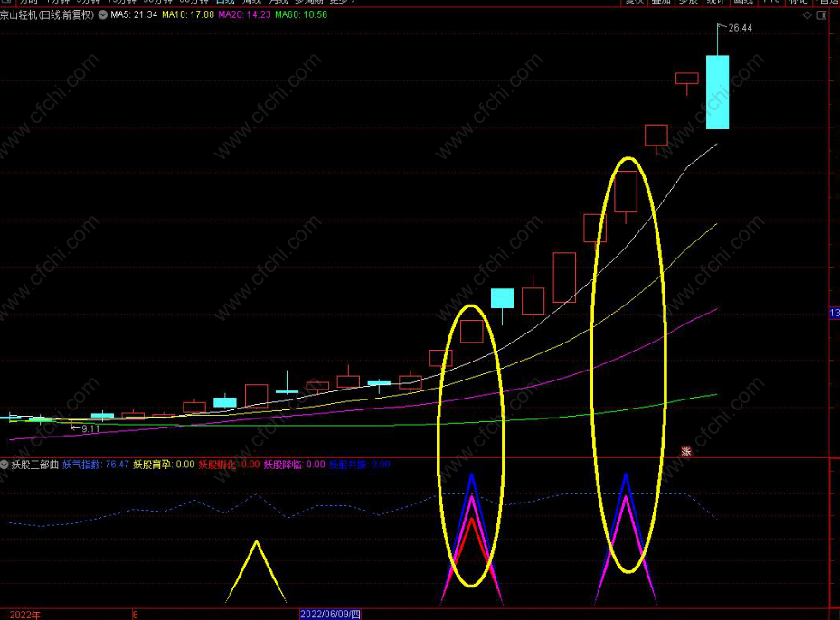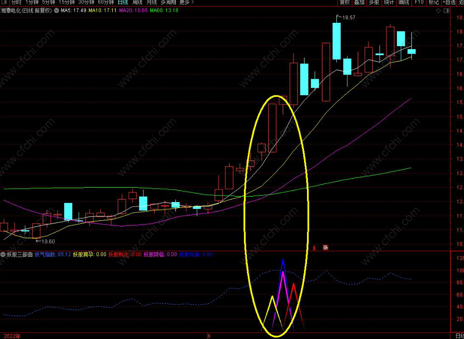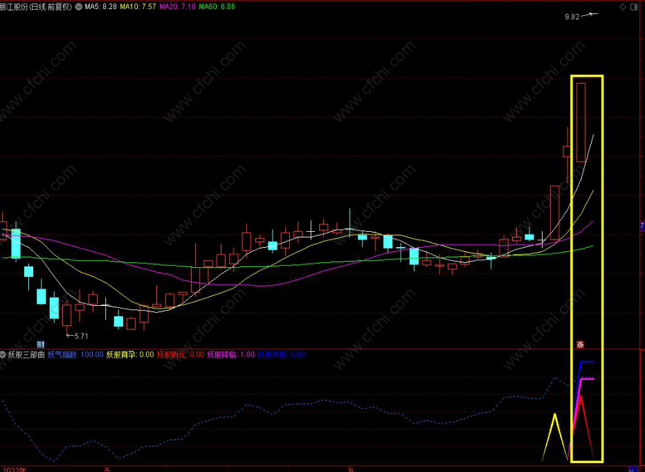 一个副图四个选股指标,育孕选股,孵化选股,妖股降临选股加上一个三信号共振世间万物都离不开的定律,妖股形成也是一样的:先妖股育孕,再妖股孵化,然后妖股降临本指标使用注意:依次出现妖股育孕,妖股孵化,妖股降临(信号间隔越近,妖气越足),三种信号同时出现也就是幅图上的蓝三角柱,越容易出现大妖股!需要观察妖气指数是否能够持续(蓝色趋势线)!无未来函数。
