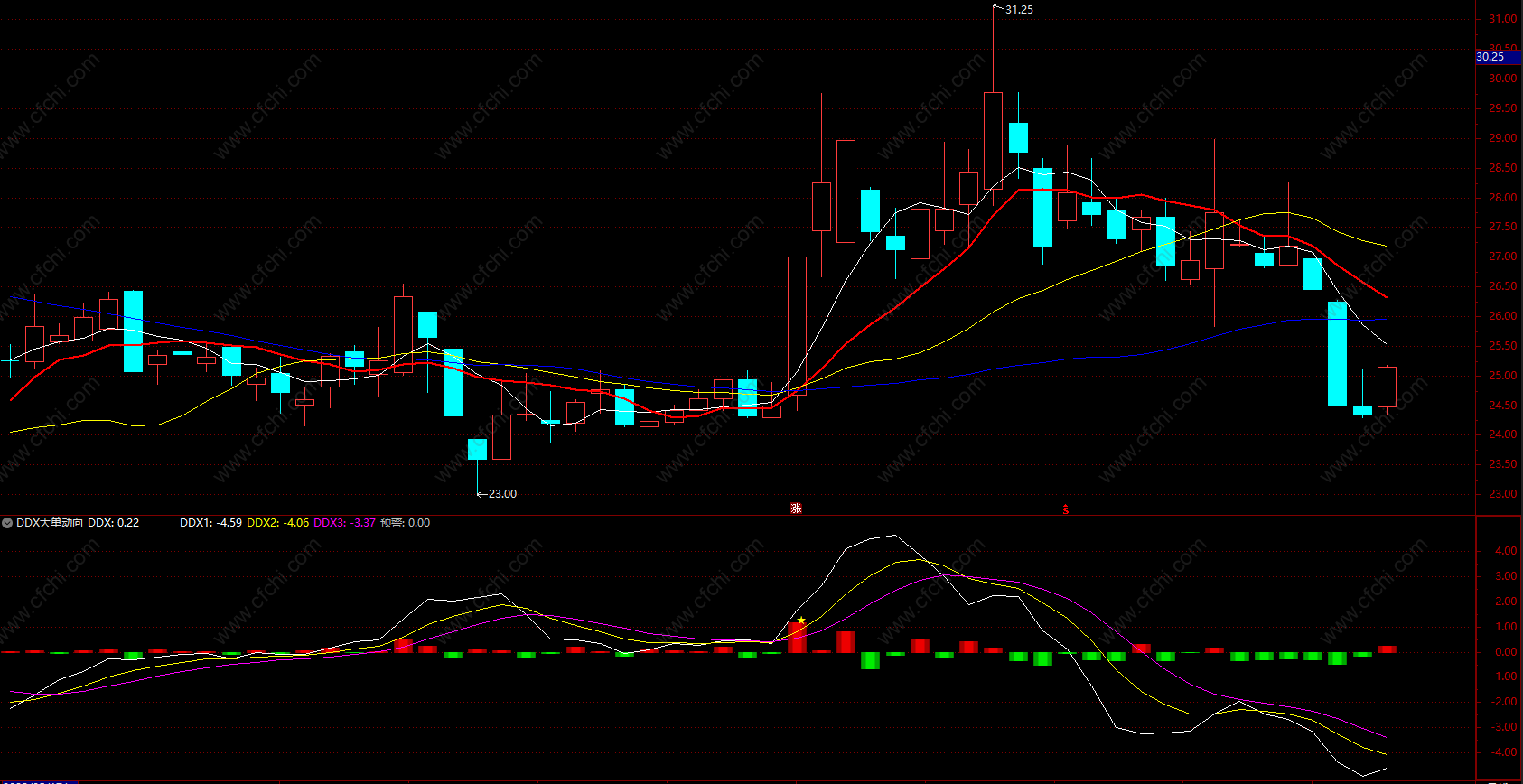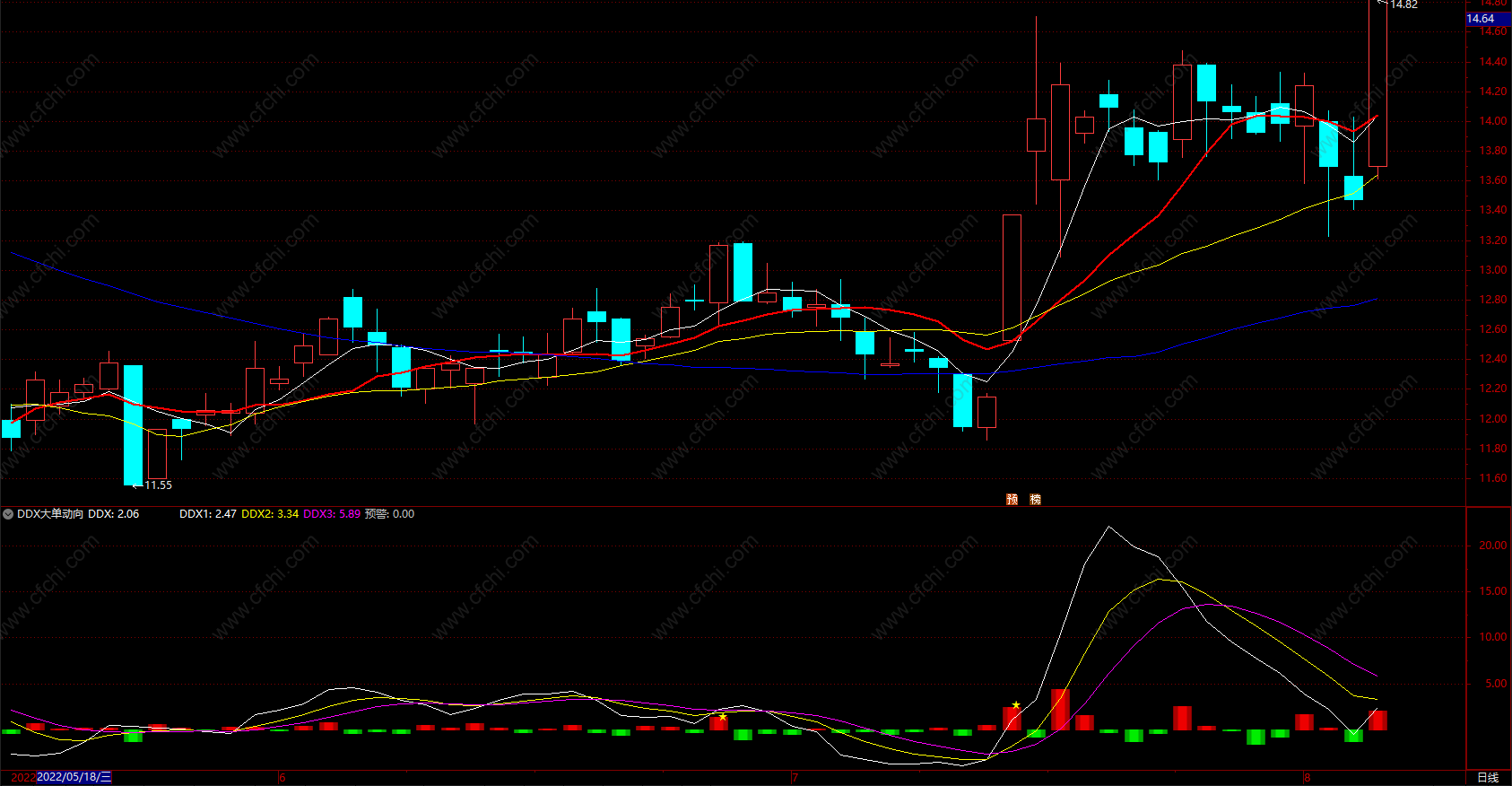 预警:DDX>0 AND MA(V,5)>MA(MA(V,5),5) AND CROSS(DDX1,DDX2),LINETHICK;