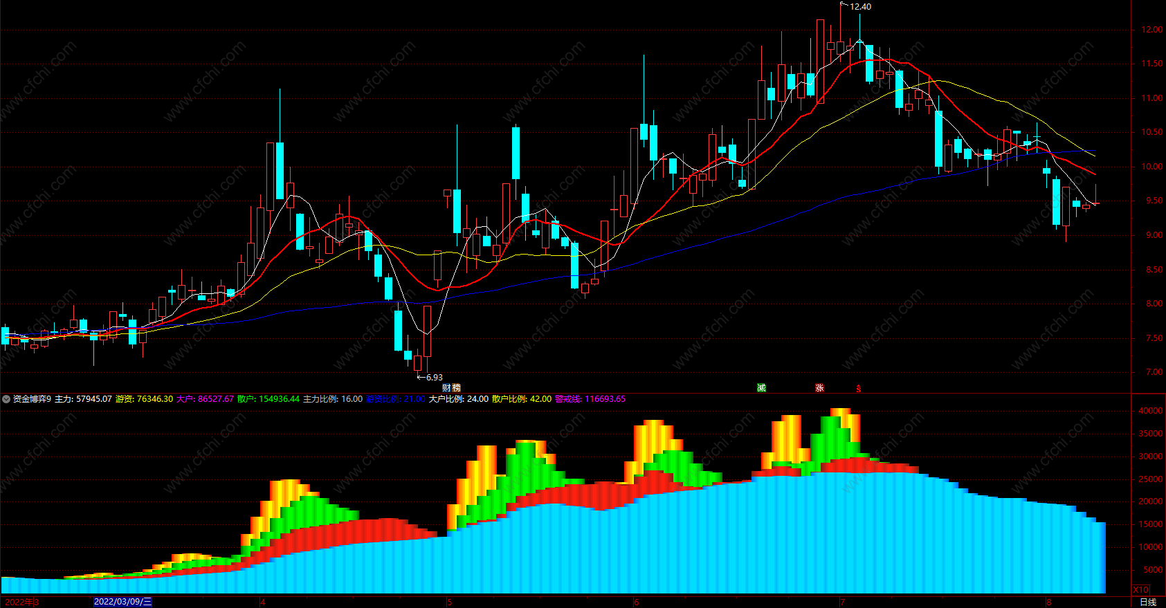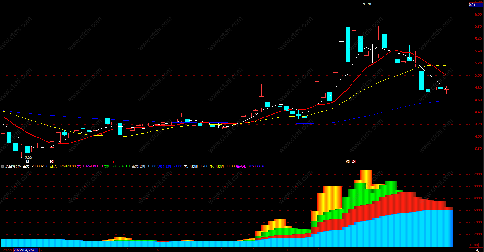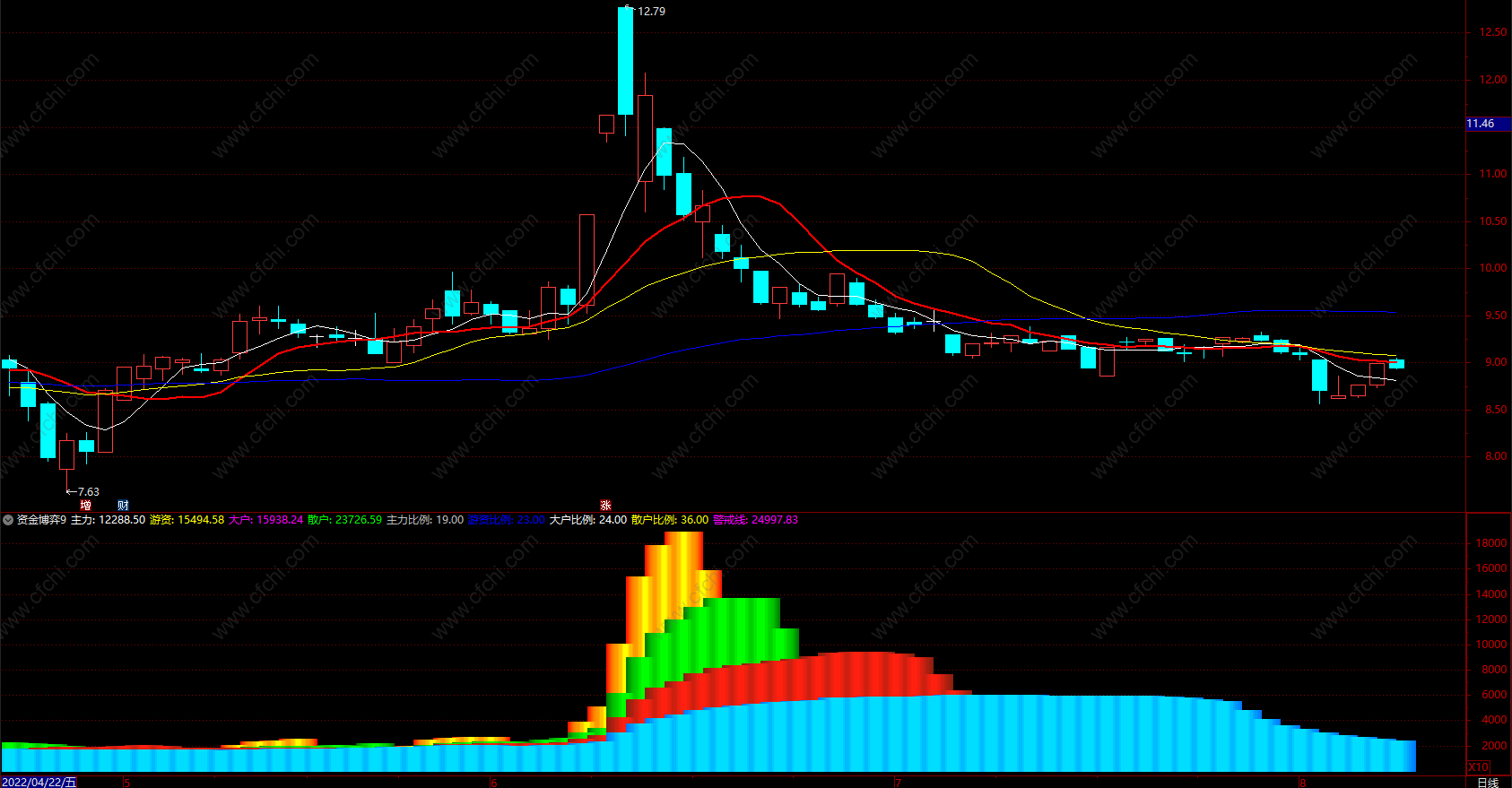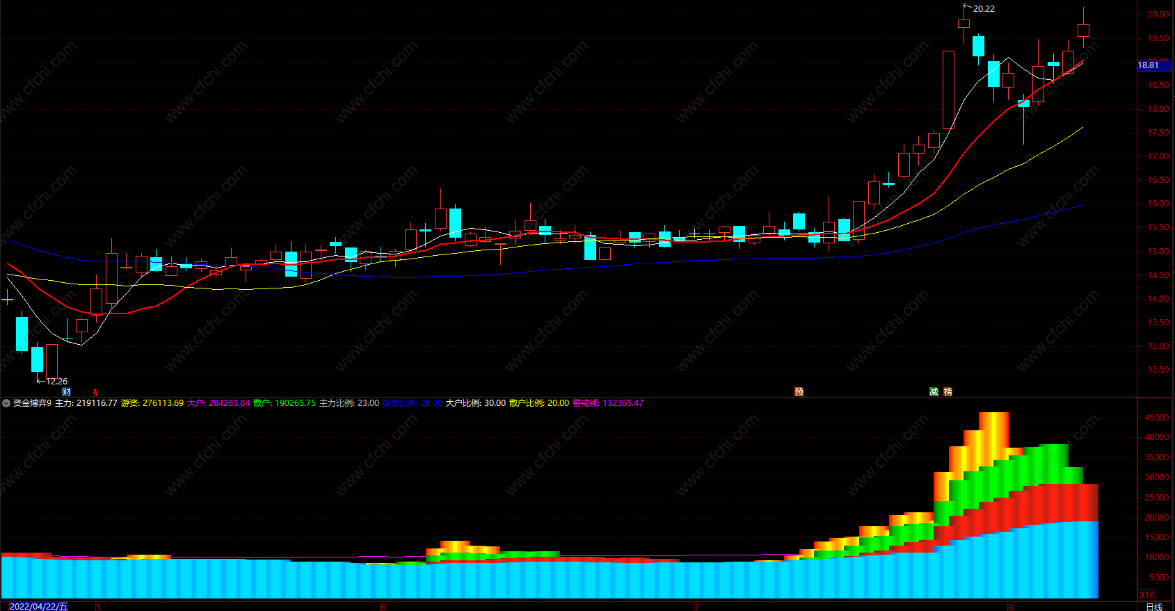 主力比例:CEILING(((主力 / (((主力 + 游资) + 大户) + 散户)) * 100)),LINETHICK0,color00FFFF;