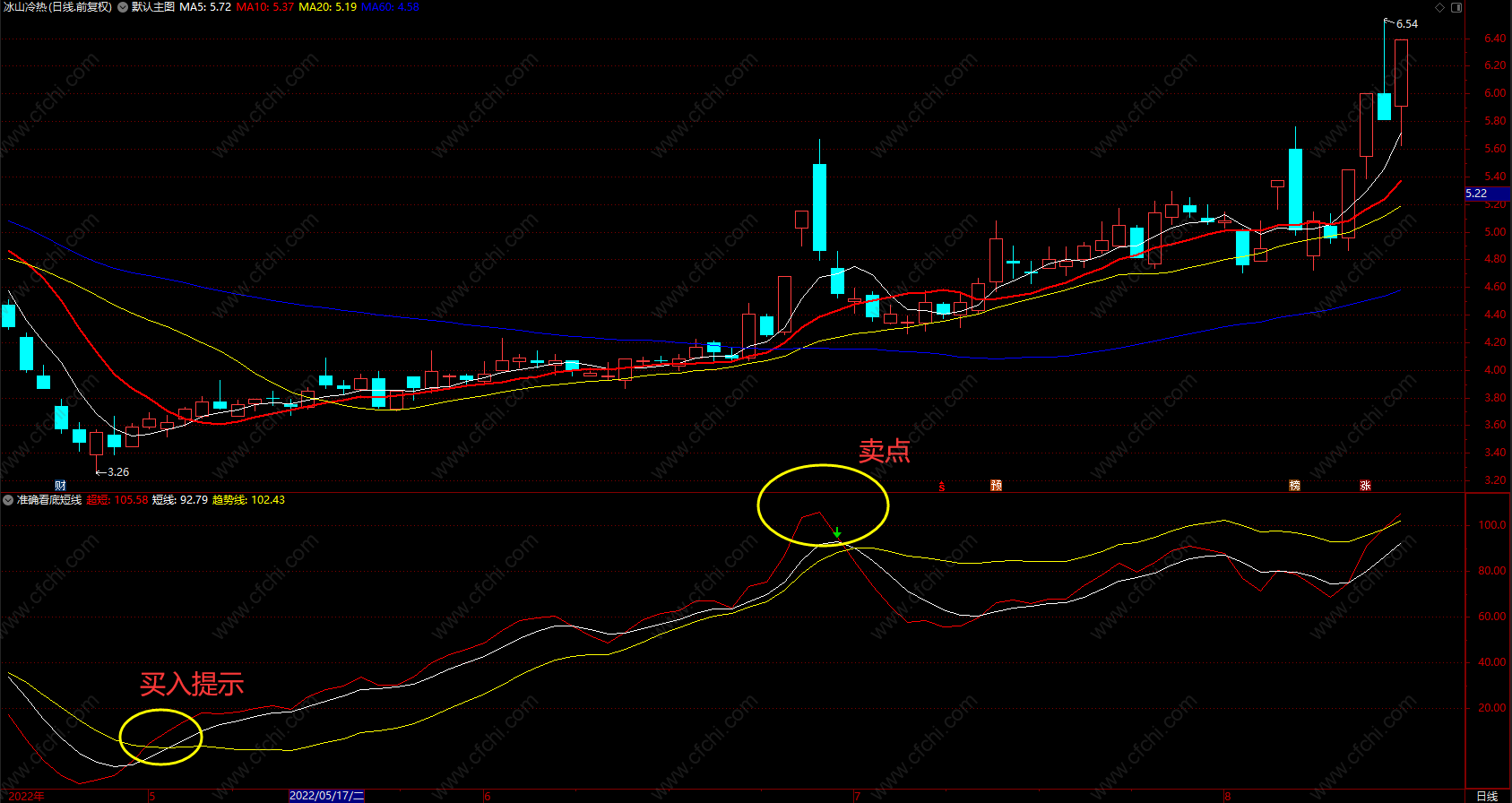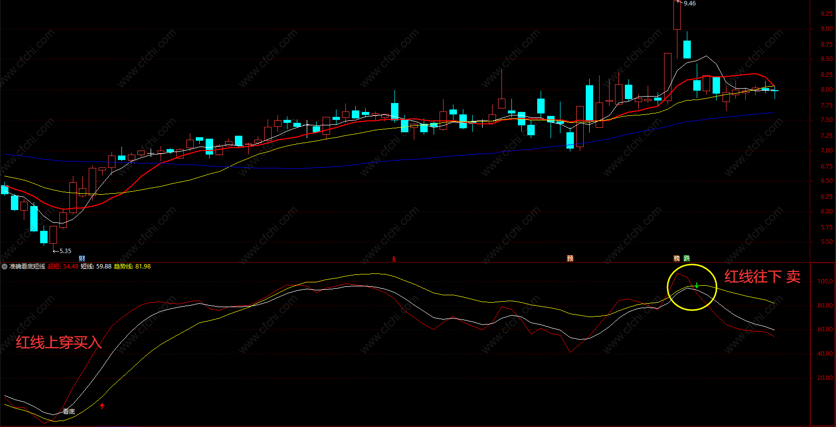 买点:关注红色趋势线的走势,红线上穿白色黄色线之上关注,出现“看底”红色箭头信号,马上买入,会有一波上涨走势!
