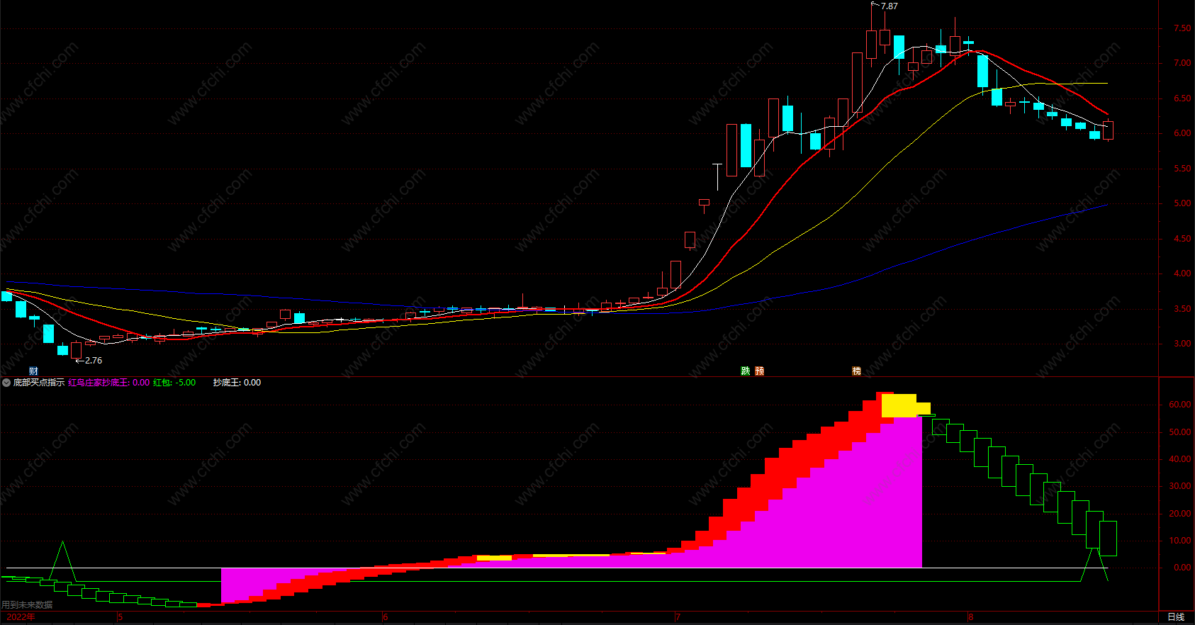 选股1:=-26;抄底:=-40;红鸟庄家抄底王:0,COLORFF00FF,POINTDOT;