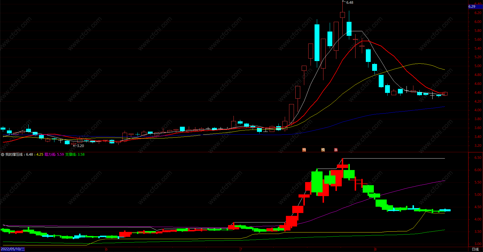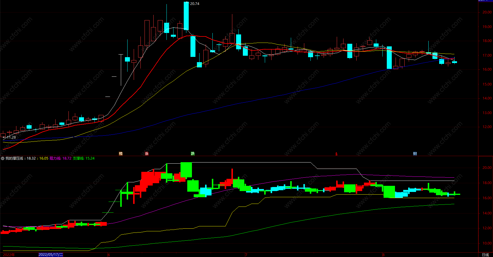 黄线为支撑线,白线为压力线。具体用法与均线类似。