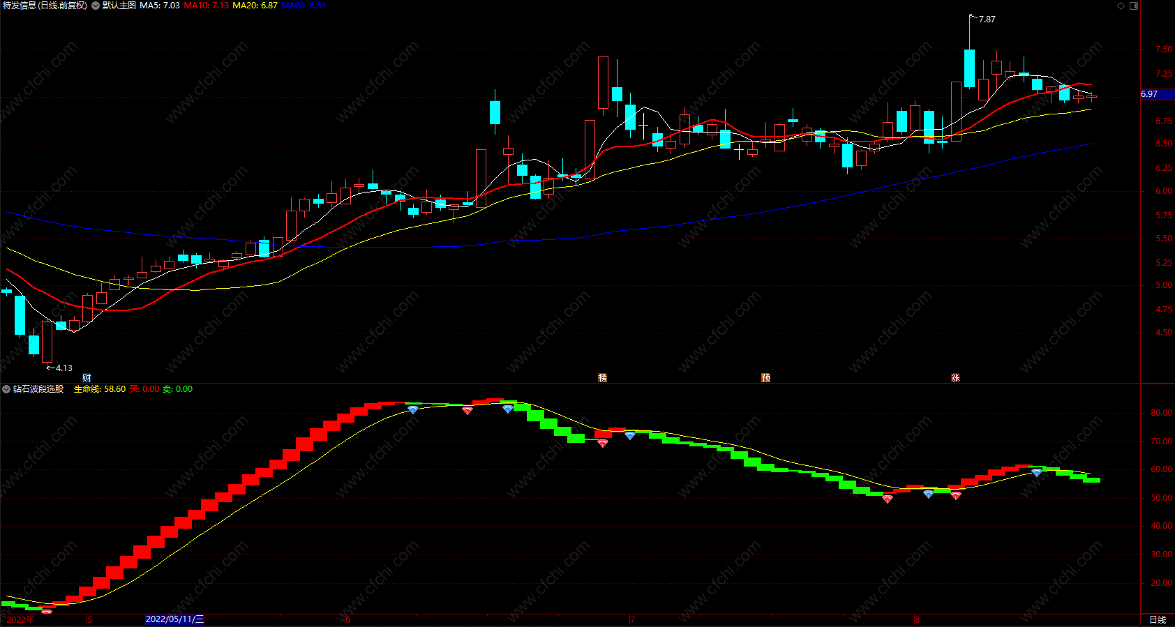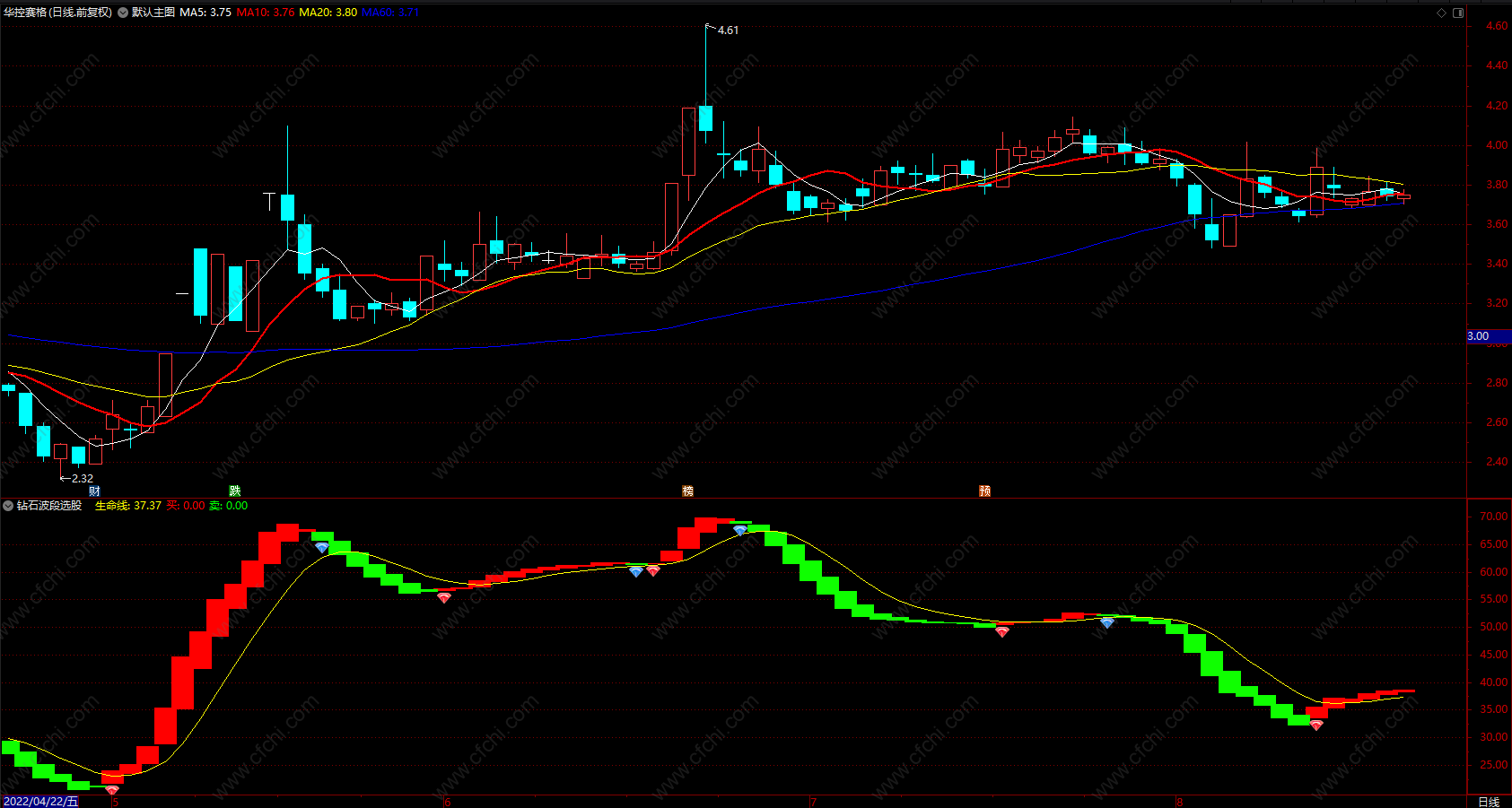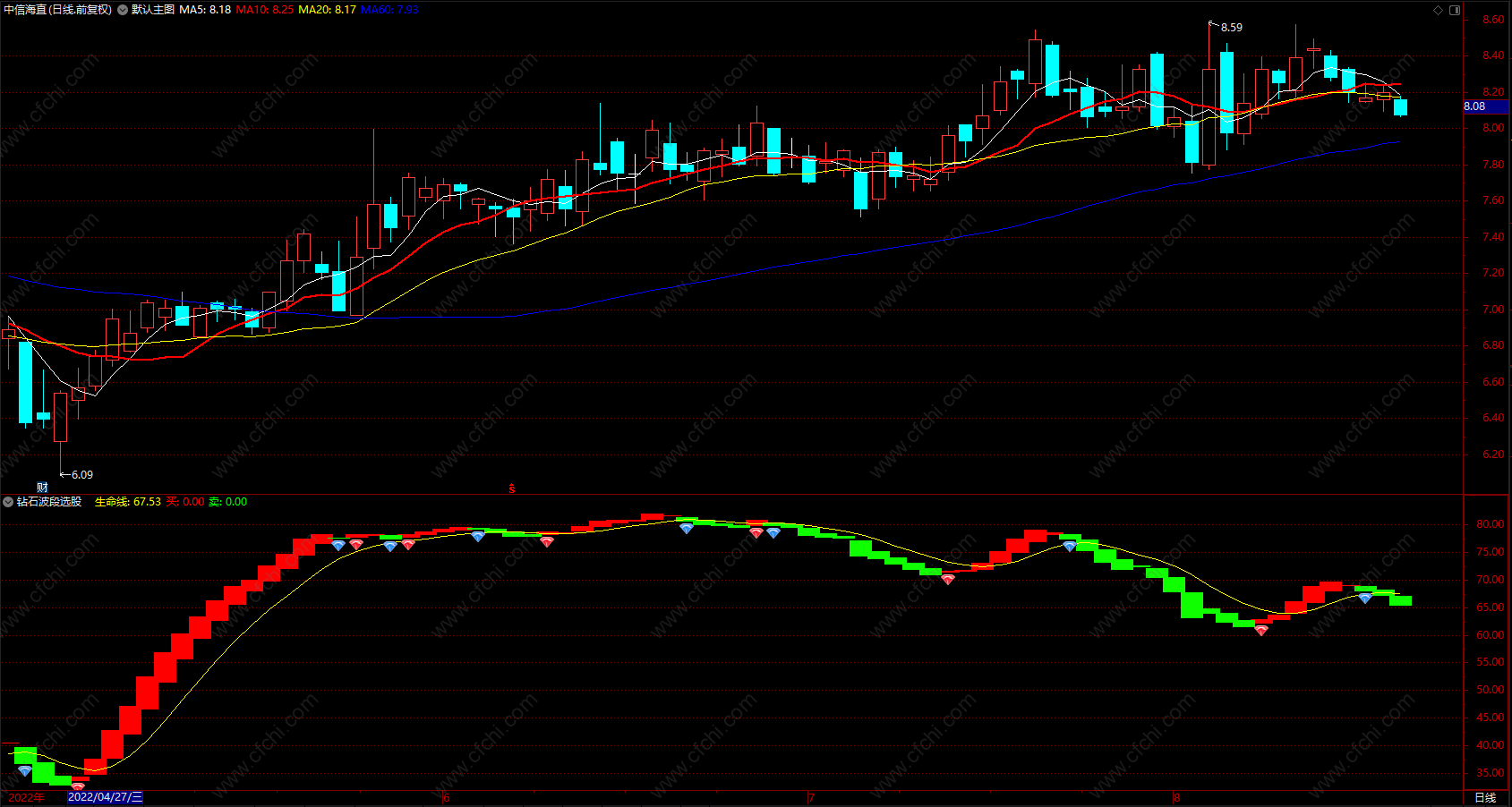 2.生命线在60以上,绿色波段,蓝色钻石出现卖出信号,应该果断卖出。