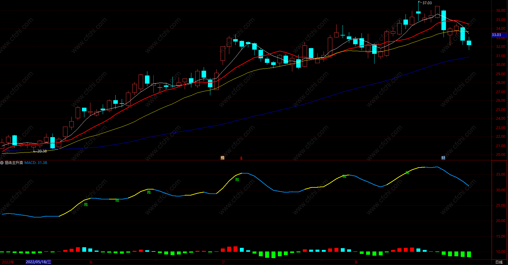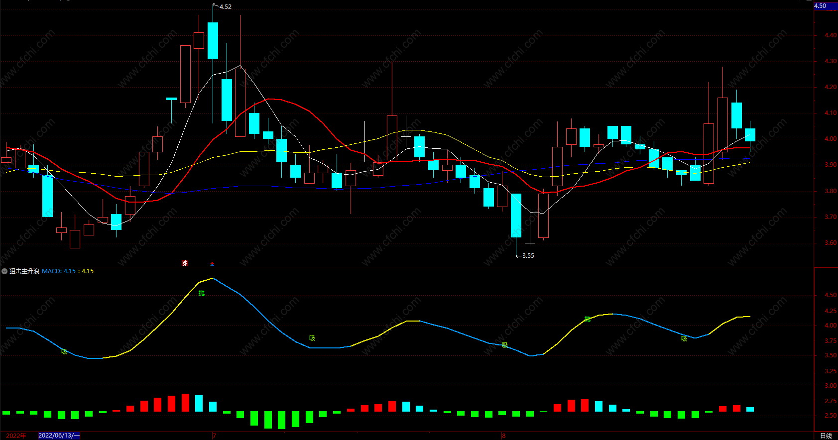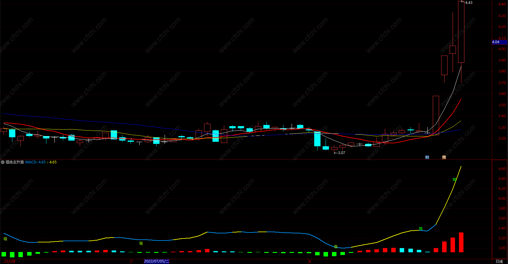 DRAWTEXT(CROSS(ZJ,SJ) AND SJ>70,H+0.05,'抛'),COLORGREEN,LINETHICK3;