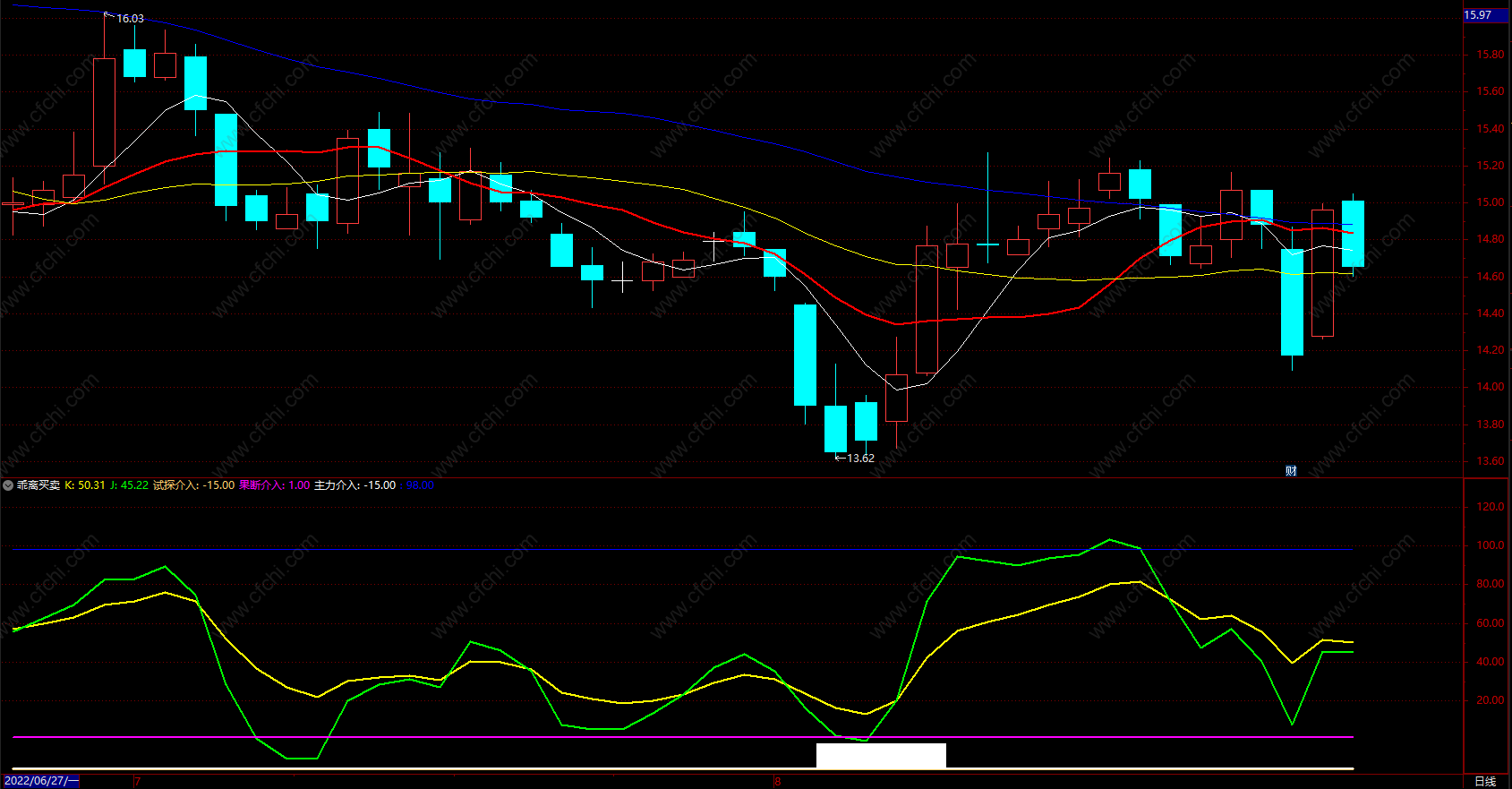 主力介入: IF(CROSS(J,VARB) AND COUNT(VAR5<-16,4)>=1,40,-15),LINETHICK2,COLORWHITE;