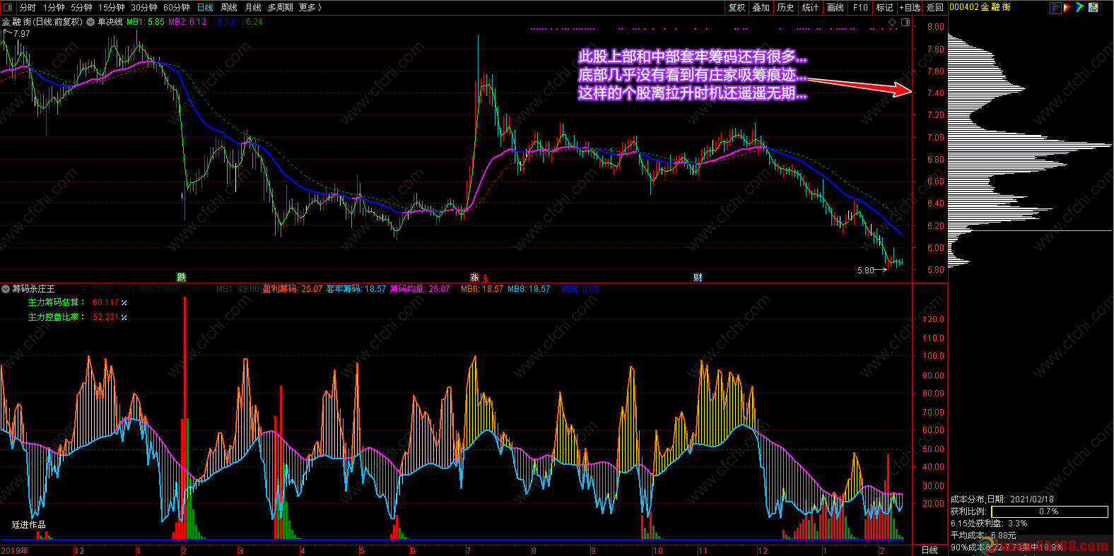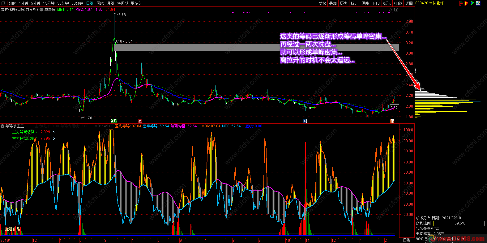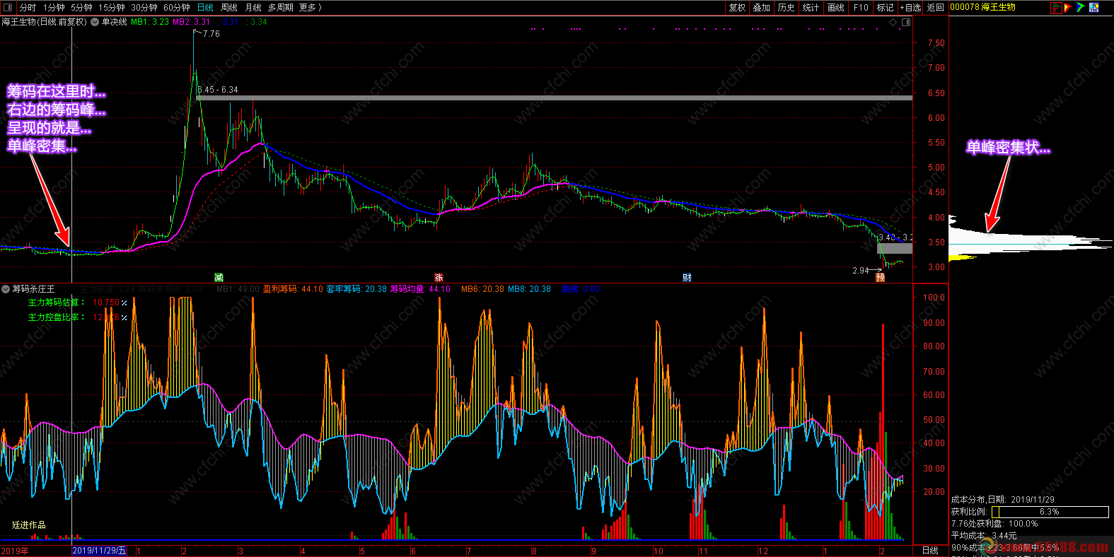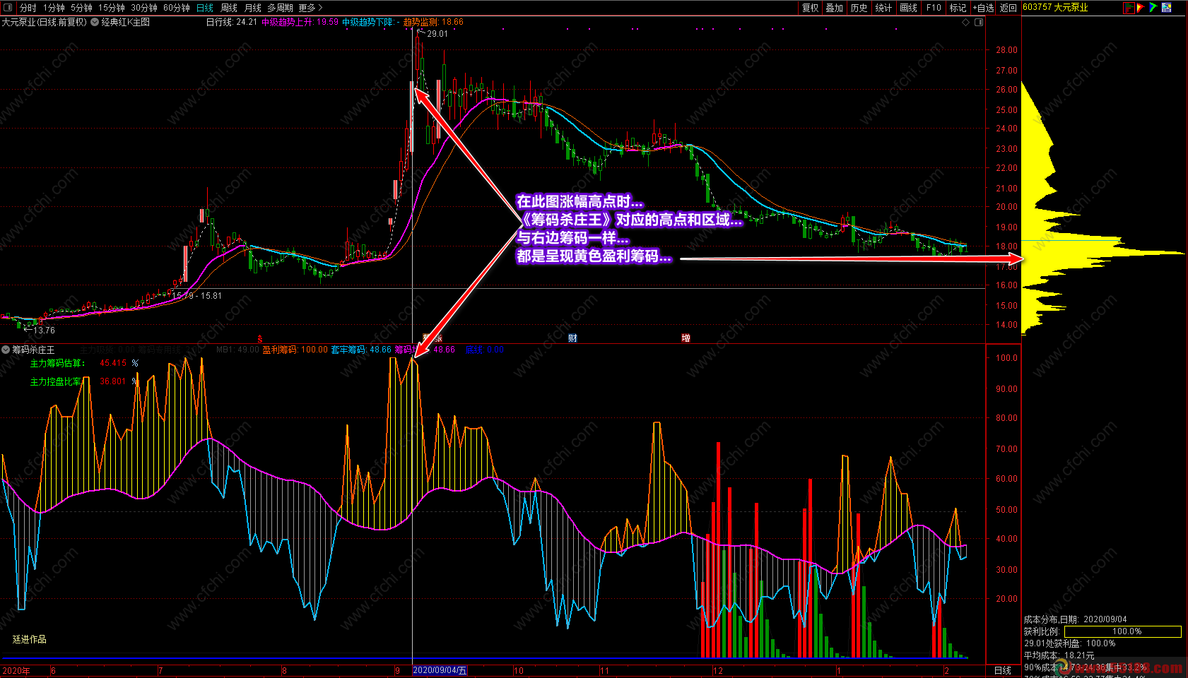 筹码峰的形态及位置形成的因素很多,你首先要正确的认识它,领会它,应用它。在一只个股里它的效应作用也是重要的、真实的且是关键的。《筹码杀庄王》是在参考了多个指标的前题下,利用常用函数代码编写的一个筹码对应指标,虽然不能全面的表示出筹码的密集度及精确位置,但我可以保证的说,对筹码的大致位置及主力筹码的大致取向表现还是相当不错的。特别是指标中表现获利筹码和套牢筹码的黄、白两色柱体,对获利和套牢筹码的表现比较现实精准。对于我们了解两种状态下的行情有较好的把握作用。在下面的截图说明中也列举了几个实例让大家明确的知道筹码的重要性,所以对于一些不会看筹码的新手,或者对于一些老手说句不谦虚的话,也是有帮助和参考意义。我在介入一支个股前是必看一下筹码的结构和分布情况,这在我的一些主题帖子中已经给一些同学讲过多次了。所以,学会看筹码也是提高操作技能的一个重要里程碑。
