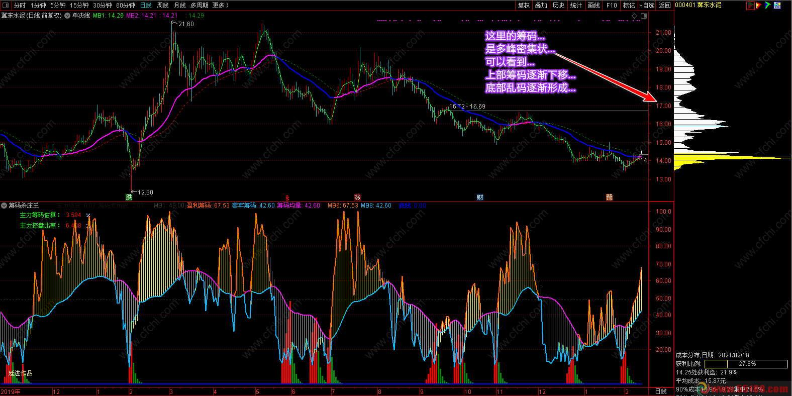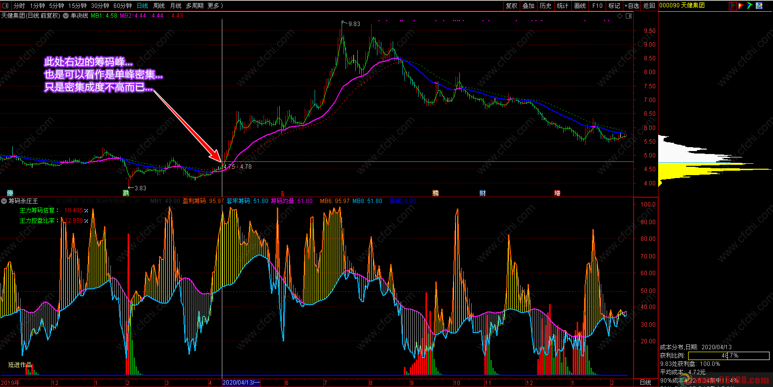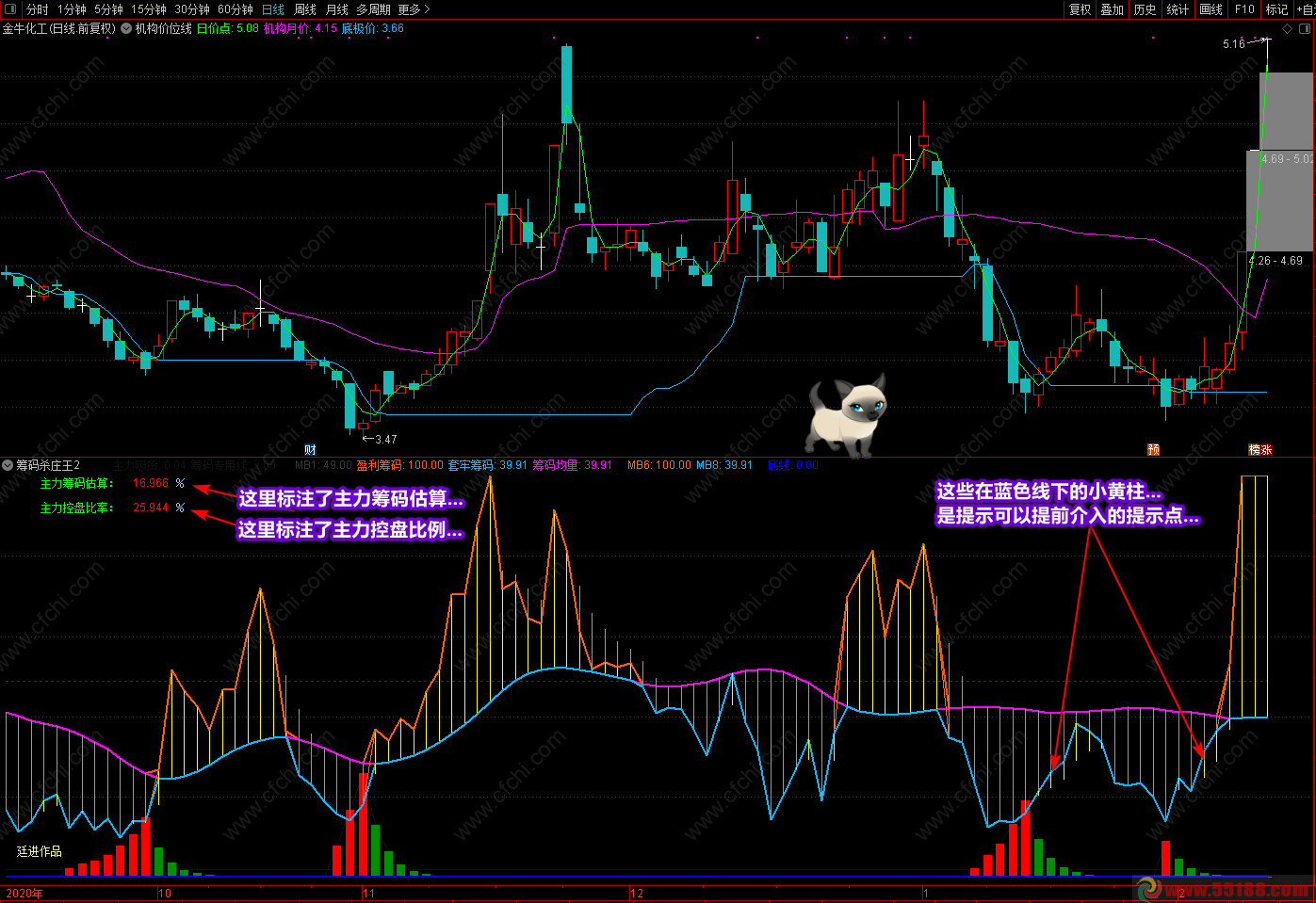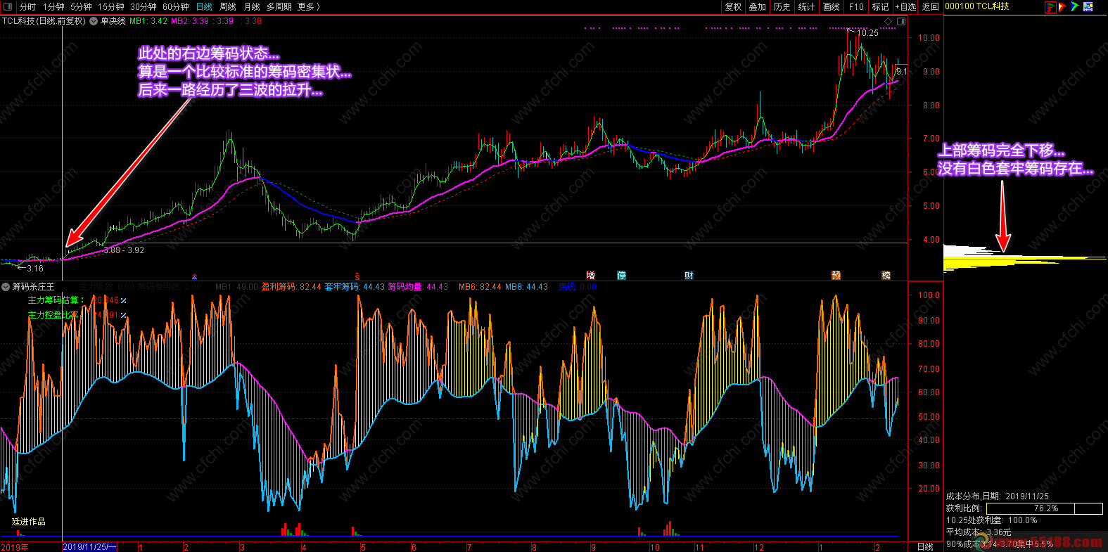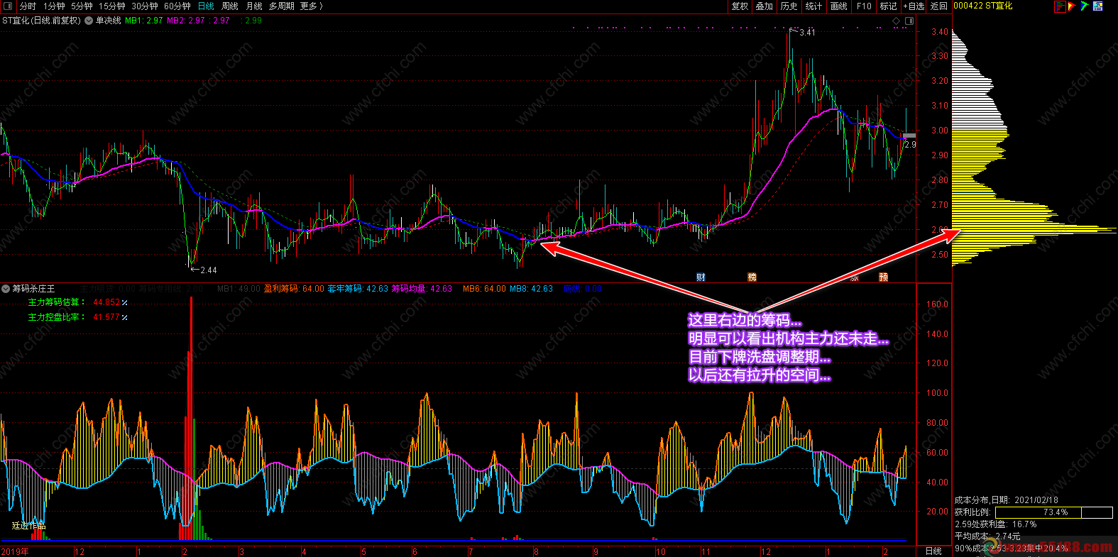 筹码峰的形态及位置形成的因素很多,你首先要正确的认识它,领会它,应用它。在一只个股里它的效应作用也是重要的、真实的且是关键的。《筹码杀庄王》是在参考了多个指标的前题下,利用常用函数代码编写的一个筹码对应指标,虽然不能全面的表示出筹码的密集度及精确位置,但我可以保证的说,对筹码的大致位置及主力筹码的大致取向表现还是相当不错的。特别是指标中表现获利筹码和套牢筹码的黄、白两色柱体,对获利和套牢筹码的表现比较现实精准。对于我们了解两种状态下的行情有较好的把握作用。在下面的截图说明中也列举了几个实例让大家明确的知道筹码的重要性,所以对于一些不会看筹码的新手,或者对于一些老手说句不谦虚的话,也是有帮助和参考意义。我在介入一支个股前是必看一下筹码的结构和分布情况,这在我的一些主题帖子中已经给一些同学讲过多次了。所以,学会看筹码也是提高操作技能的一个重要里程碑。