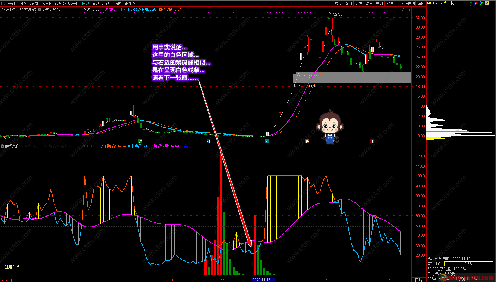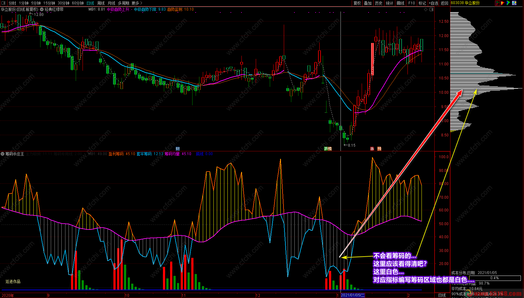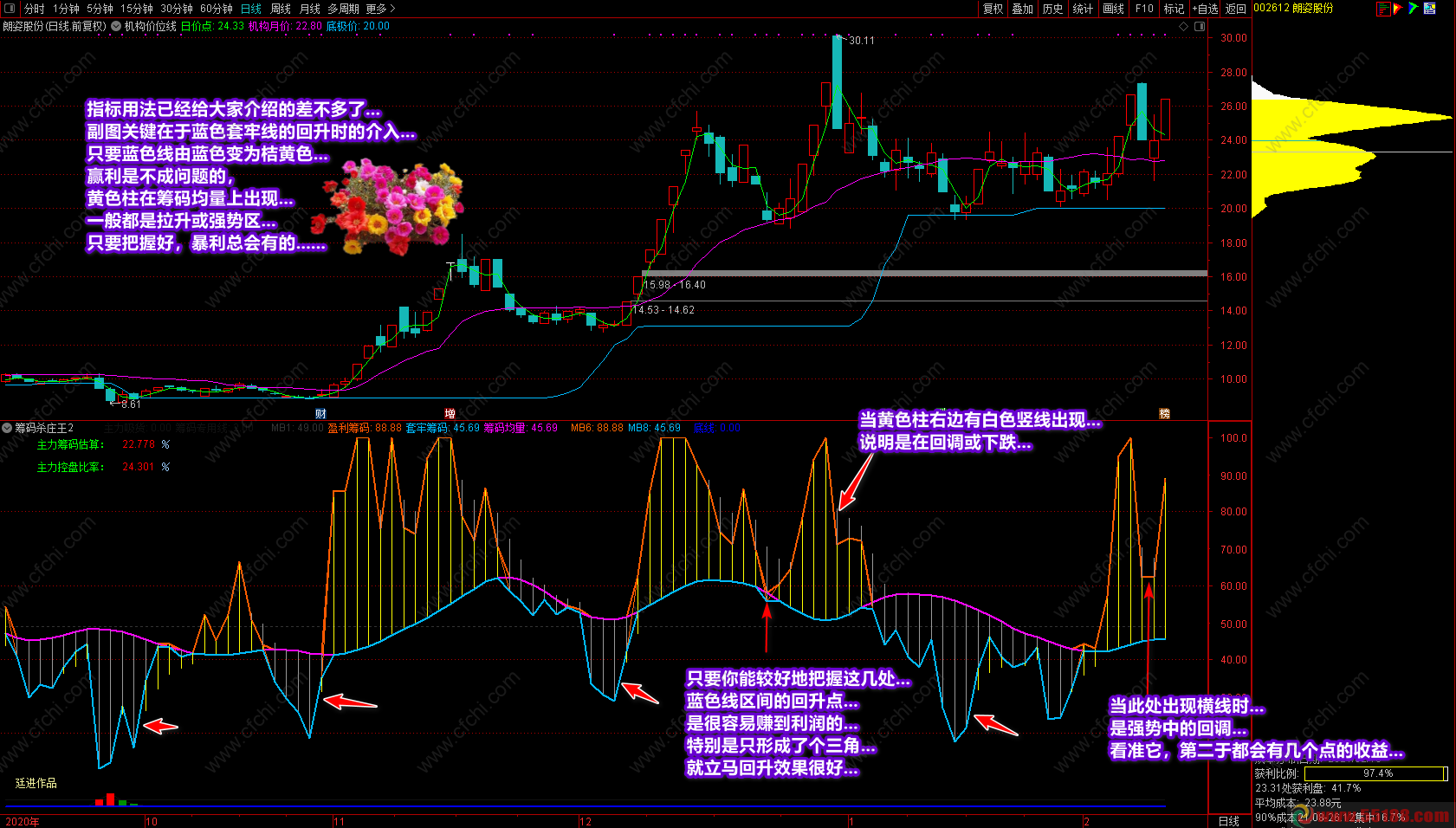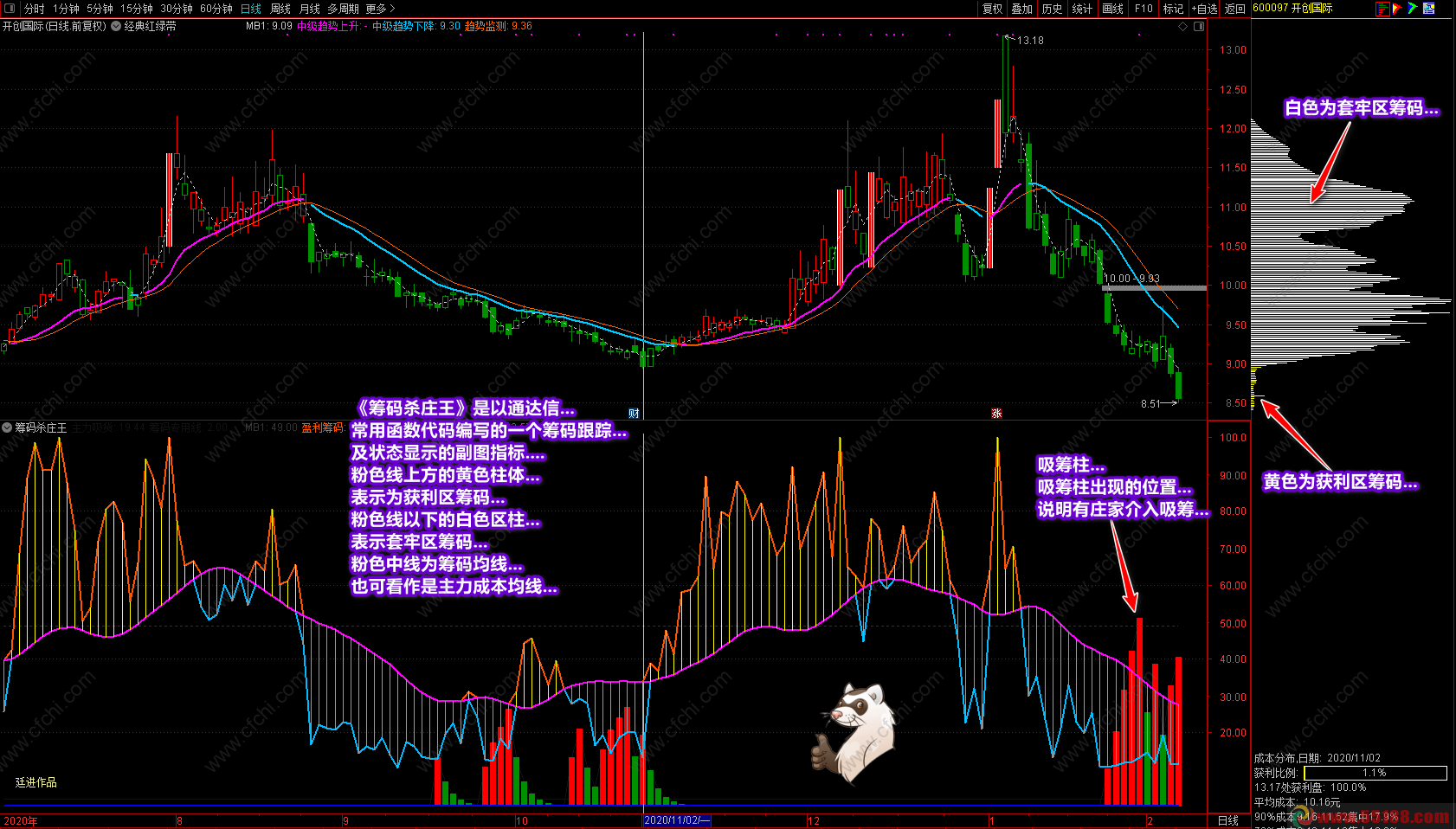 筹码峰的形态及位置形成的因素很多,你首先要正确的认识它,领会它,应用它。在一只个股里它的效应作用也是重要的、真实的且是关键的。《筹码杀庄王》是在参考了多个指标的前题下,利用常用函数代码编写的一个筹码对应指标,虽然不能全面的表示出筹码的密集度及精确位置,但我可以保证的说,对筹码的大致位置及主力筹码的大致取向表现还是相当不错的。特别是指标中表现获利筹码和套牢筹码的黄、白两色柱体,对获利和套牢筹码的表现比较现实精准。对于我们了解两种状态下的行情有较好的把握作用。在下面的截图说明中也列举了几个实例让大家明确的知道筹码的重要性,所以对于一些不会看筹码的新手,或者对于一些老手说句不谦虚的话,也是有帮助和参考意义。我在介入一支个股前是必看一下筹码的结构和分布情况,这在我的一些主题帖子中已经给一些同学讲过多次了。所以,学会看筹码也是提高操作技能的一个重要里程碑。