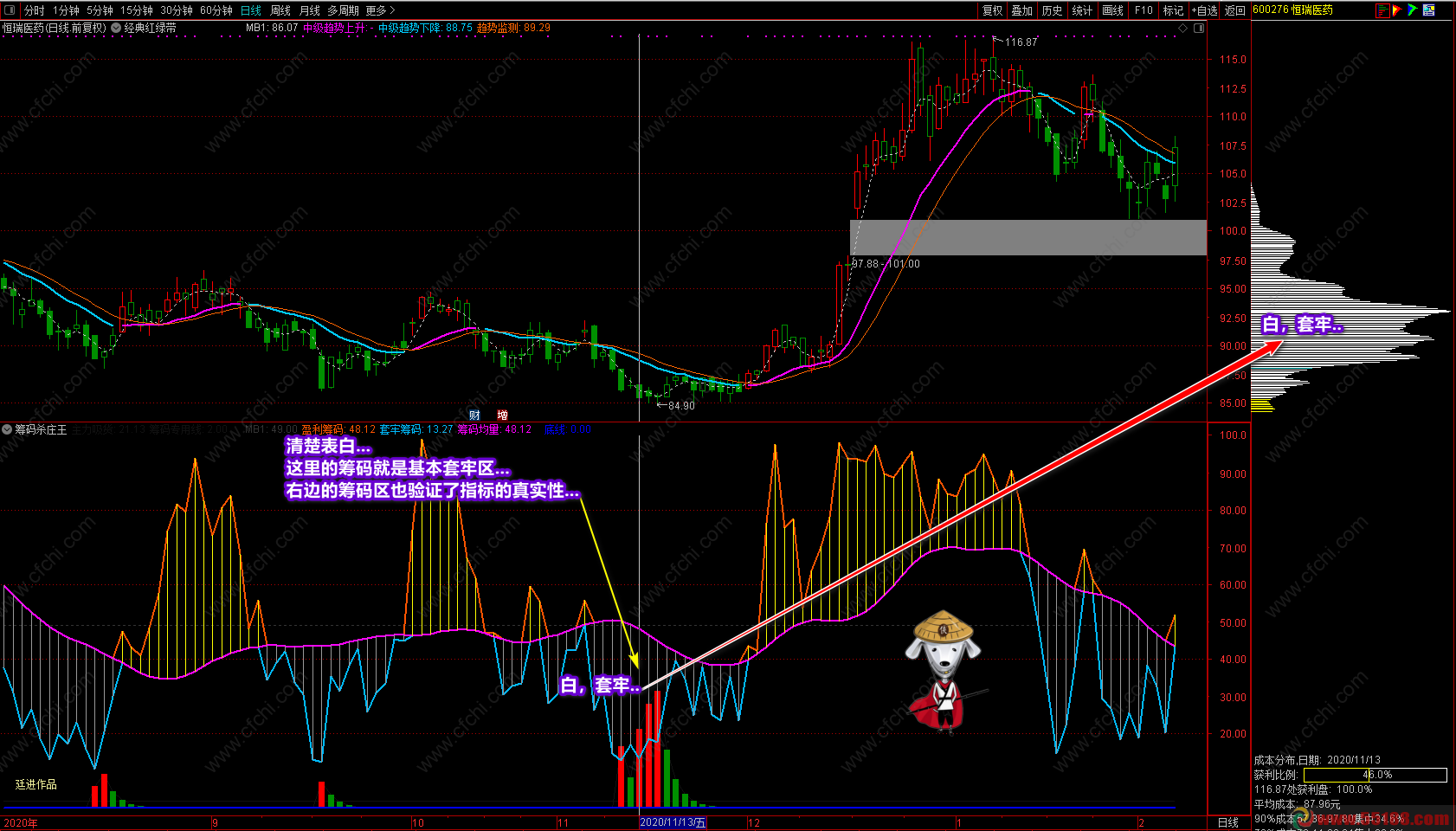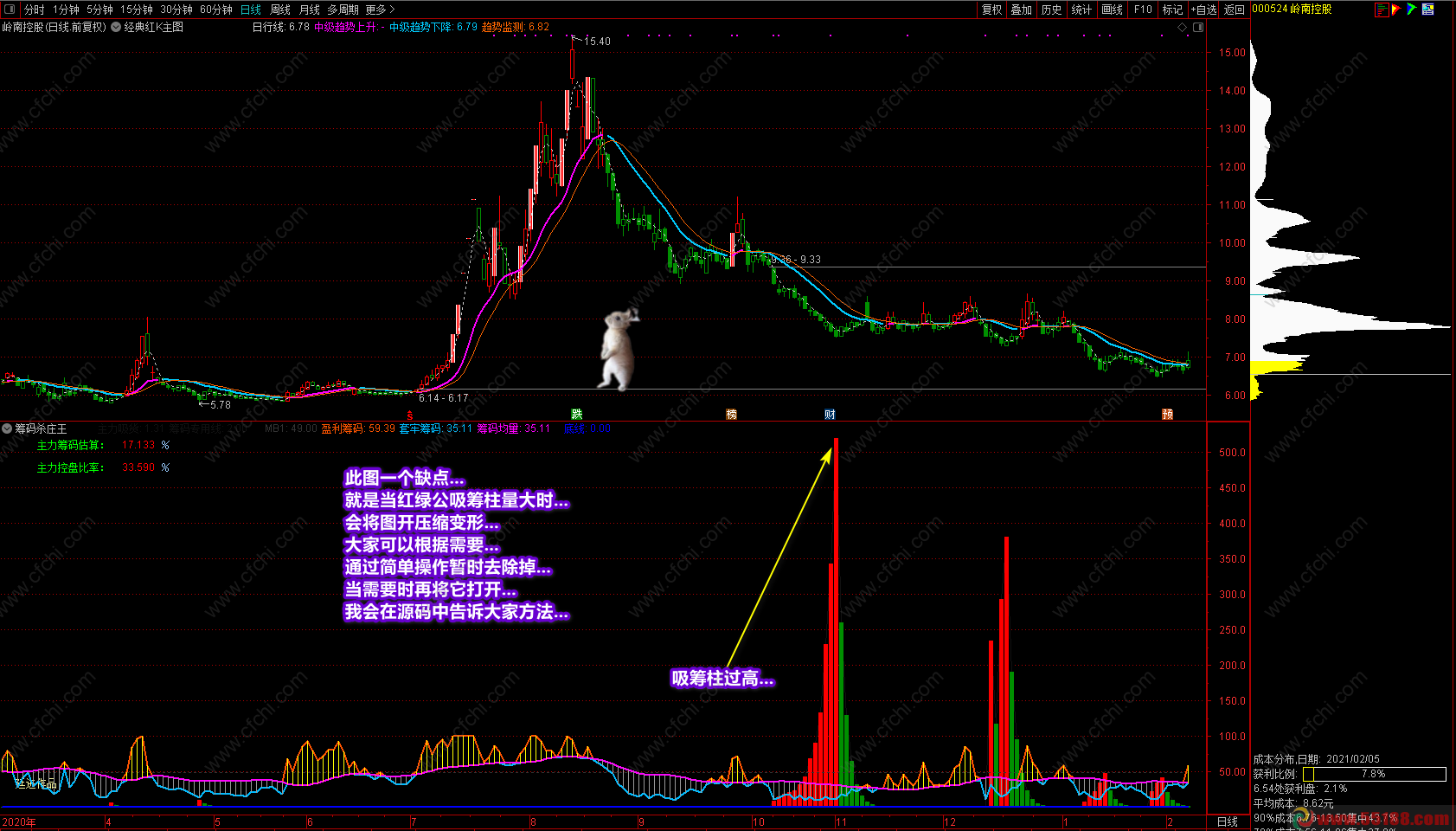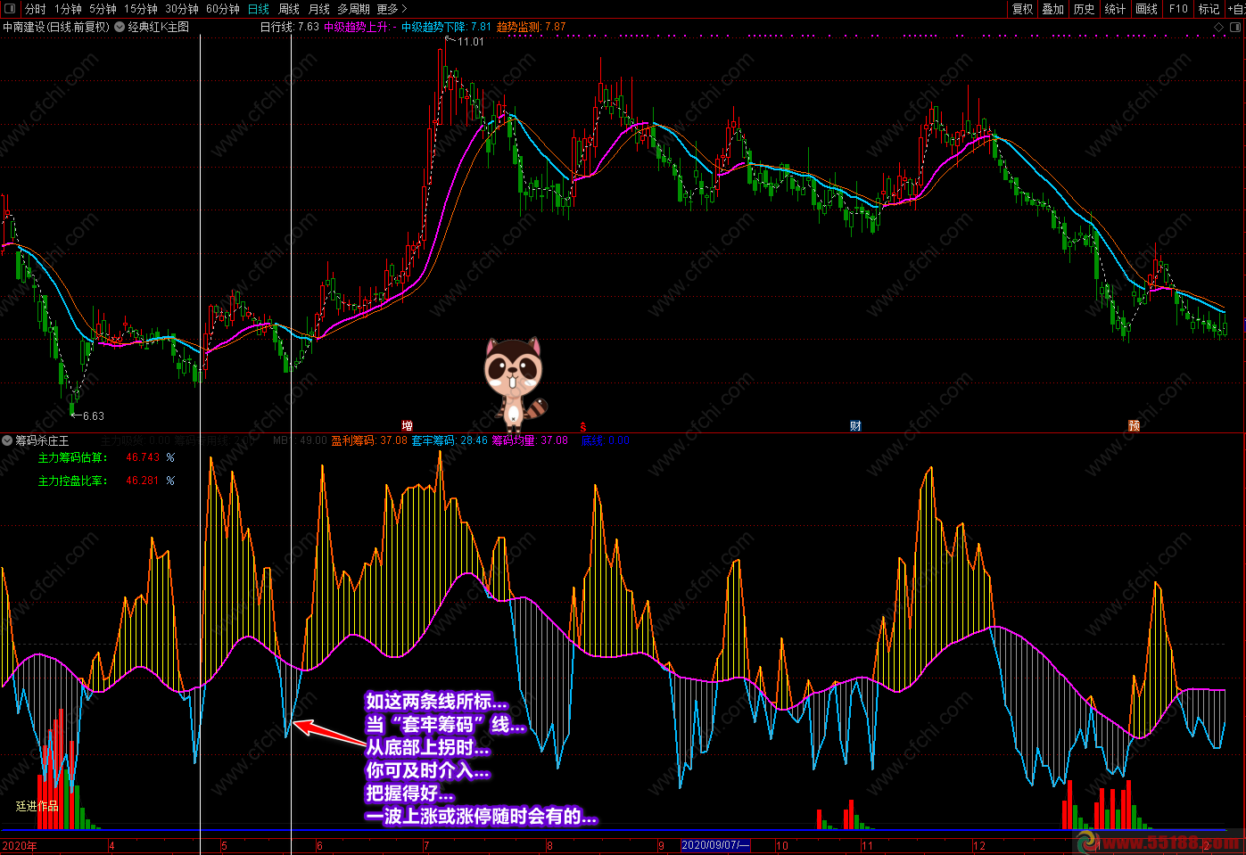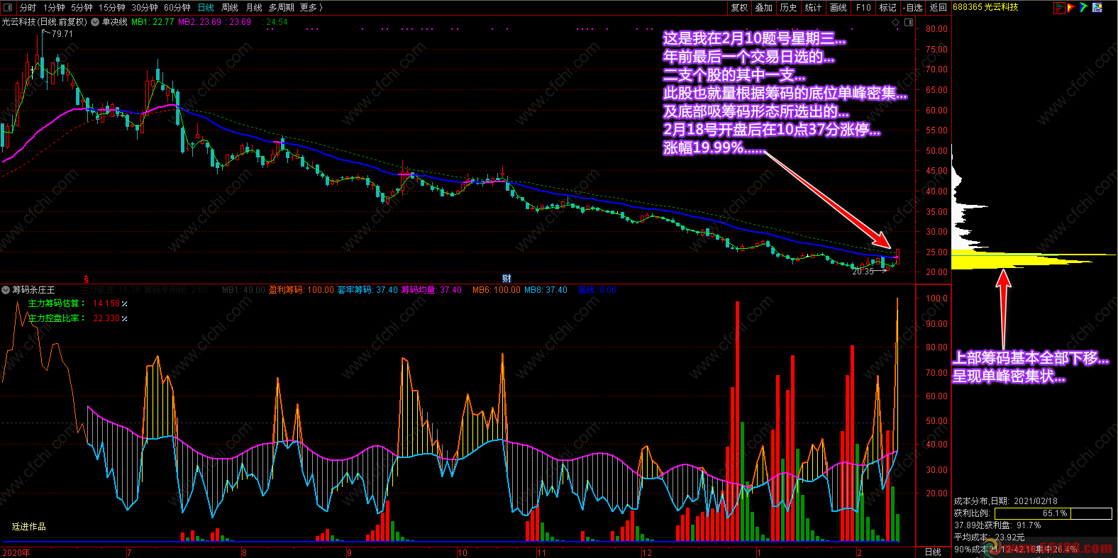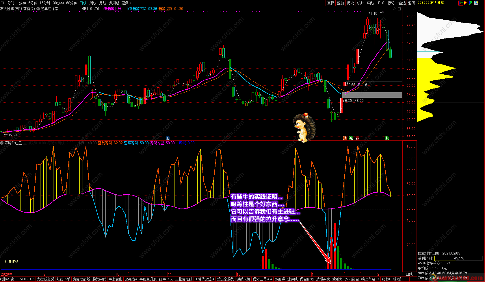 筹码峰的形态及位置形成的因素很多,你首先要正确的认识它,领会它,应用它。在一只个股里它的效应作用也是重要的、真实的且是关键的。《筹码杀庄王》是在参考了多个指标的前题下,利用常用函数代码编写的一个筹码对应指标,虽然不能全面的表示出筹码的密集度及精确位置,但我可以保证的说,对筹码的大致位置及主力筹码的大致取向表现还是相当不错的。特别是指标中表现获利筹码和套牢筹码的黄、白两色柱体,对获利和套牢筹码的表现比较现实精准。对于我们了解两种状态下的行情有较好的把握作用。在下面的截图说明中也列举了几个实例让大家明确的知道筹码的重要性,所以对于一些不会看筹码的新手,或者对于一些老手说句不谦虚的话,也是有帮助和参考意义。我在介入一支个股前是必看一下筹码的结构和分布情况,这在我的一些主题帖子中已经给一些同学讲过多次了。所以,学会看筹码也是提高操作技能的一个重要里程碑。