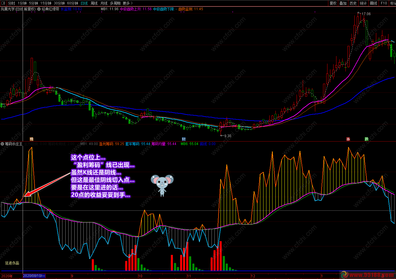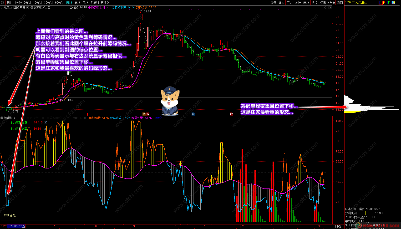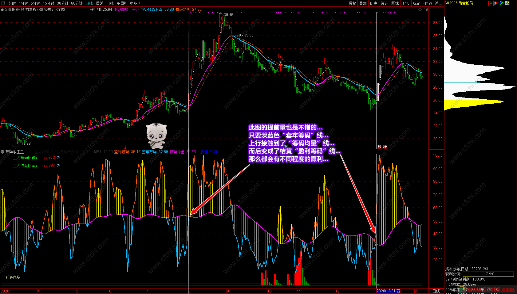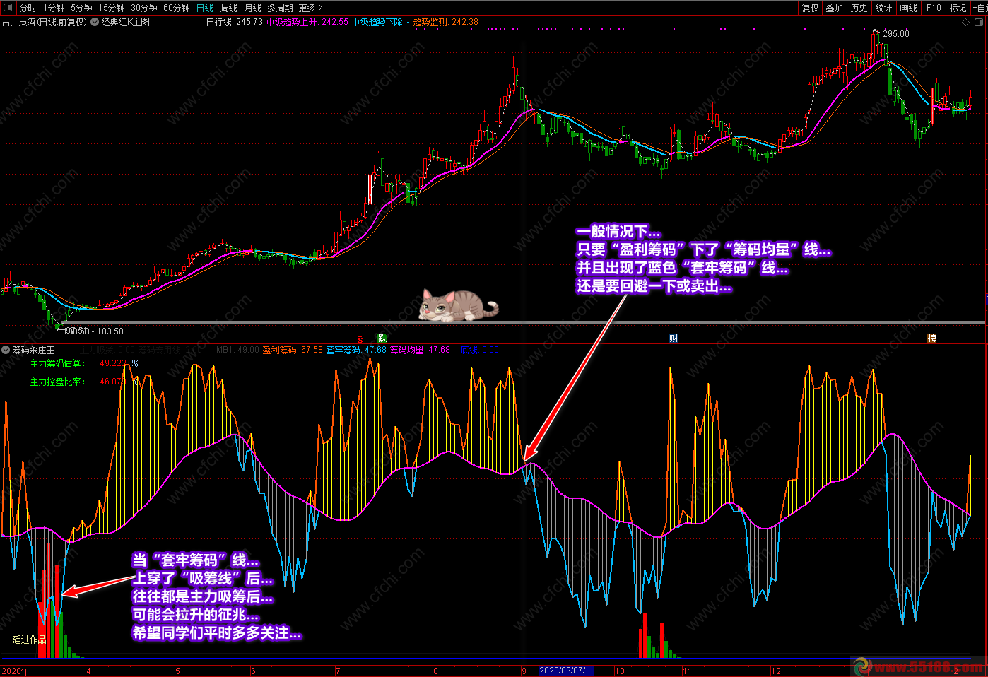 筹码峰的形态及位置形成的因素很多,你首先要正确的认识它,领会它,应用它。在一只个股里它的效应作用也是重要的、真实的且是关键的。《筹码杀庄王》是在参考了多个指标的前题下,利用常用函数代码编写的一个筹码对应指标,虽然不能全面的表示出筹码的密集度及精确位置,但我可以保证的说,对筹码的大致位置及主力筹码的大致取向表现还是相当不错的。特别是指标中表现获利筹码和套牢筹码的黄、白两色柱体,对获利和套牢筹码的表现比较现实精准。对于我们了解两种状态下的行情有较好的把握作用。在下面的截图说明中也列举了几个实例让大家明确的知道筹码的重要性,所以对于一些不会看筹码的新手,或者对于一些老手说句不谦虚的话,也是有帮助和参考意义。我在介入一支个股前是必看一下筹码的结构和分布情况,这在我的一些主题帖子中已经给一些同学讲过多次了。所以,学会看筹码也是提高操作技能的一个重要里程碑。