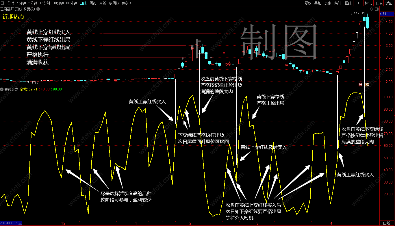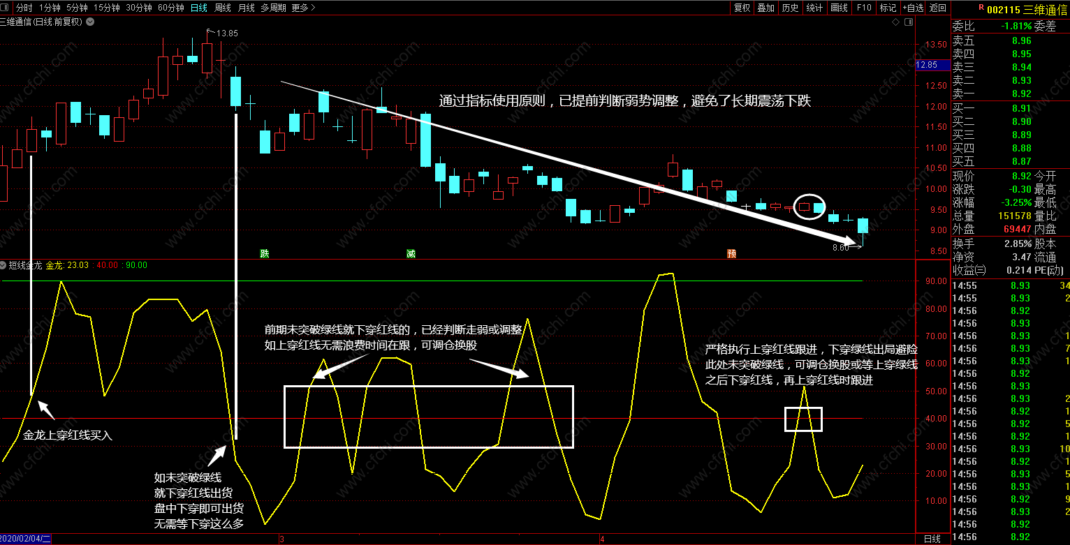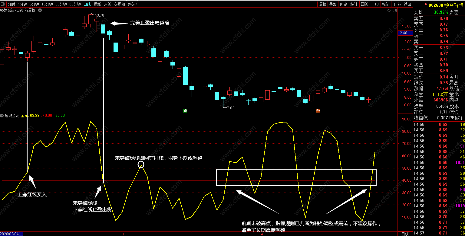 2、可以配合好一点的顶底指标来确认大概底部后,配合金龙上穿红线或在红线之上的再介入。