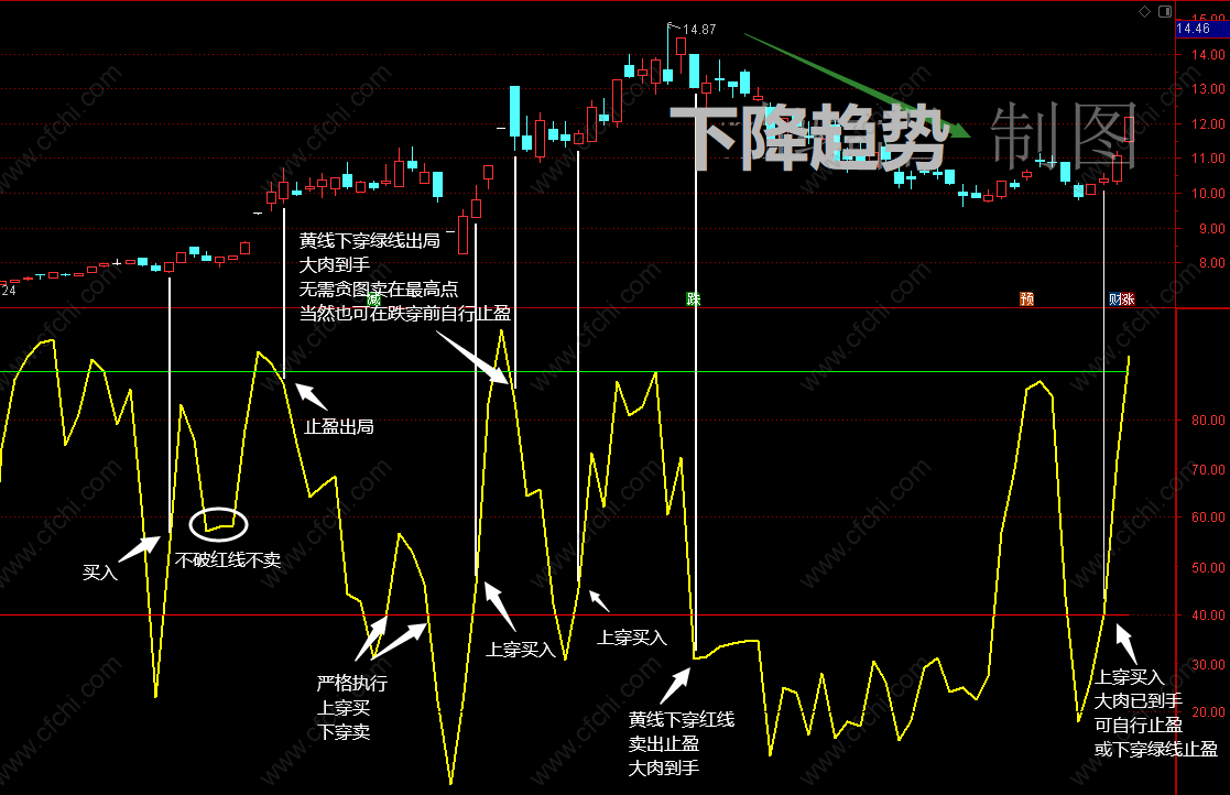 下穿红线:下穿红线后半小时内如收不回线上,或下午收盘前还在下穿状态,就需要出局避险。大部分都是在高点了。