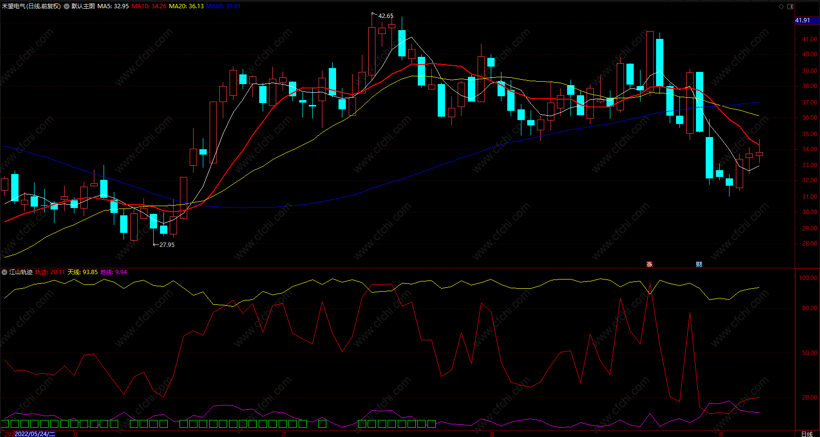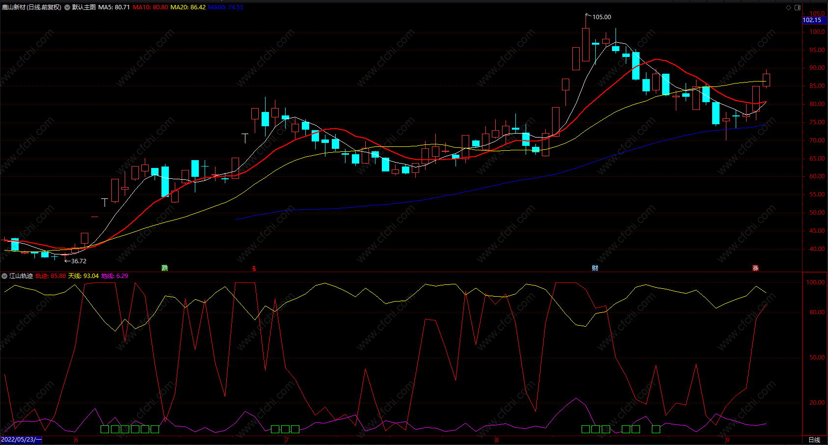 红色轨迹线上穿玫红色地线可作为买点,红色线上穿黄色天线上涨趋势!红线下穿天机线则下跌!