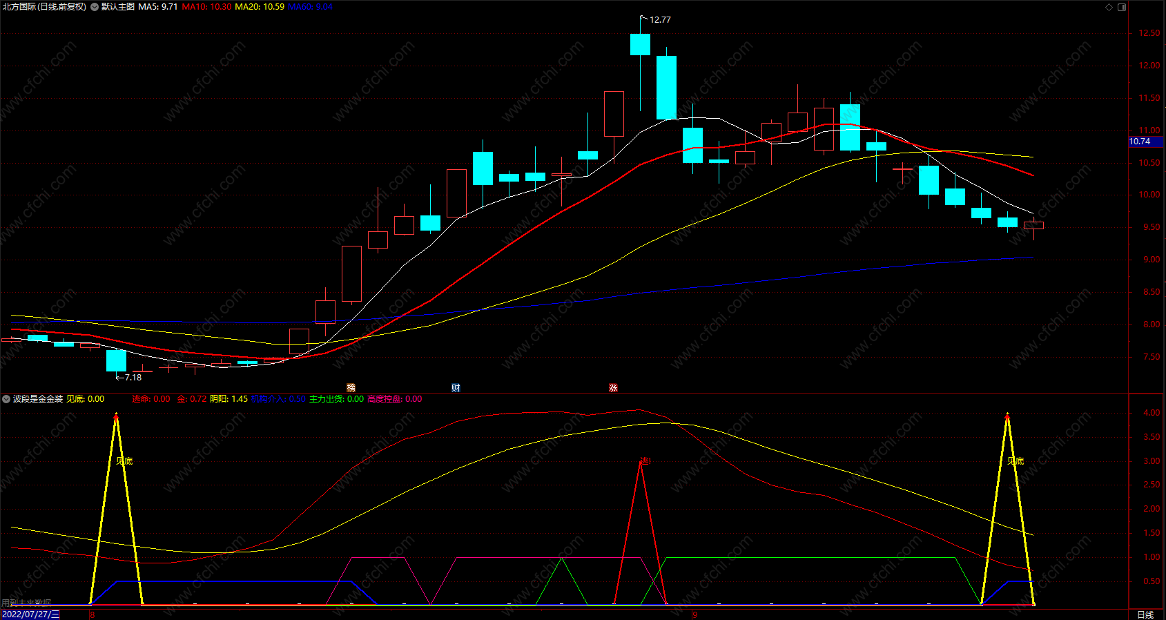 黄色线上穿红线,黄色三角形信号买入,红色线下穿黄线,红绿三角形“逃”卖出;