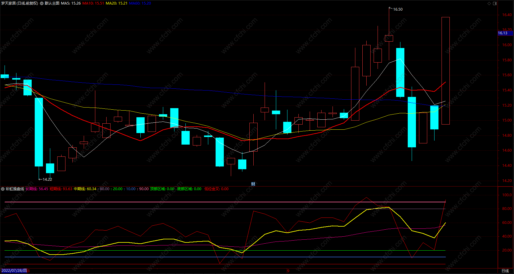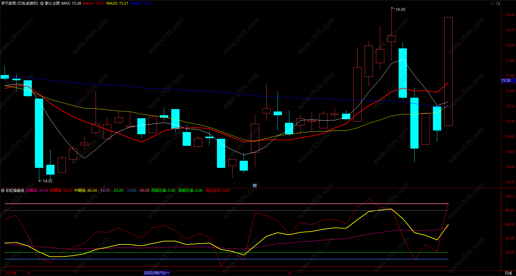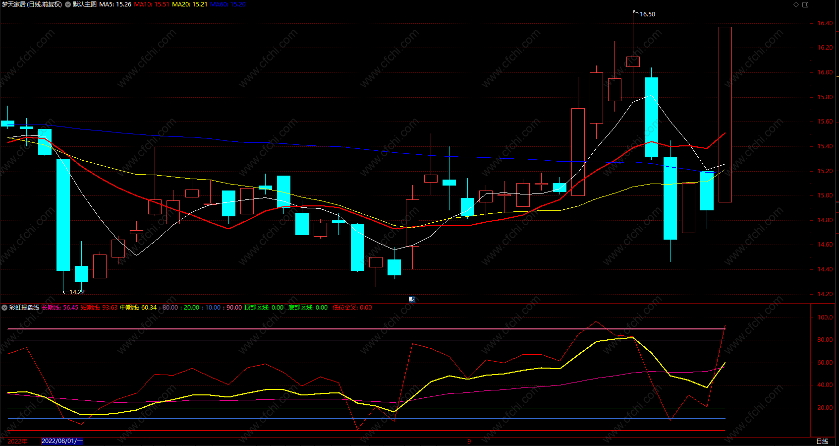 顶部区域:(中期线<REF(中期线,1) AND REF(中期线,1)>80) AND (REF(短期线,1)>95 OR REF(短期线,2)>95 ) AND 长期线>60 AND 短期线<83.5