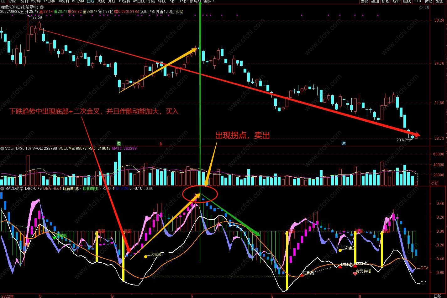 3、稳健的可以选择白线拐头向上,或上穿橘色线之后出现的信号(周金叉)。