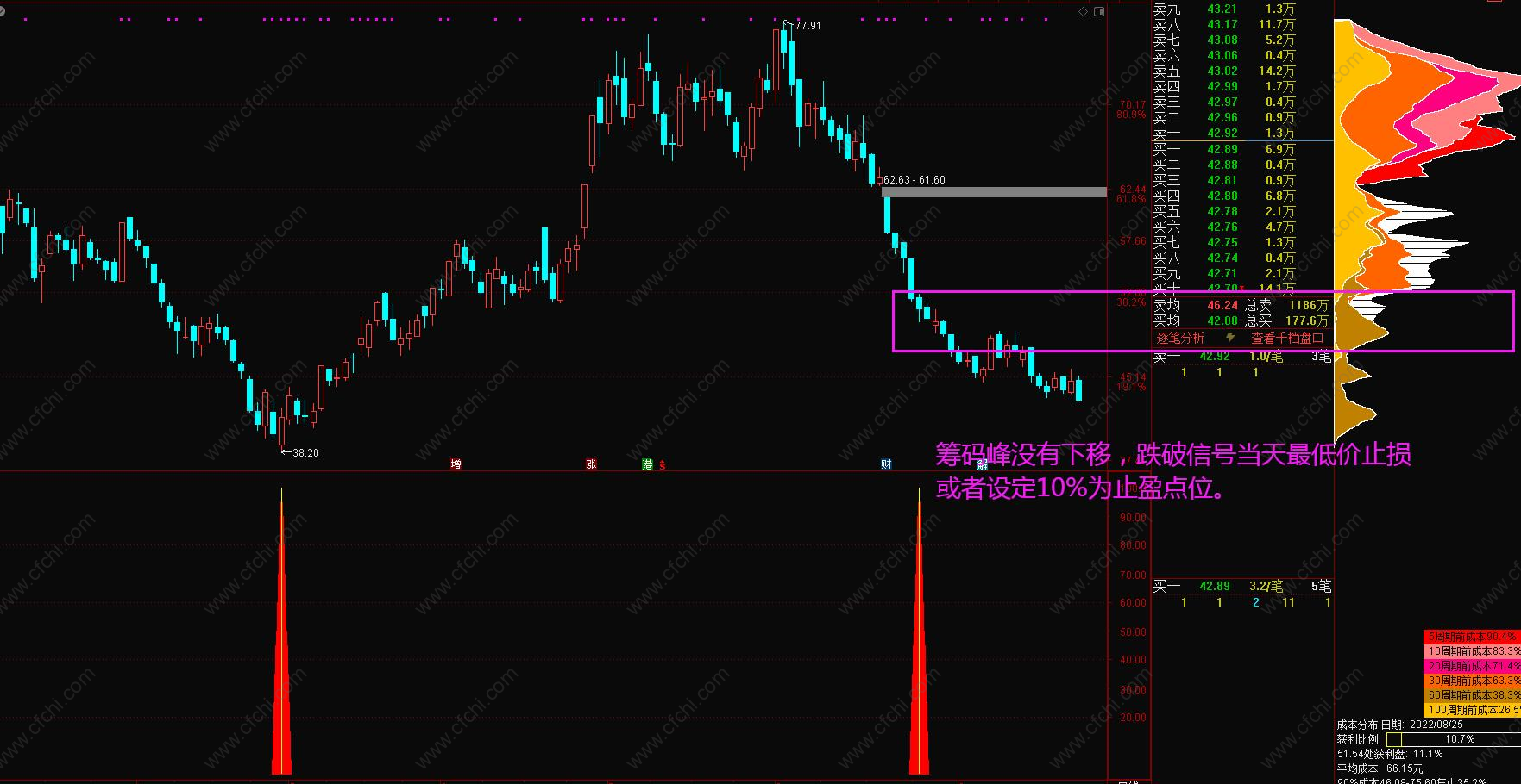 3、下跌到支撑平台,筹码峰跟着下移的优先。