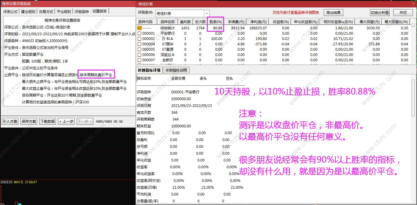 本指标10天周期以收盘价平盘10%止盈止损的成功率为80.88%,