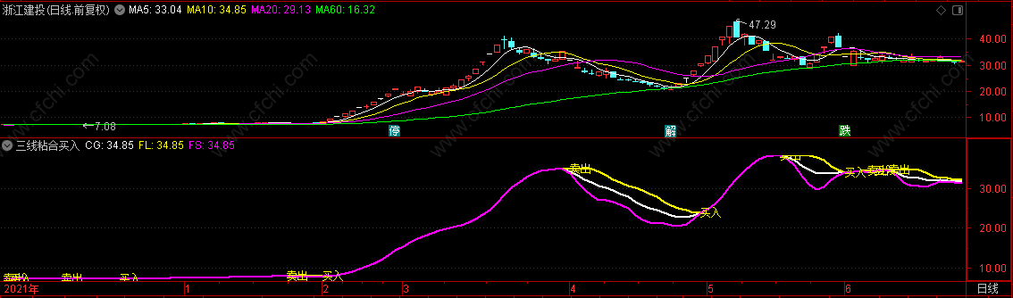 三线粘合买入指标使用方法: