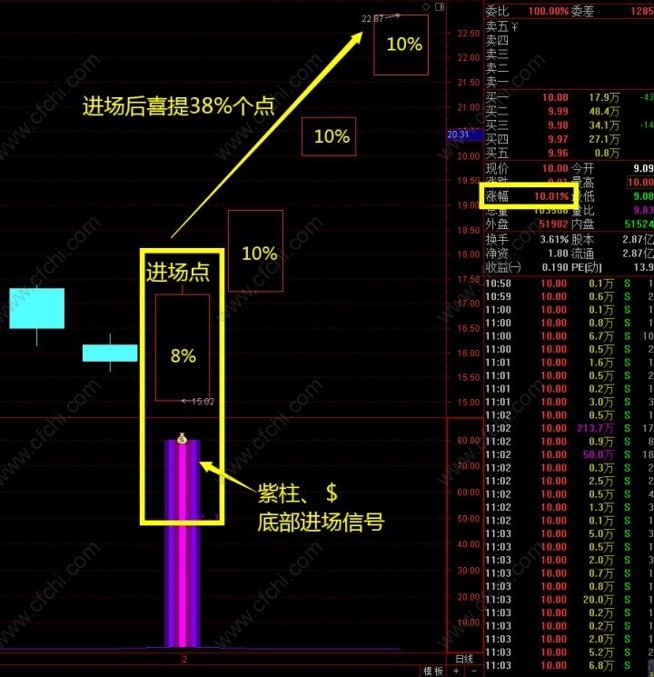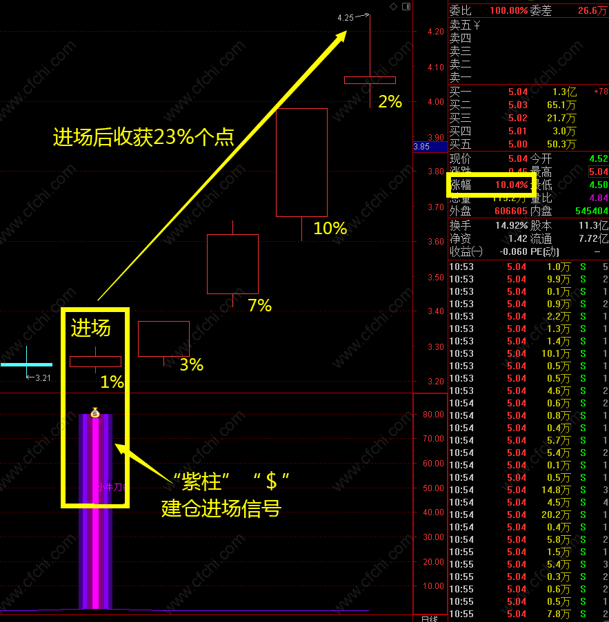 1.出现“紫柱”“$”信号出现提示时即可进场