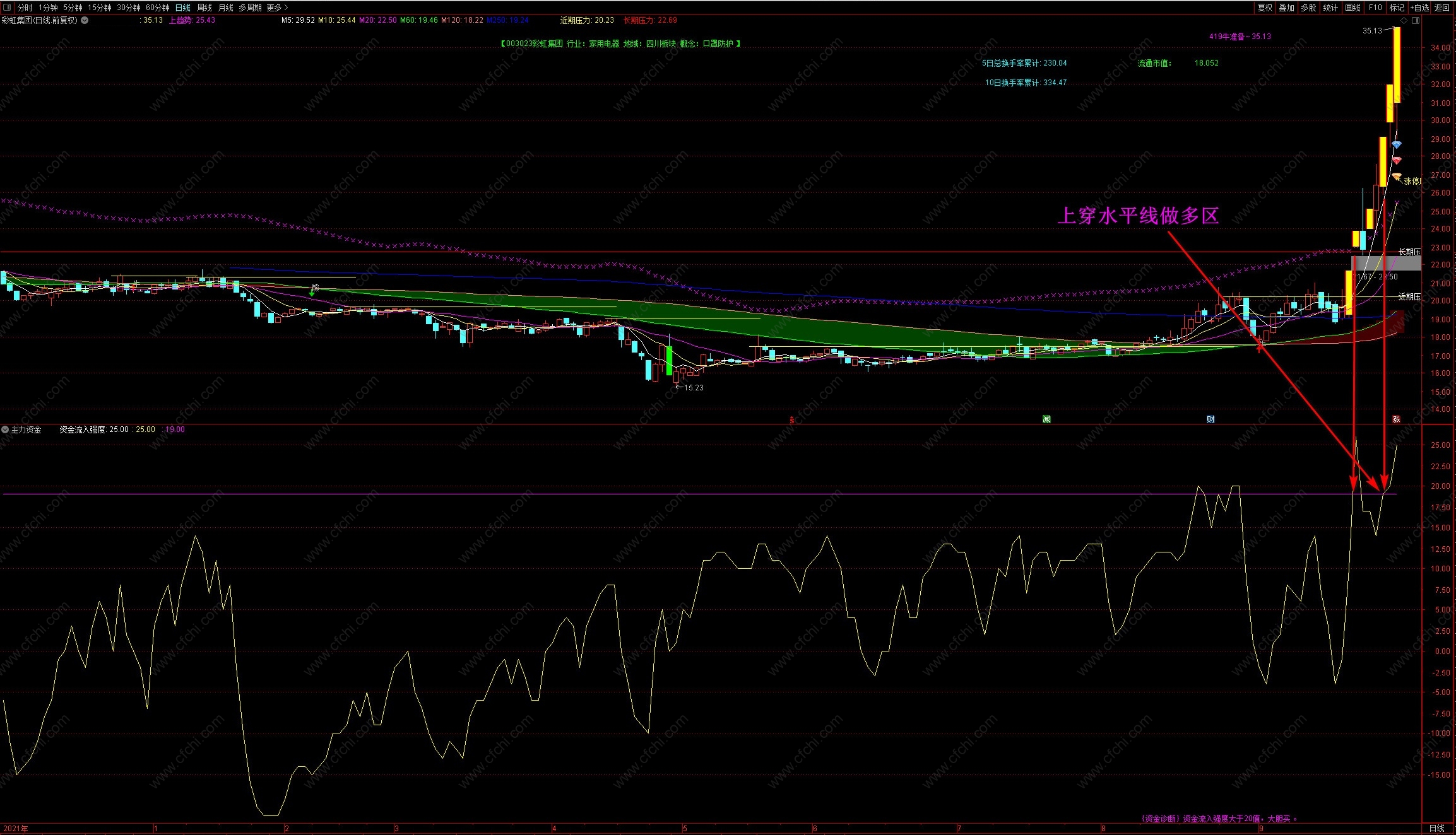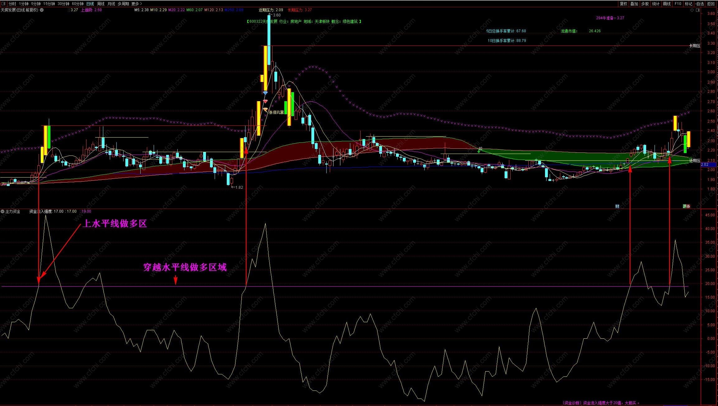 1、本指标包含:1个副图+1个选股指标, 主要原理是以主力线上穿水平线做多区域买入。