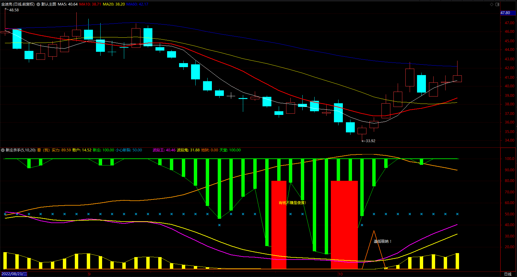 DRAWTEXT(CROSS(波段王,波段鬼) AND 波段王<40,25,'逢低吸呐 !'),COLORWHITE , ;