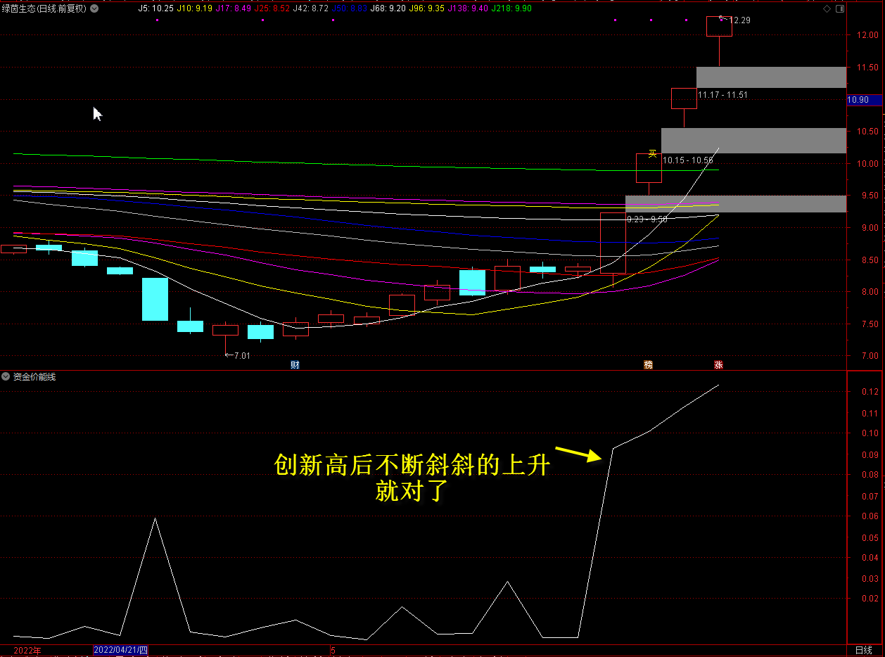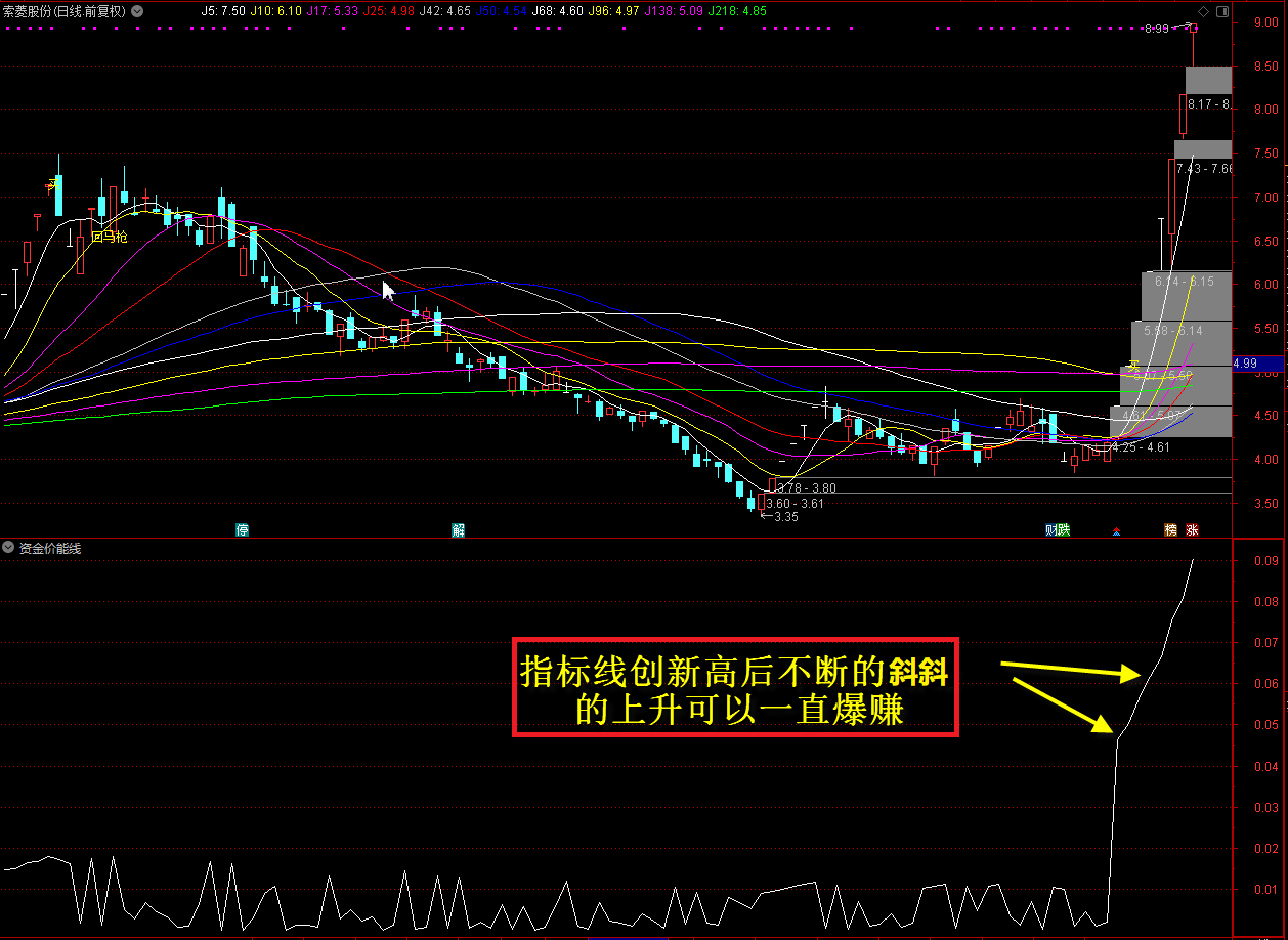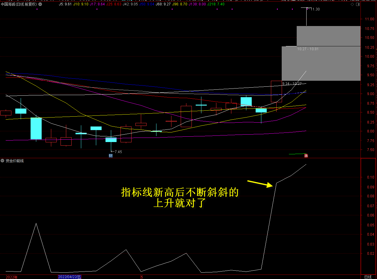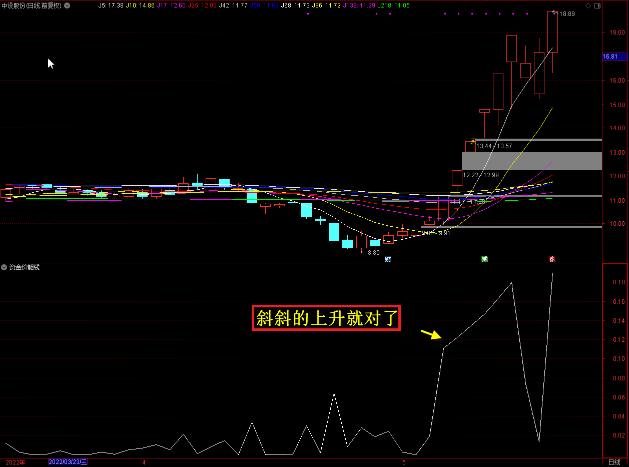 资金价能线创新高后,指标成45°∠向上爬升;斜斜的向上证明股票的坚挺、强劲;