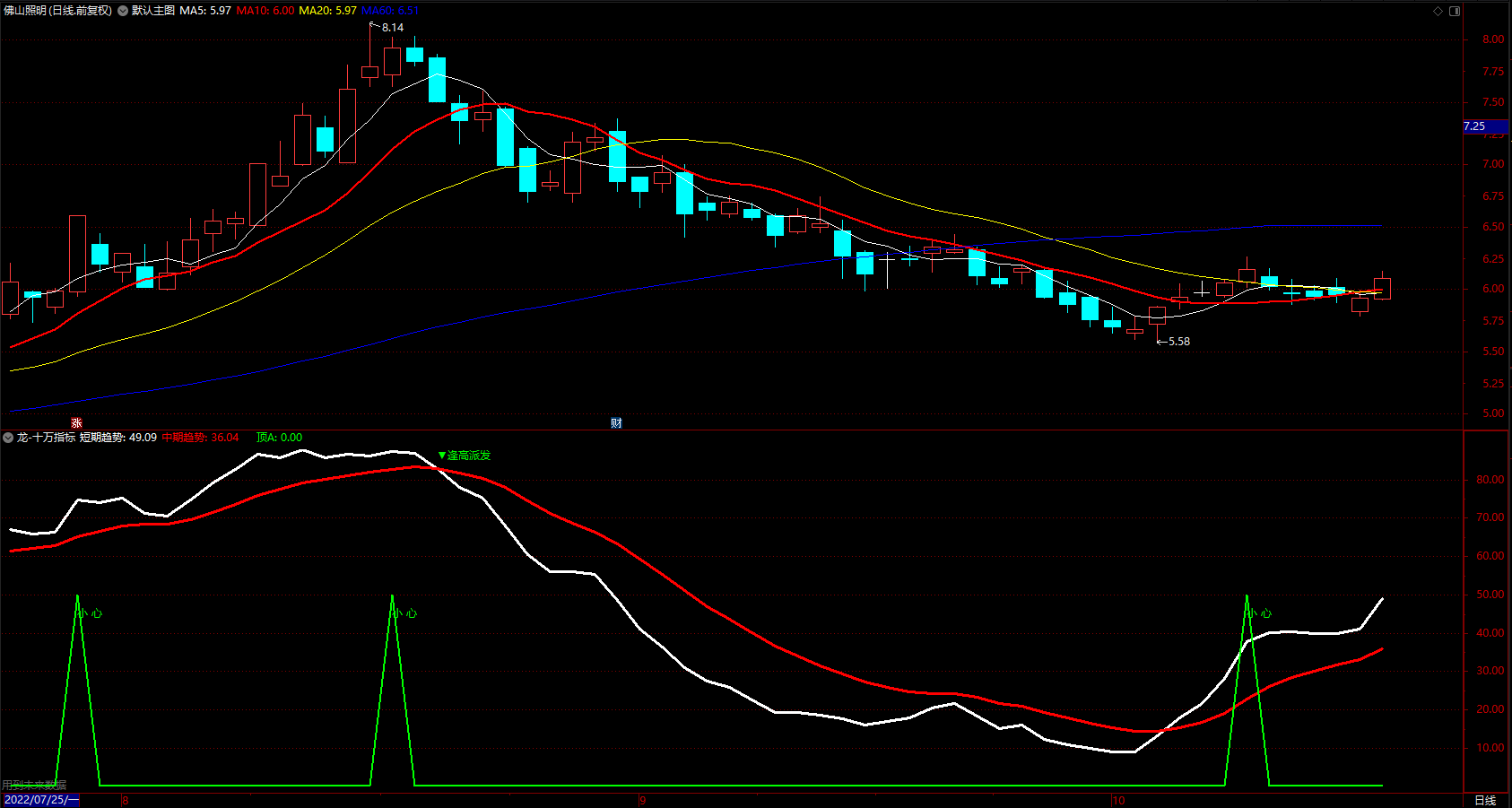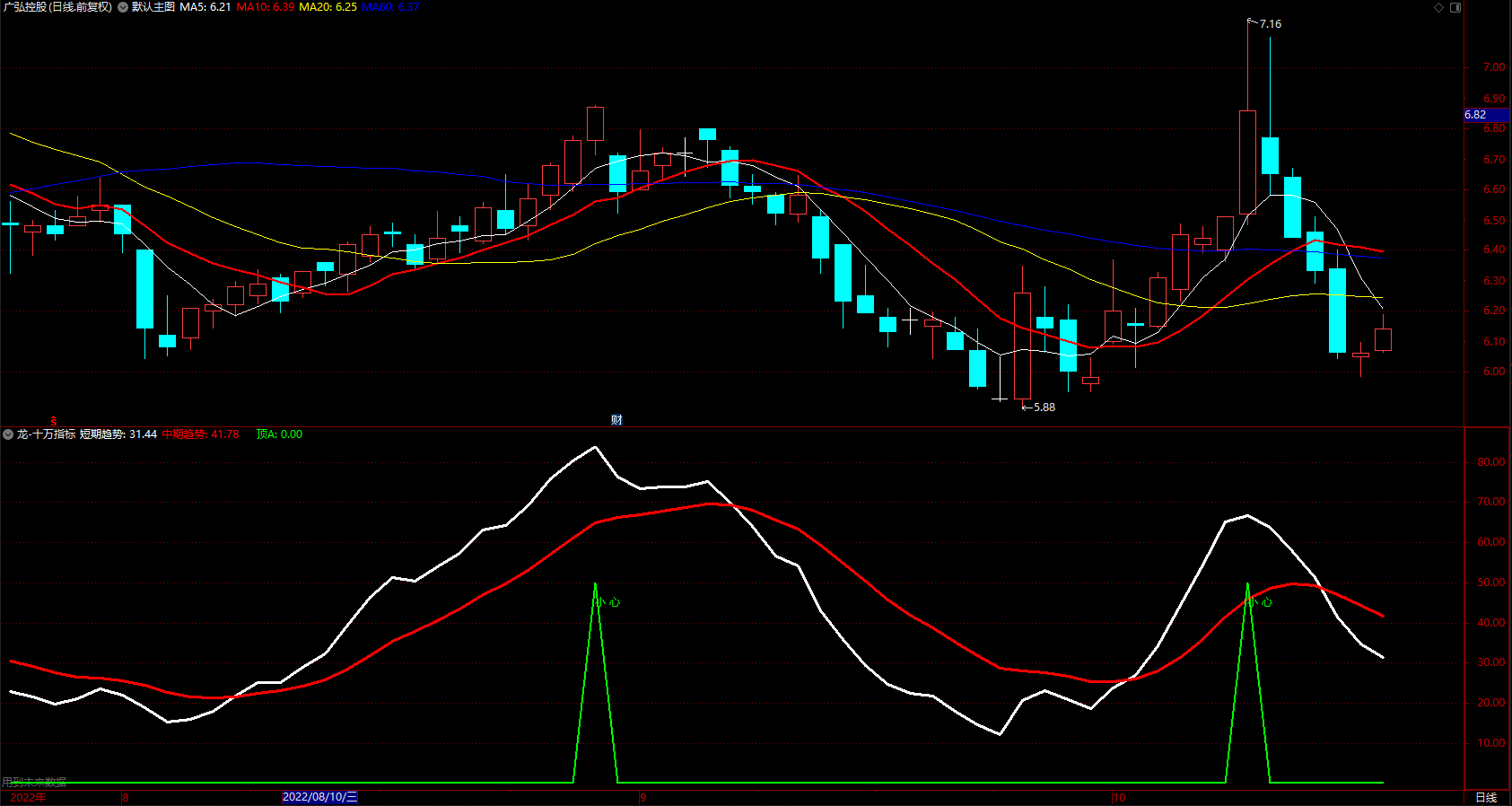 ▲抄底: DRAWTEXT(REF(CROSS(短期趋势,中期趋势),1) AND 短期趋势>1.3*中期趋势,中期趋势,'▲抄底'),COLORBLUE,LINETHICK1;