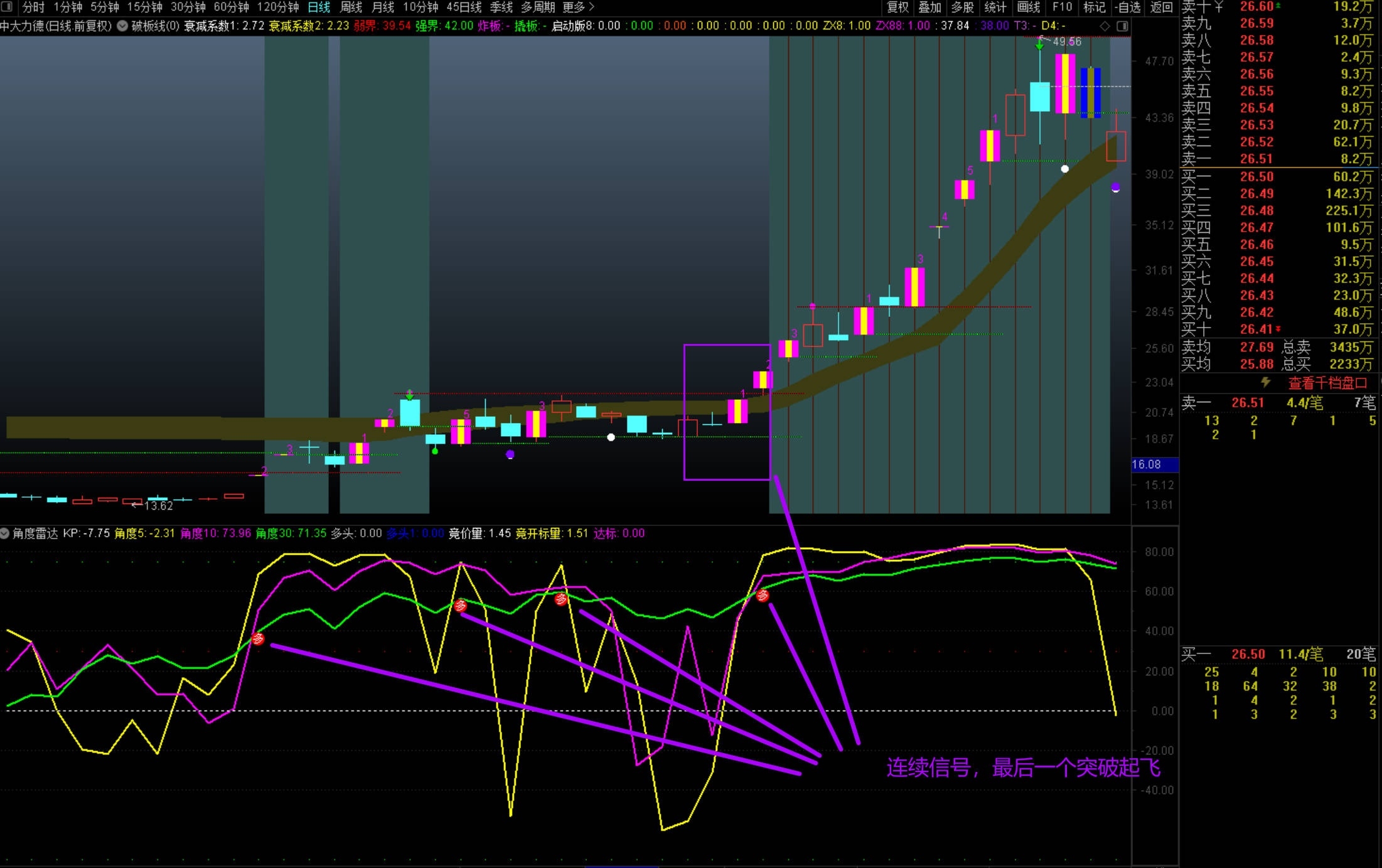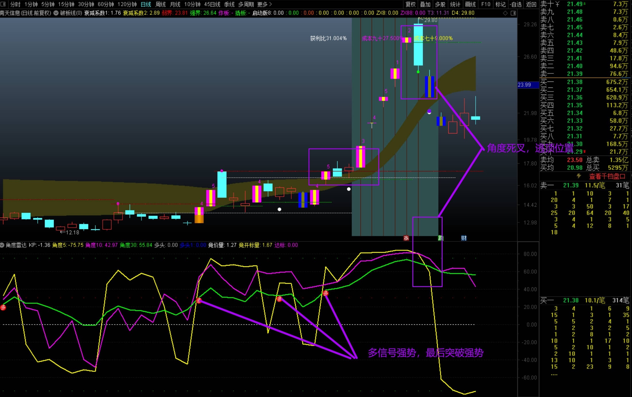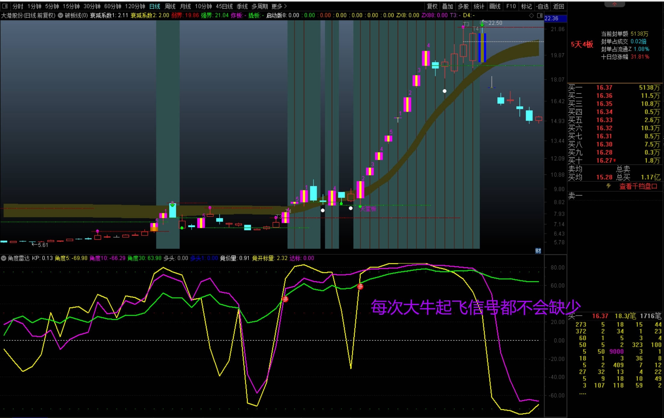 (通达信【角度雷达寻牛】副图选股指标,实战验证,选股排序都可用,近期实战捕获的股票南天信息也挺强势!)