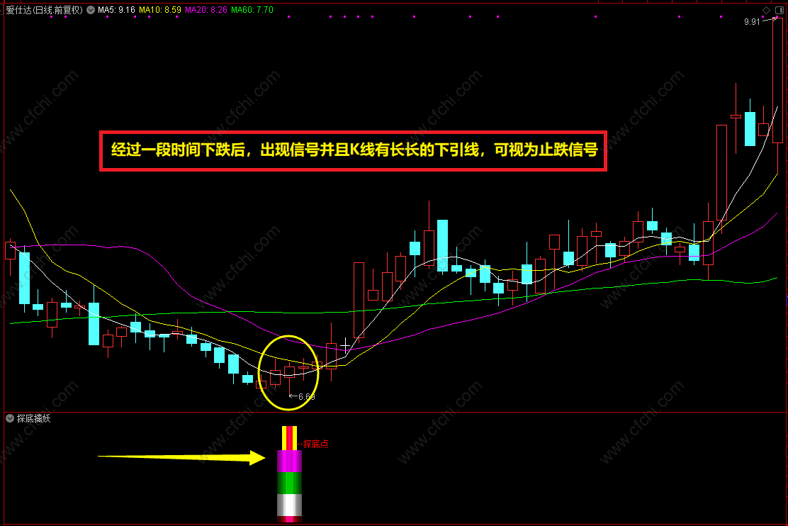 经过一段时间下跌后,重新探低点信号并且K线有长长的下引线,可视为止跌信号;